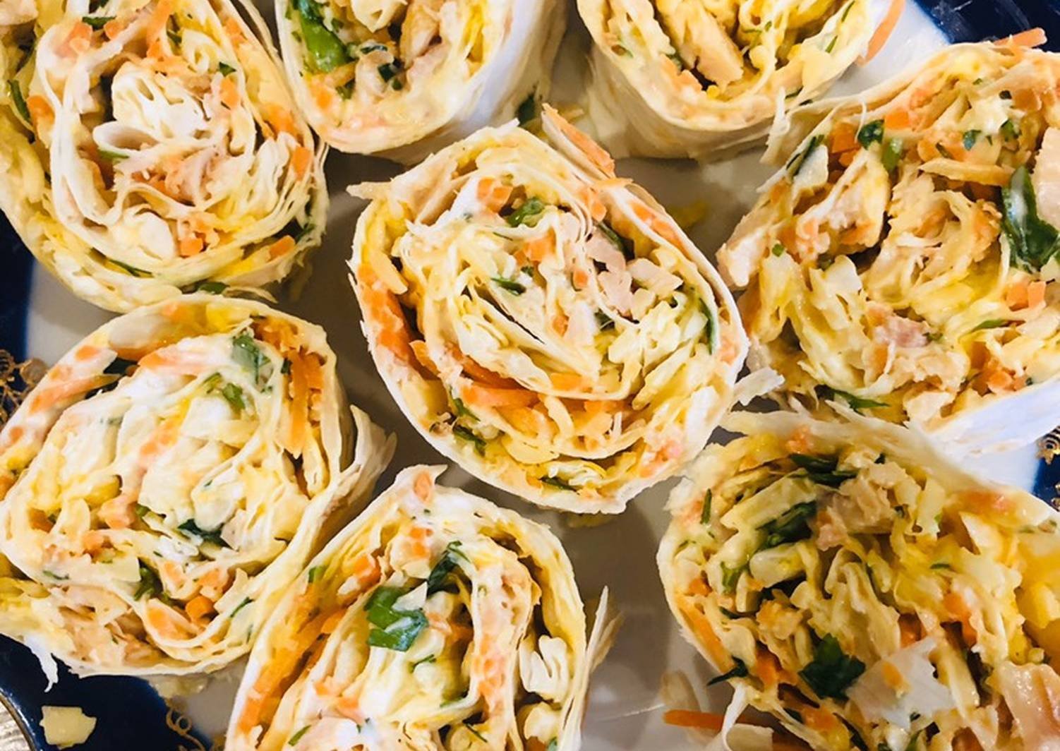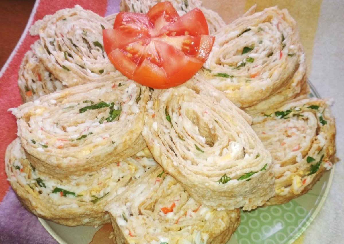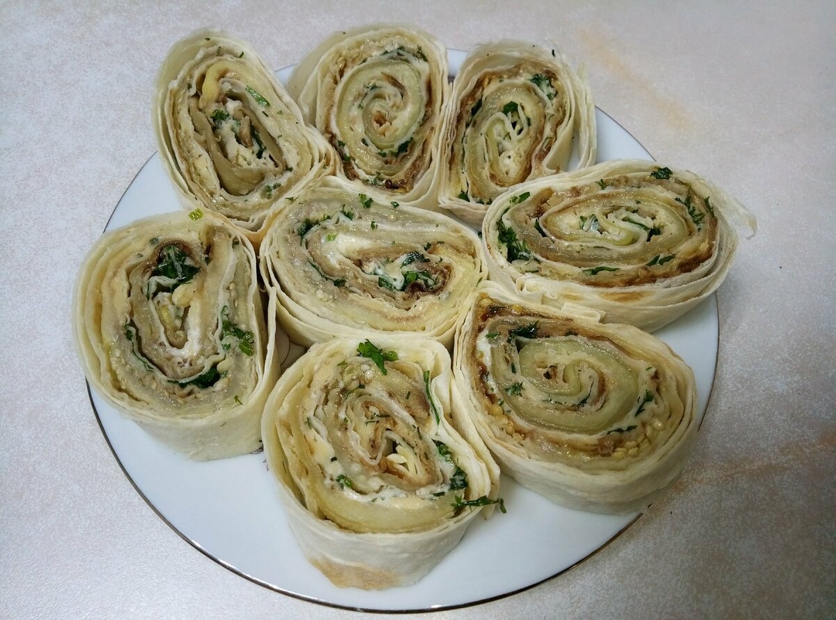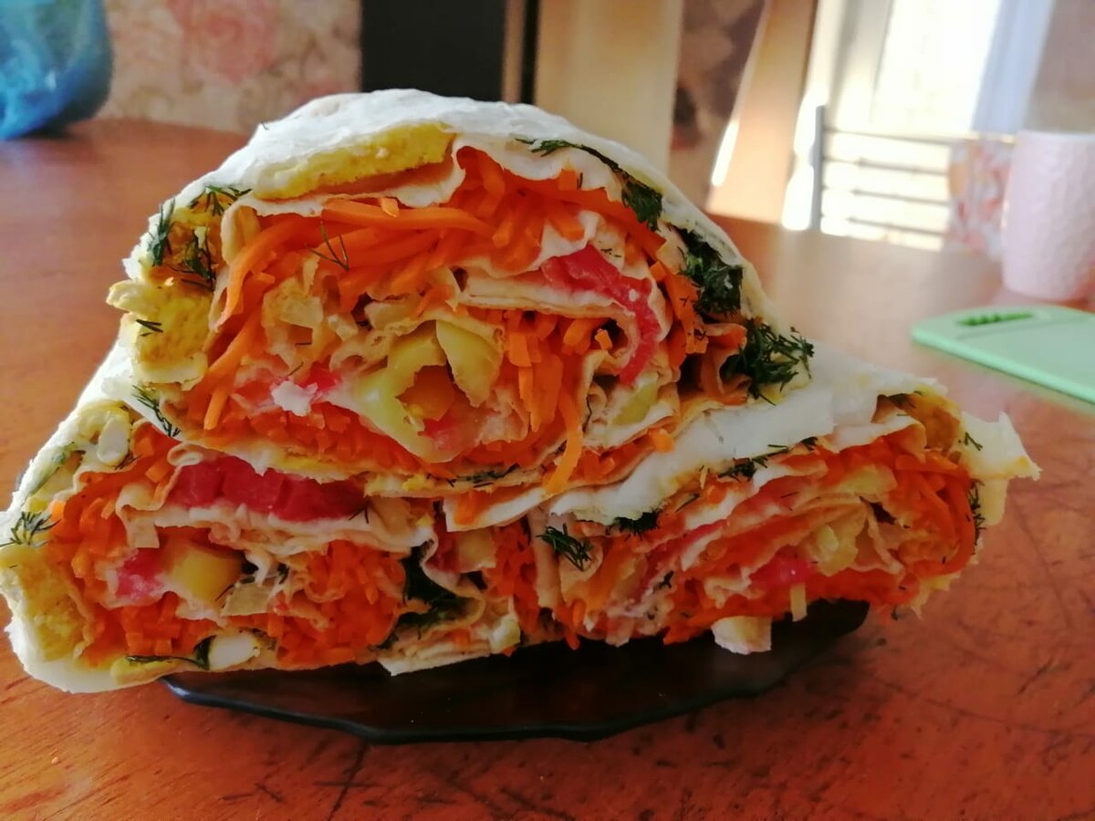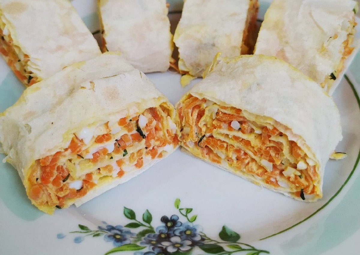 Рулет из лаваша, кинзы, яйца, корейской морковки