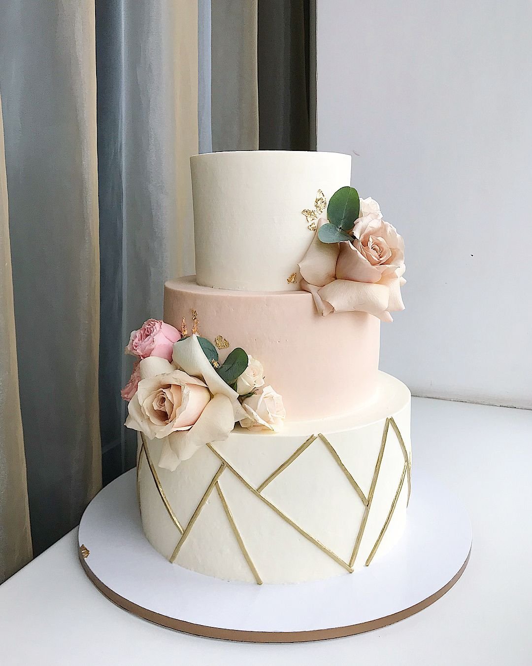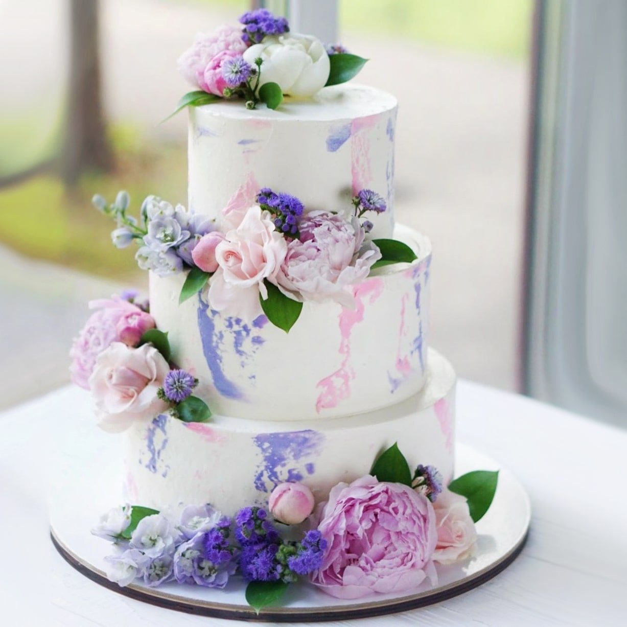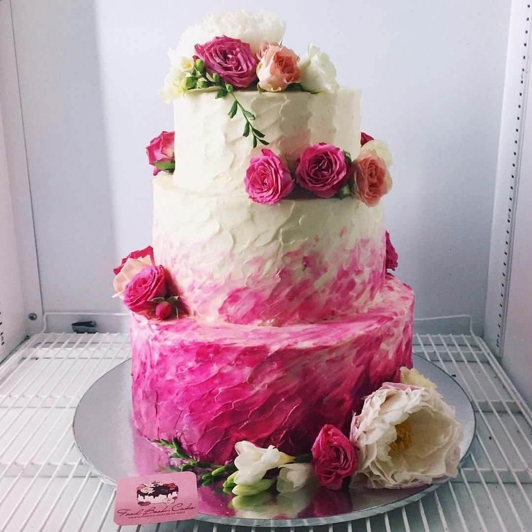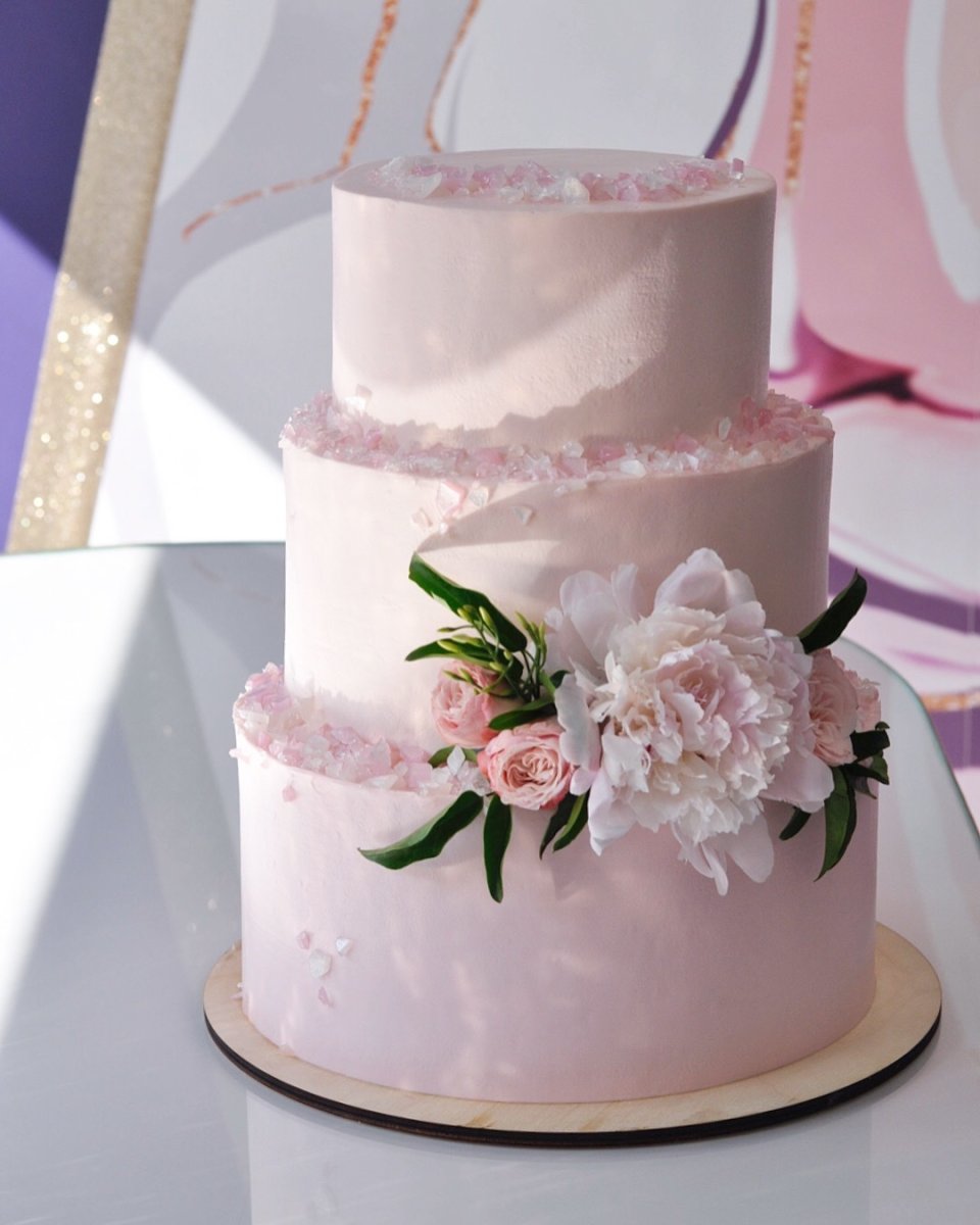 Свадебный торт трехъярусный белый с розовыми мазками