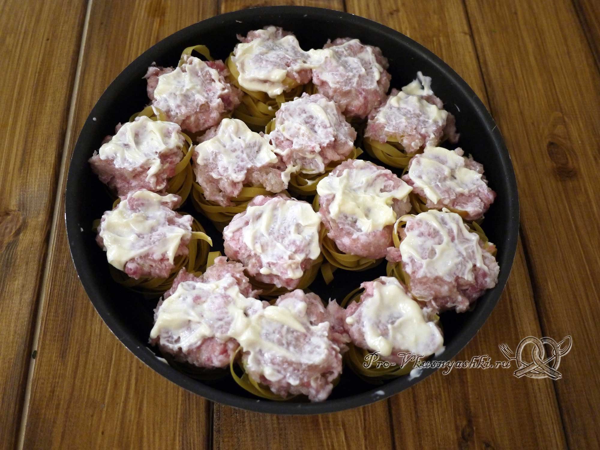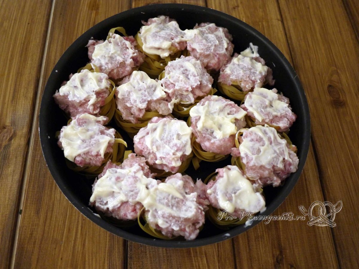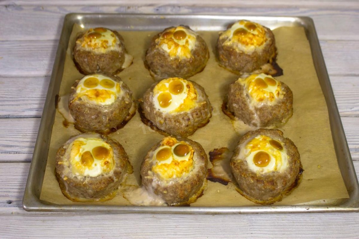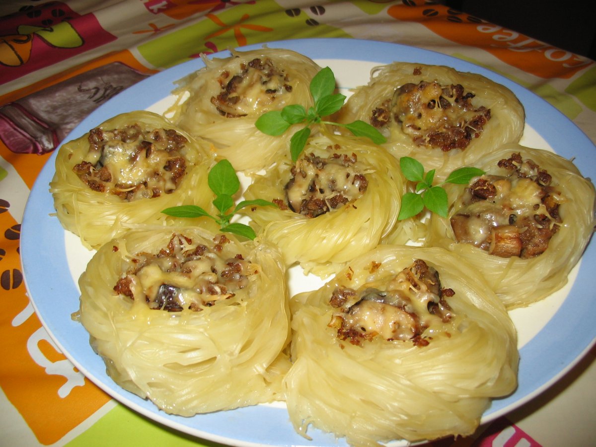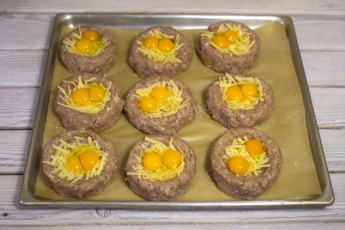 Гнёзда с фаршем в духовке и перепелиными яйцами