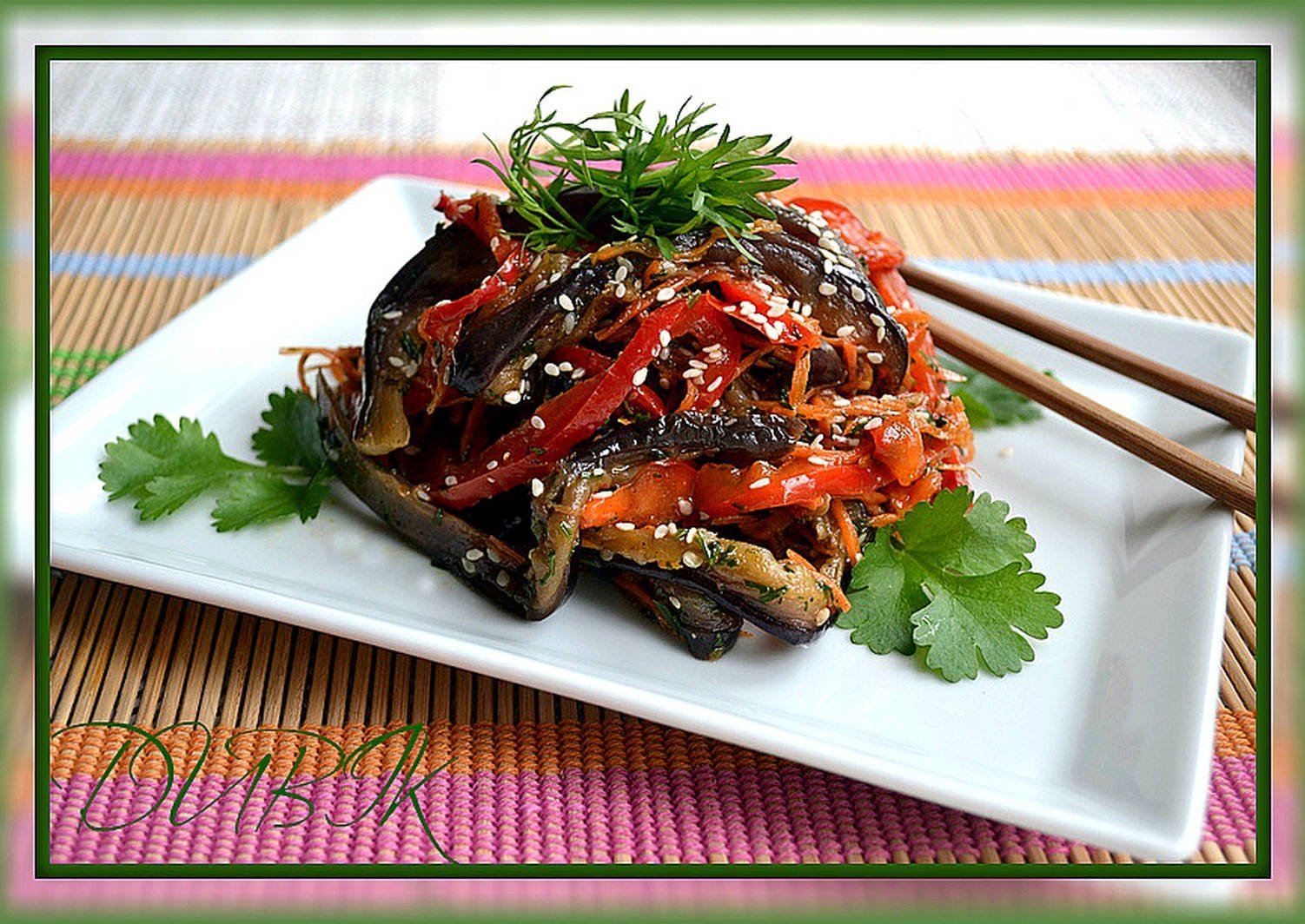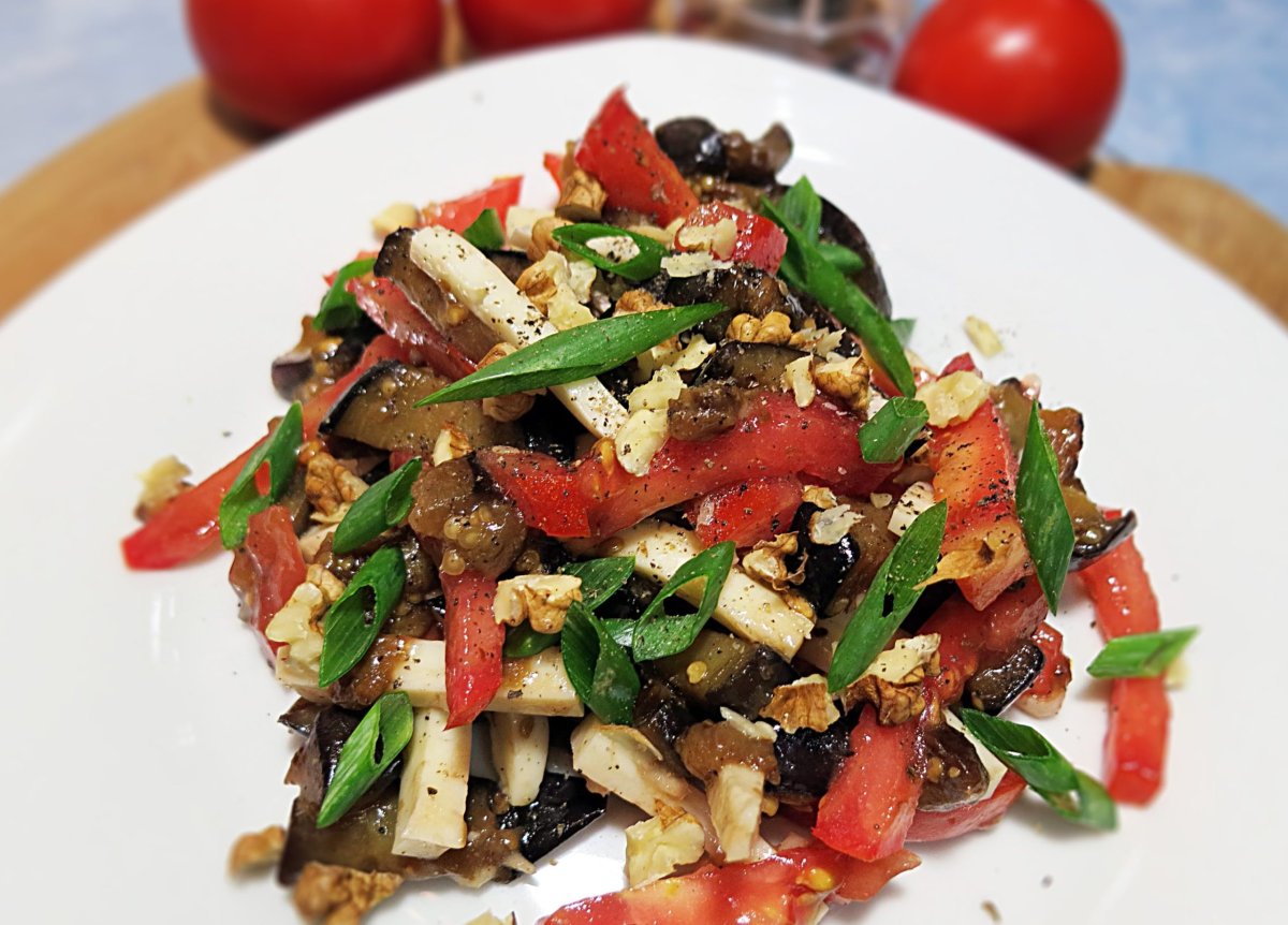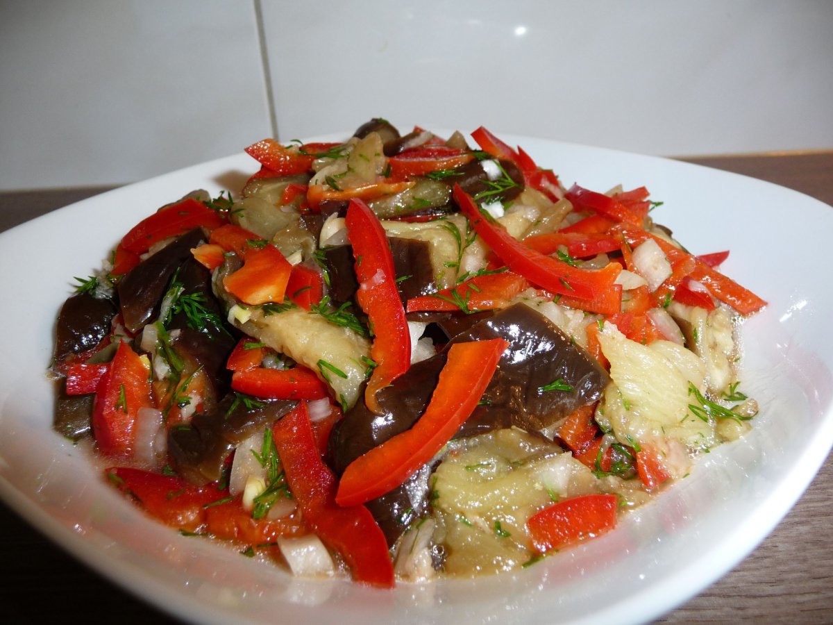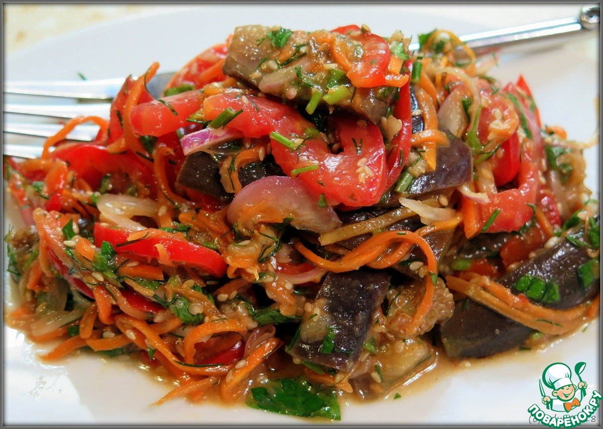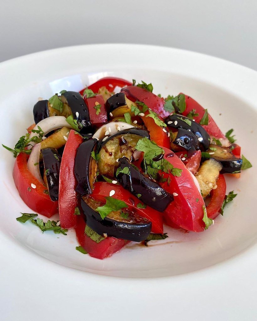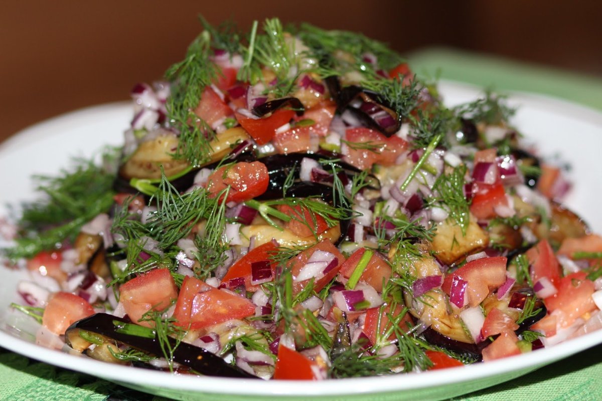 Салат «из баклажан» (баклажаны, помидоры, чеснок, масло, соевый соус)