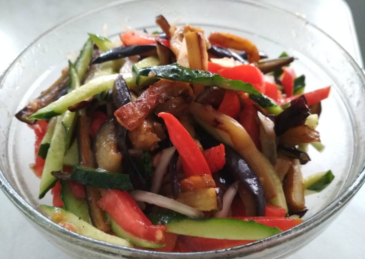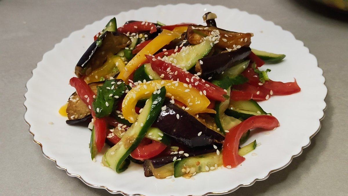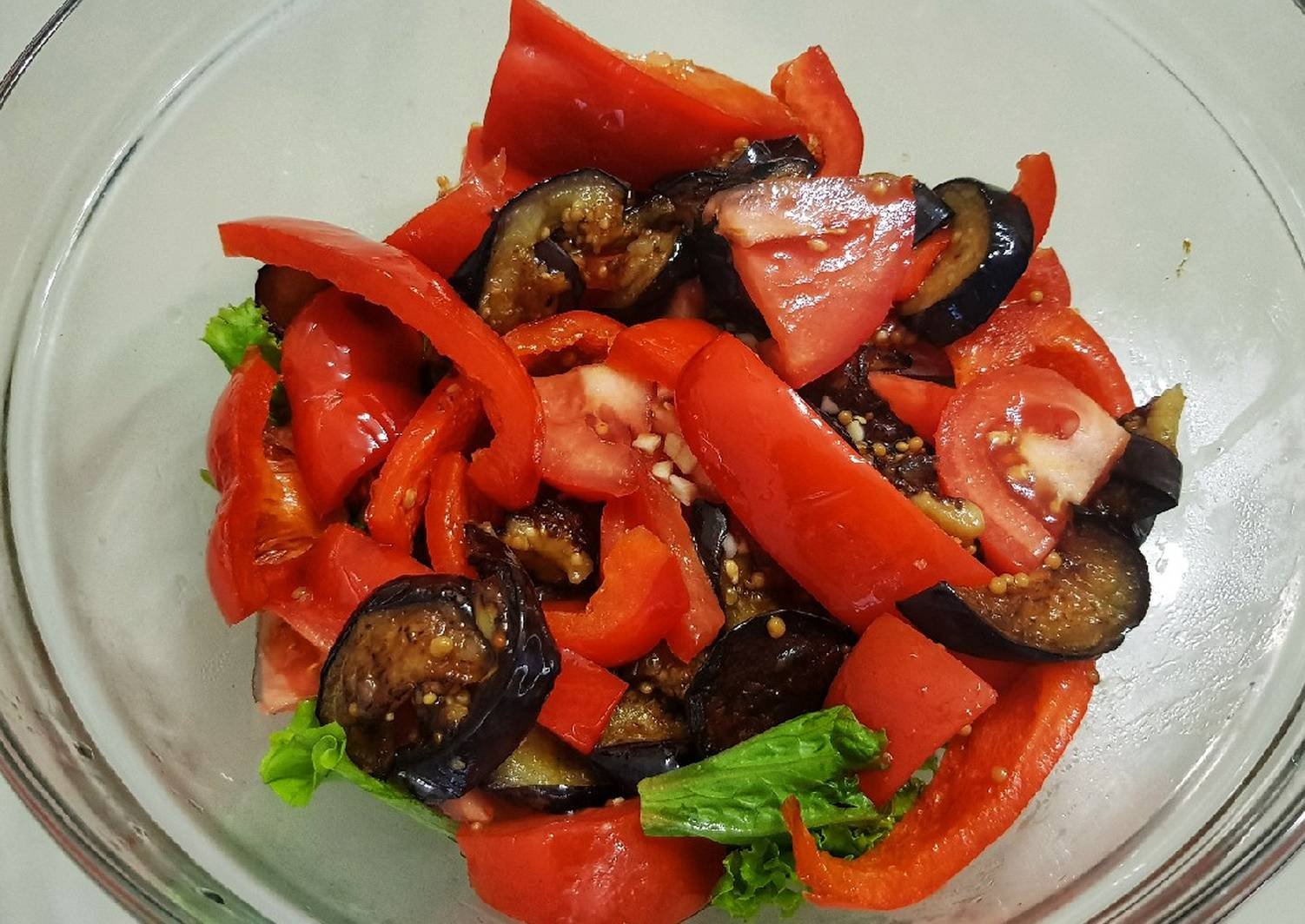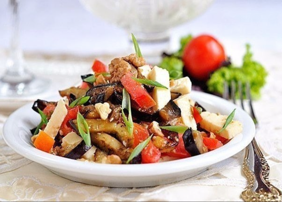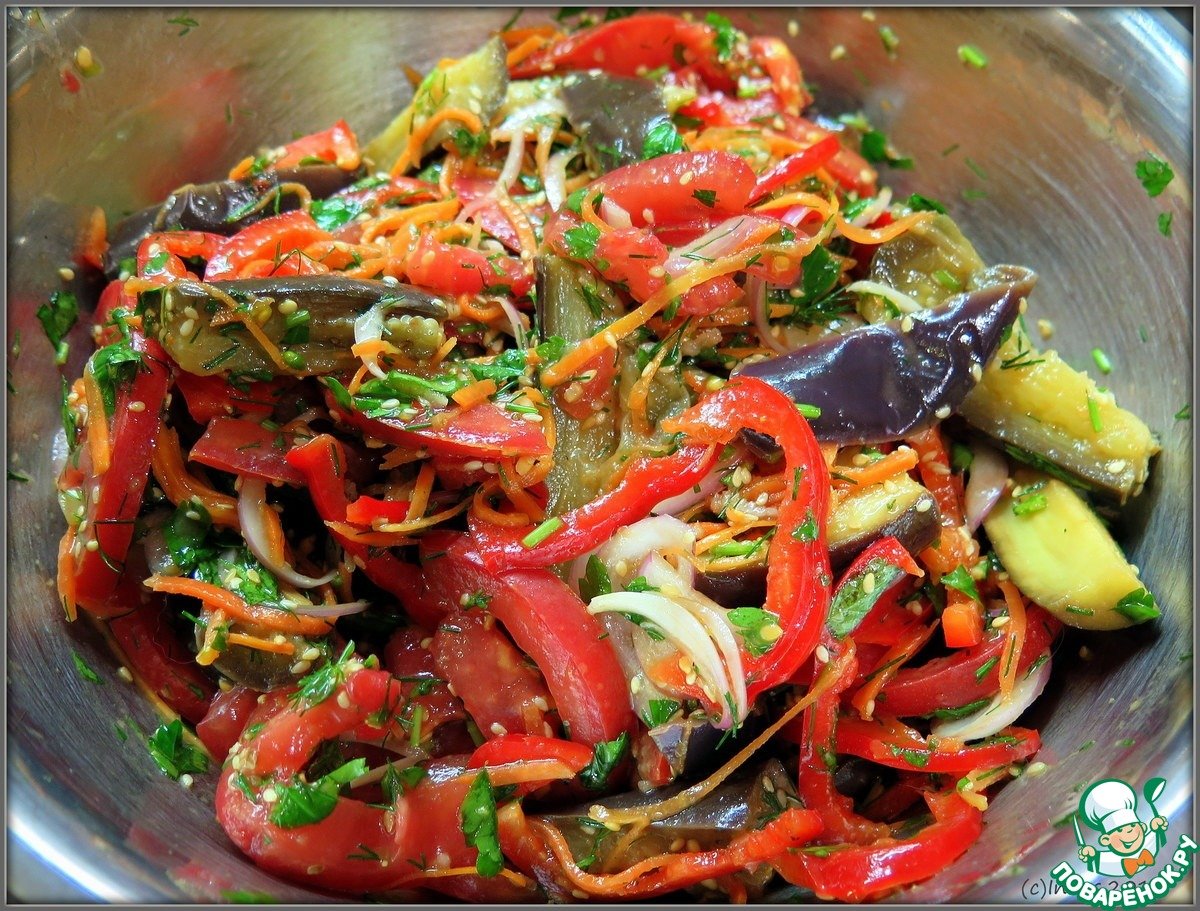 Салат «из баклажан» (баклажаны, помидоры, чеснок, масло, соевый соус)