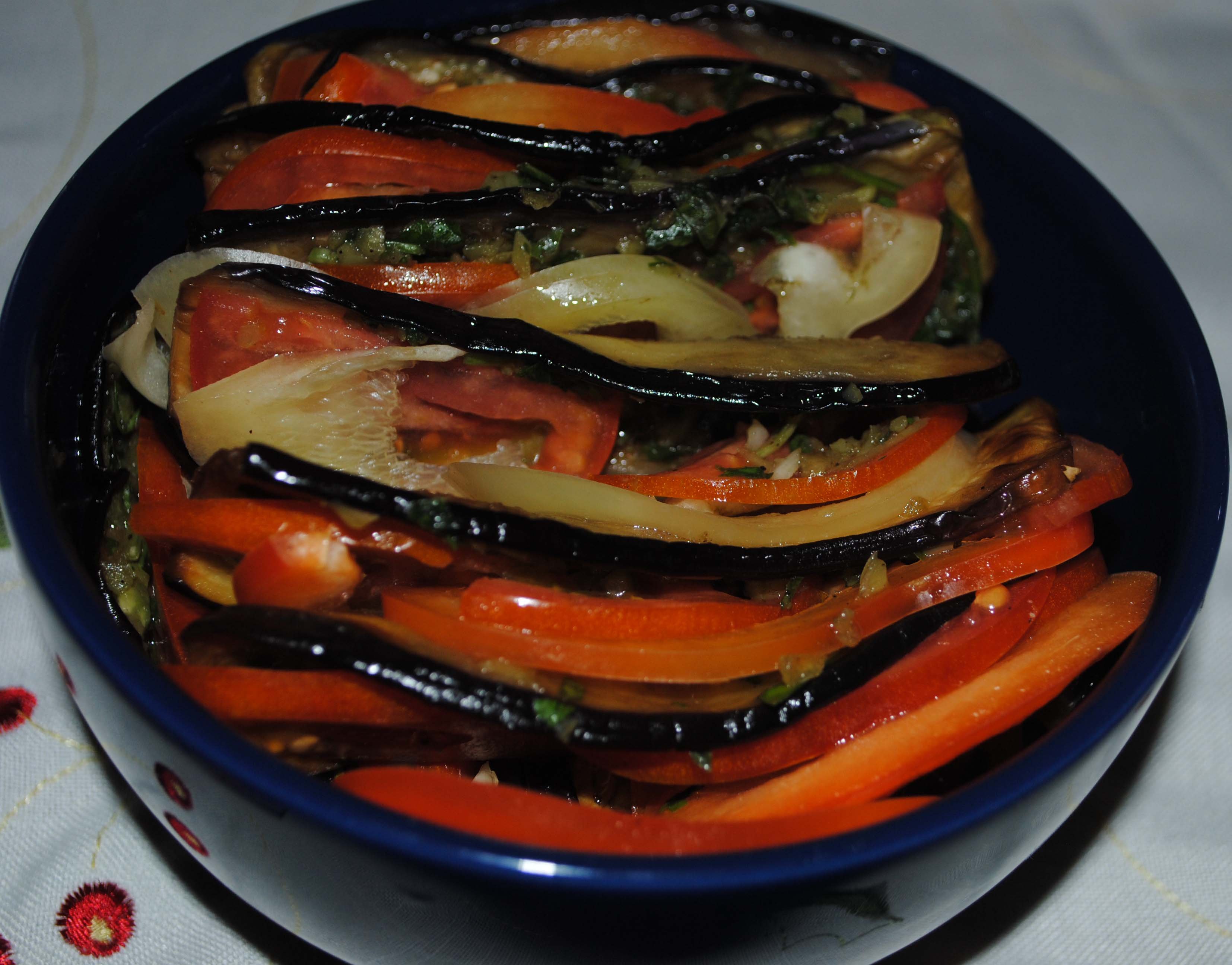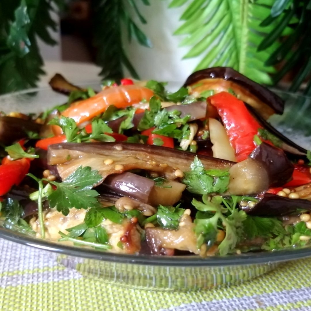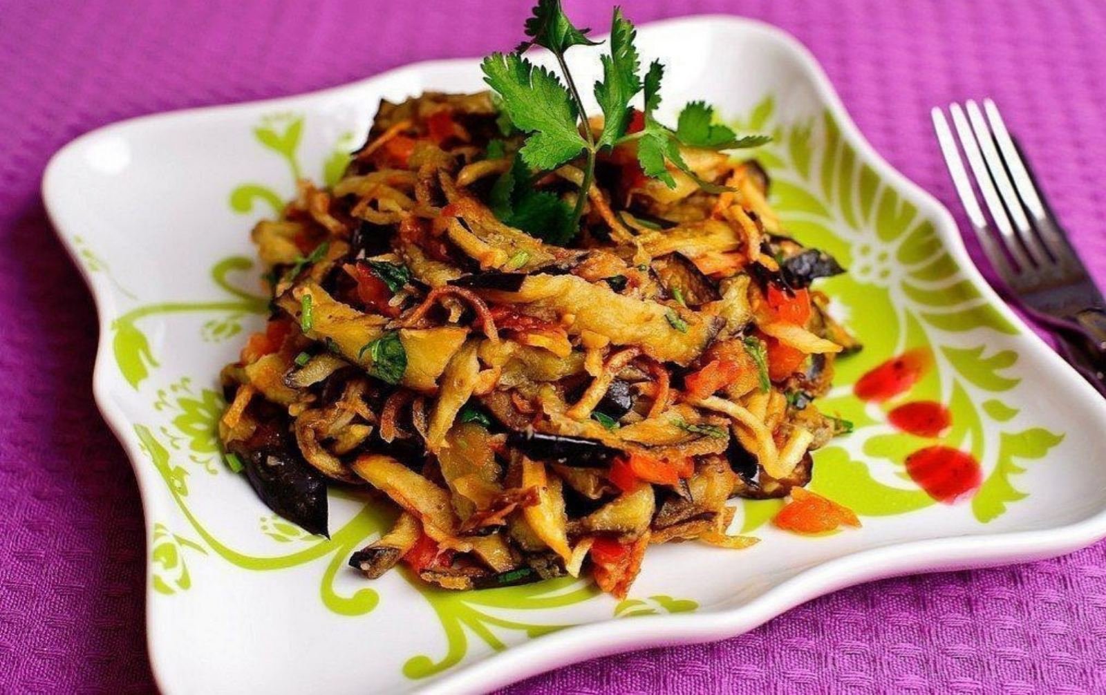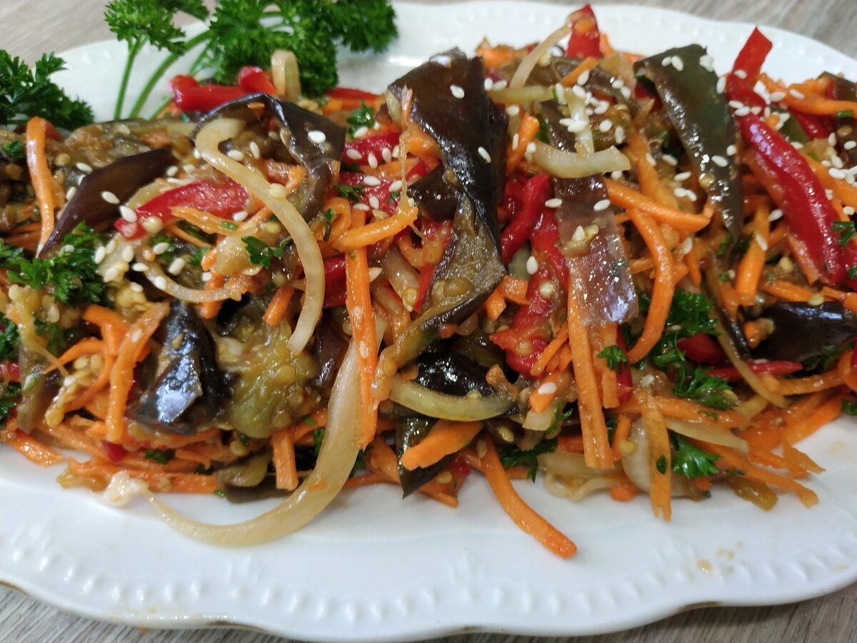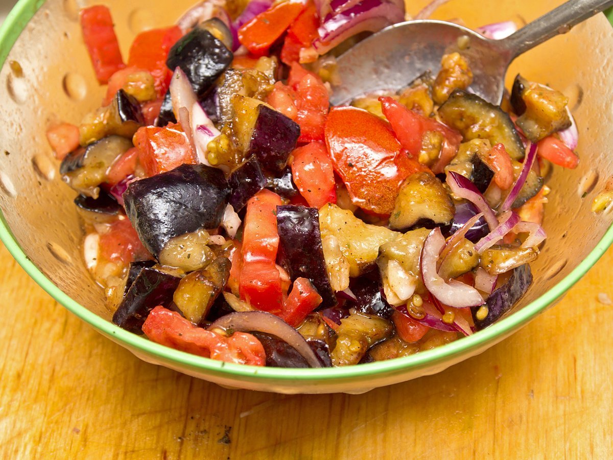 Салат «из баклажан» (баклажаны, помидоры, чеснок, масло, соевый соус)