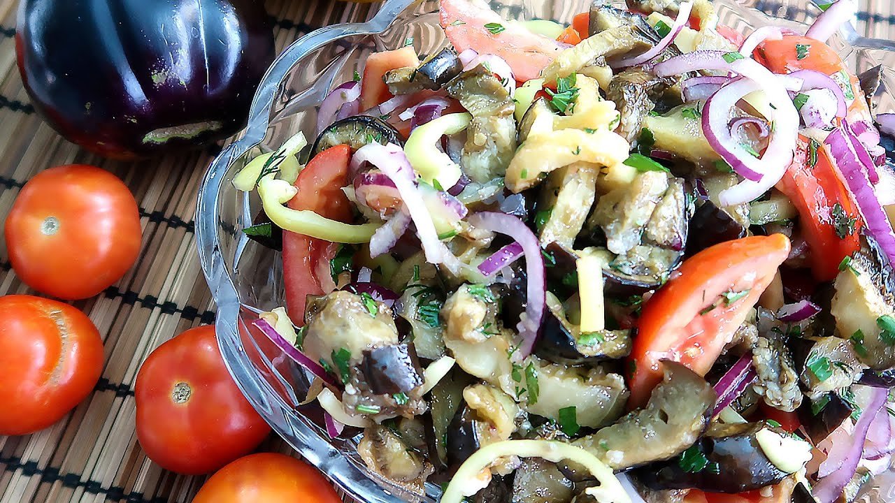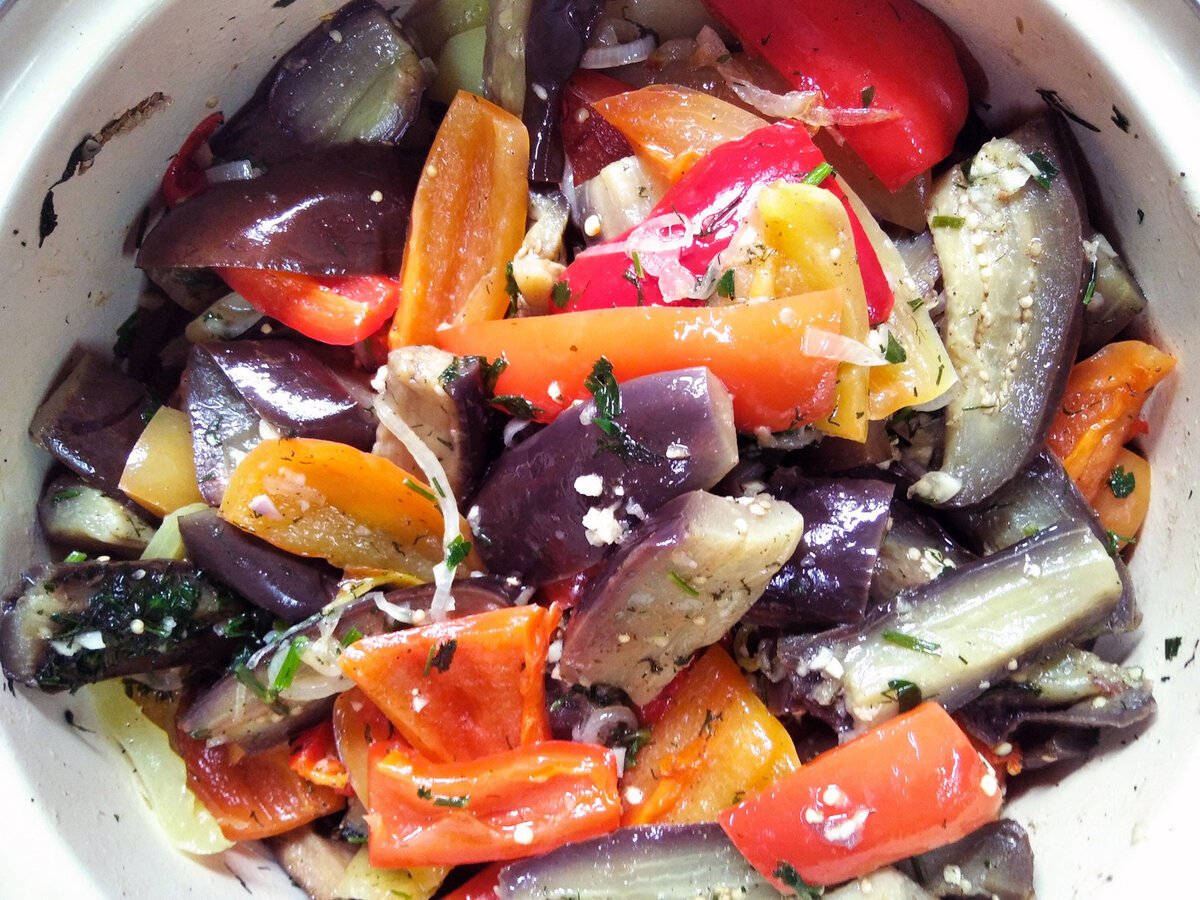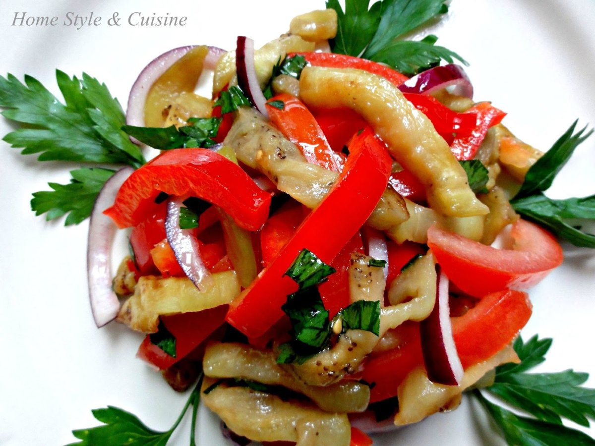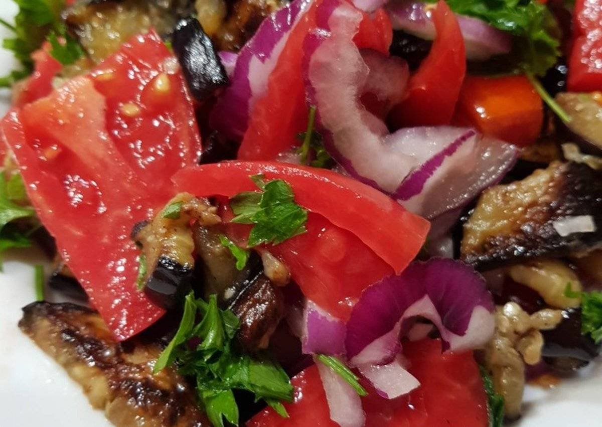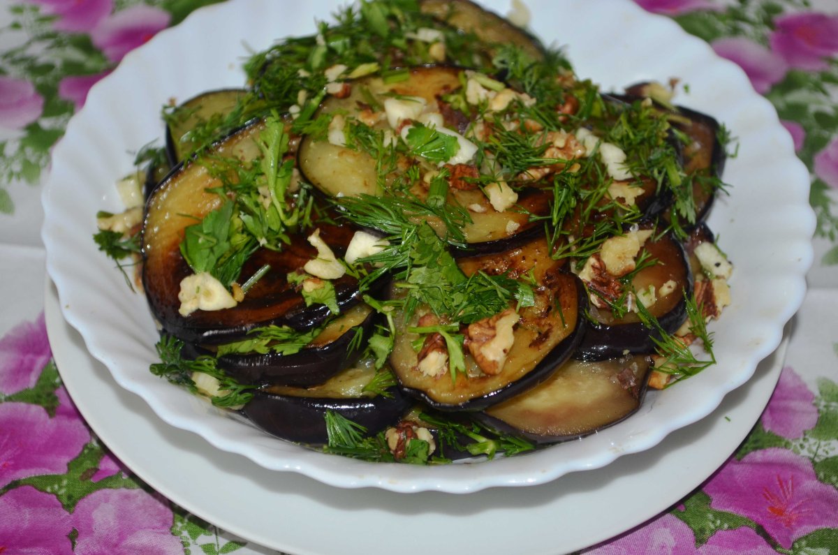Салат «из баклажан» (баклажаны, помидоры, чеснок, масло, соевый соус)