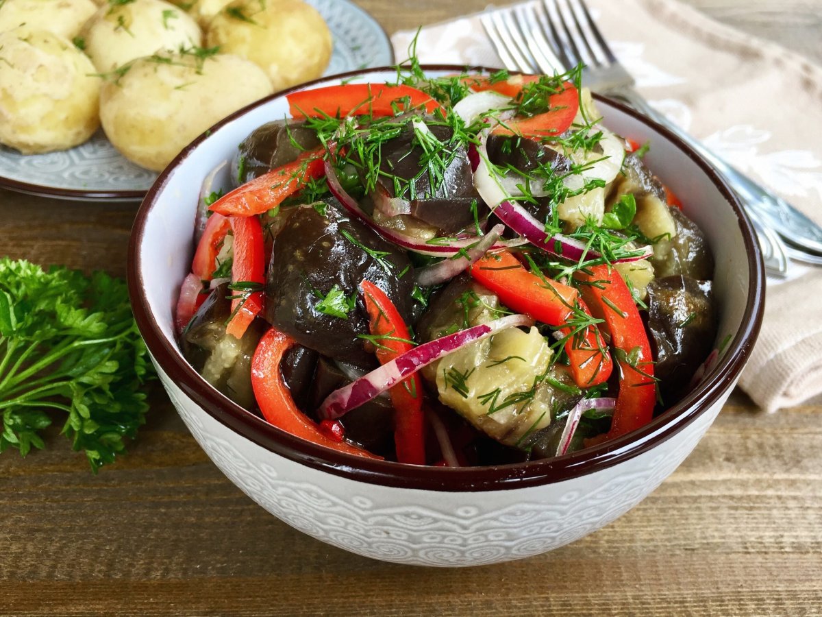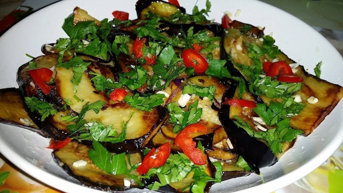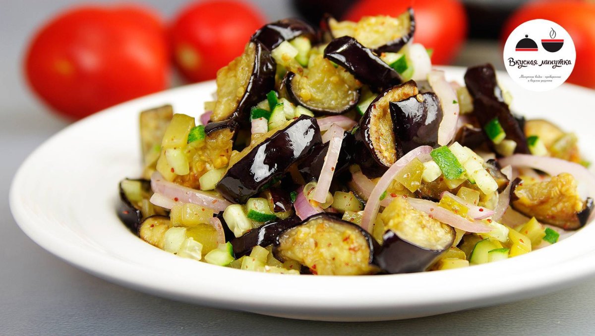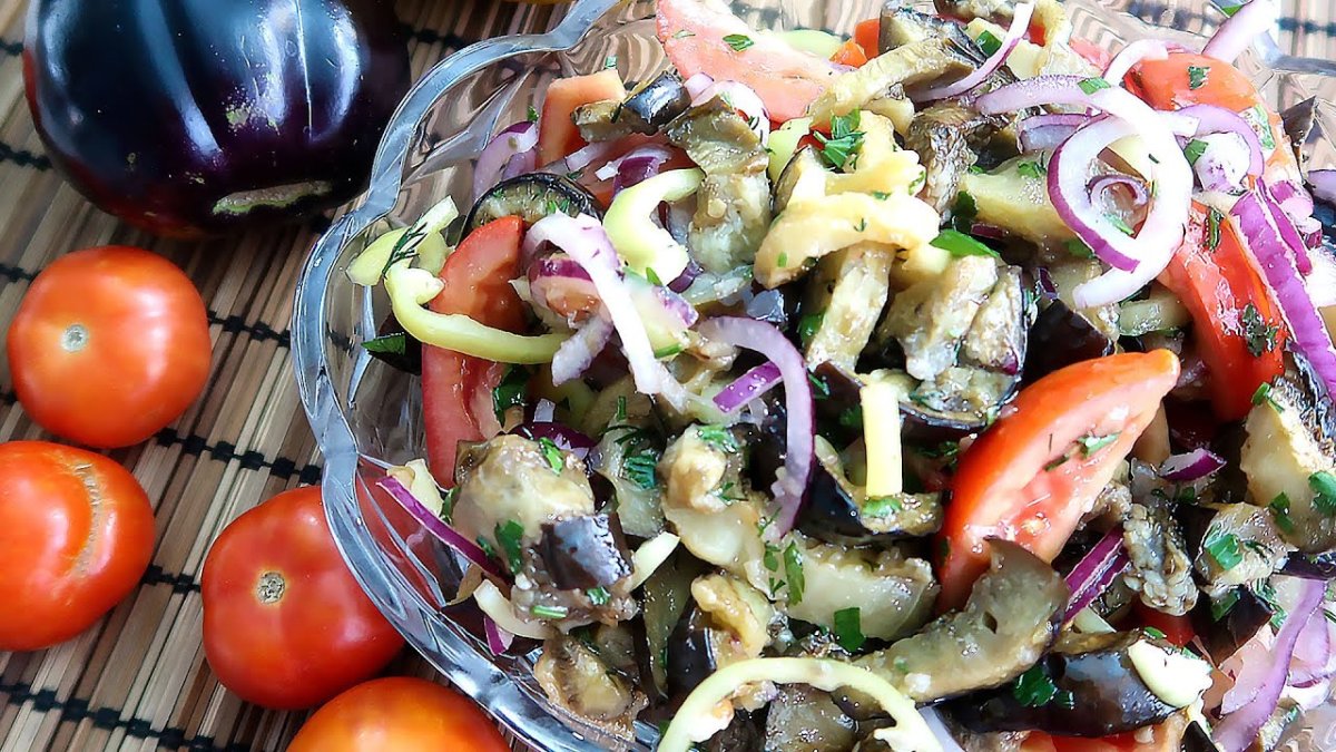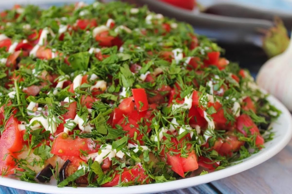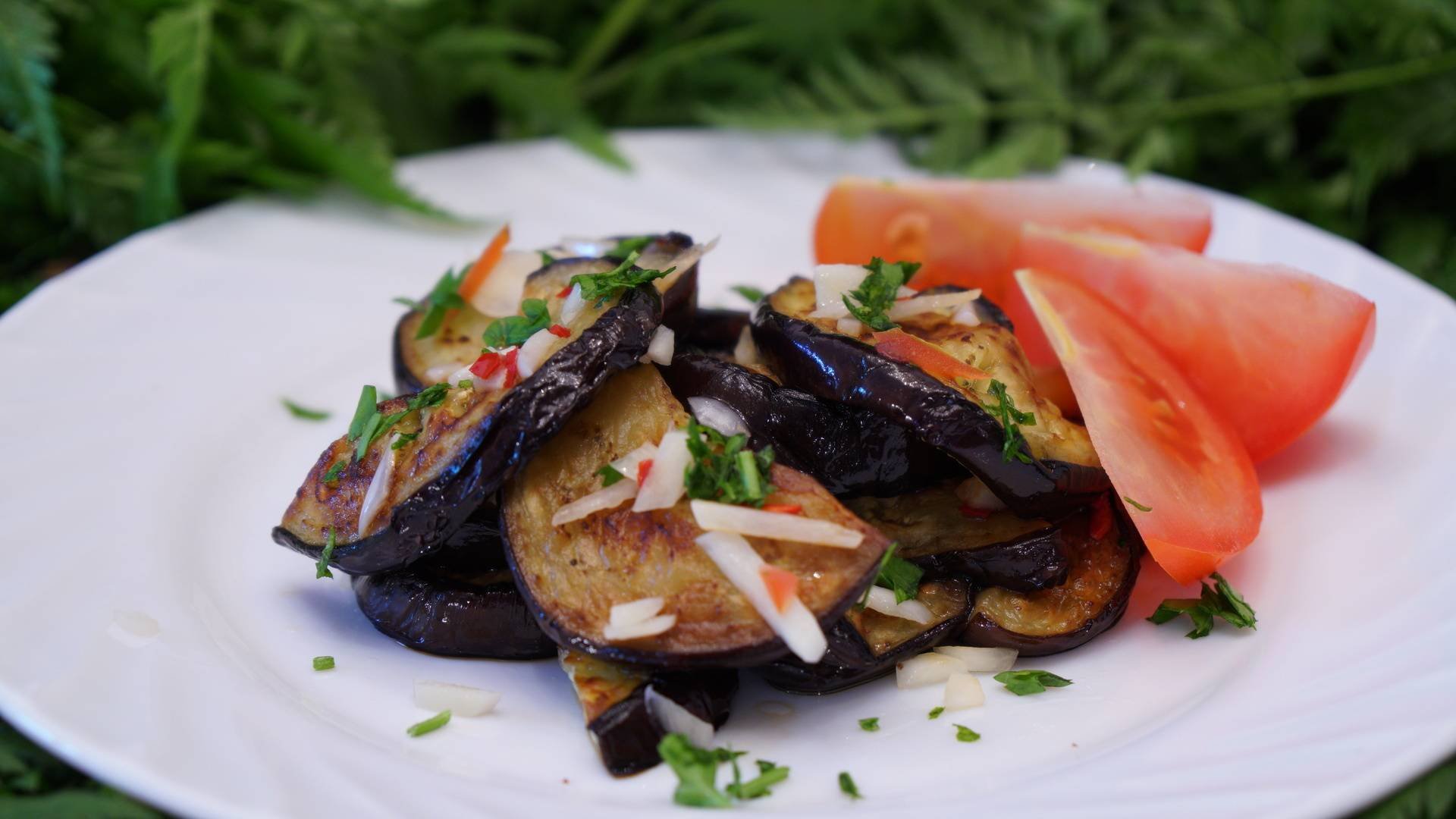 Салат «из баклажан» (баклажаны, помидоры, чеснок, масло, соевый соус)