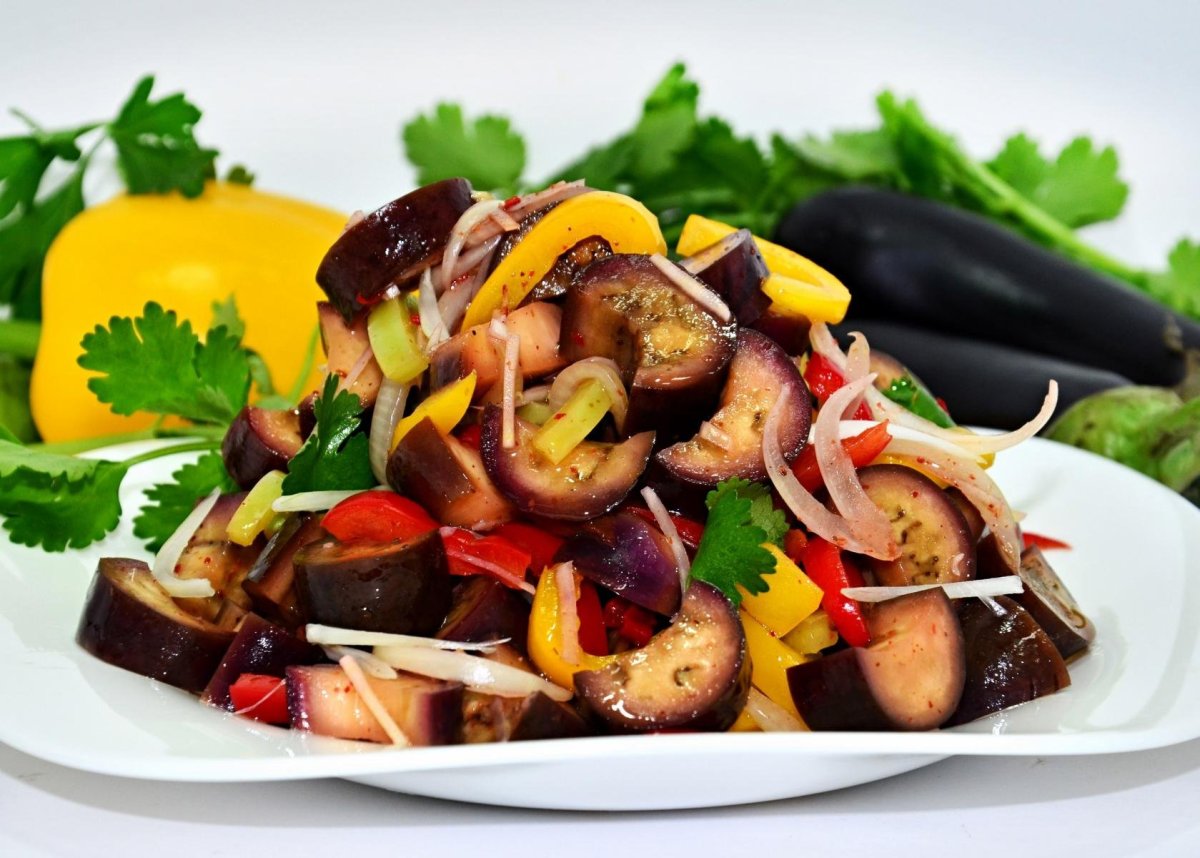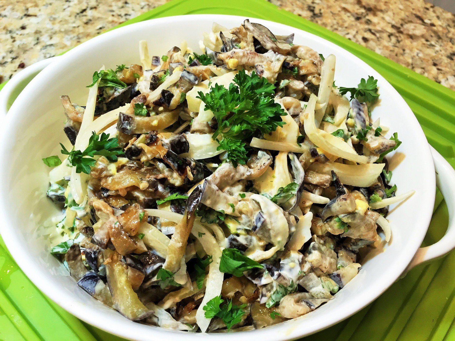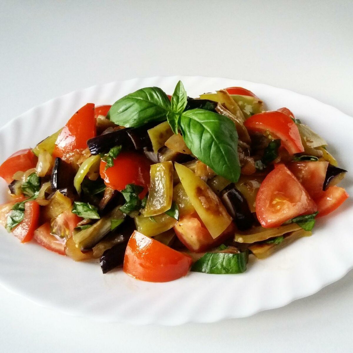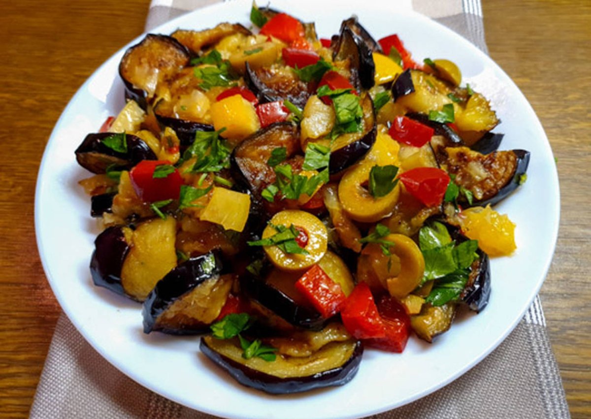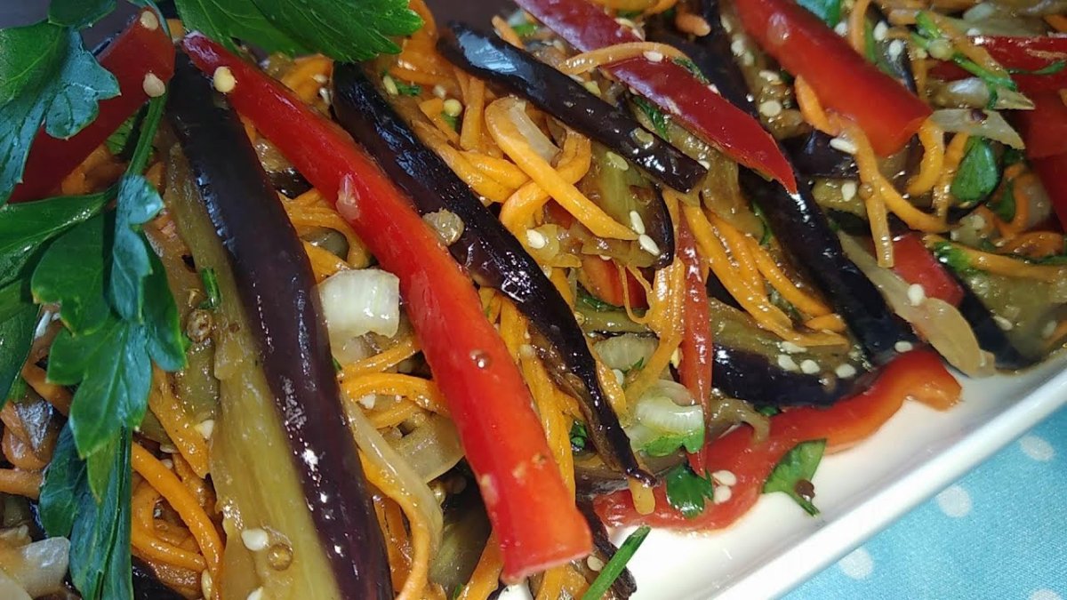 Салат «из баклажан» (баклажаны, помидоры, чеснок, масло, соевый соус)