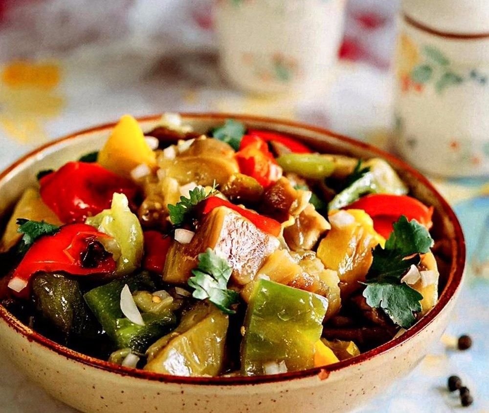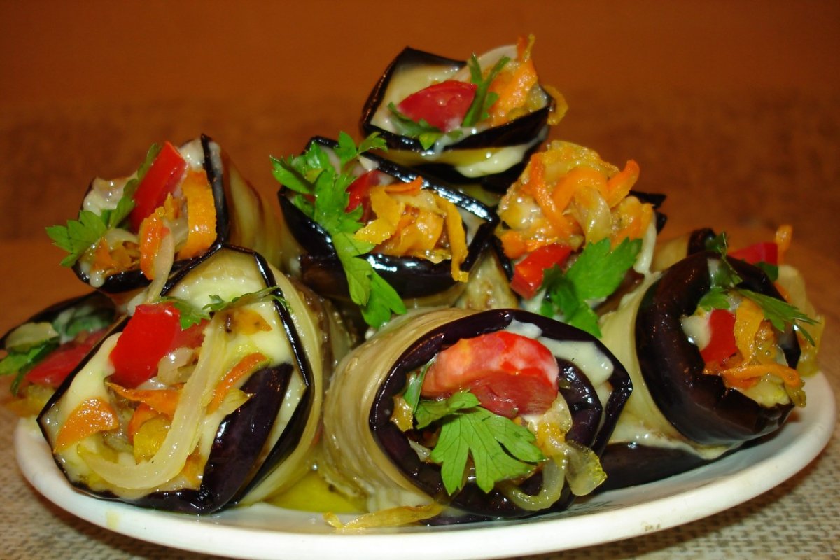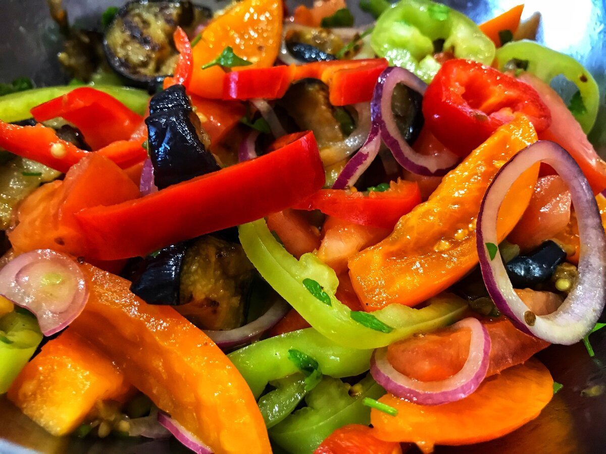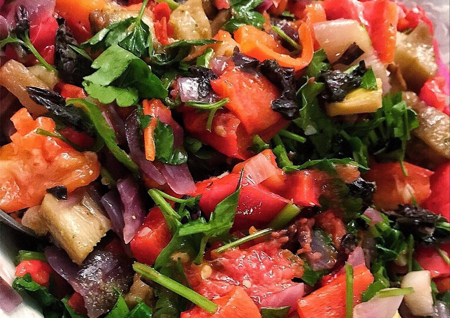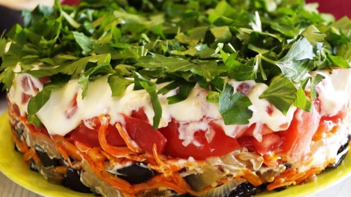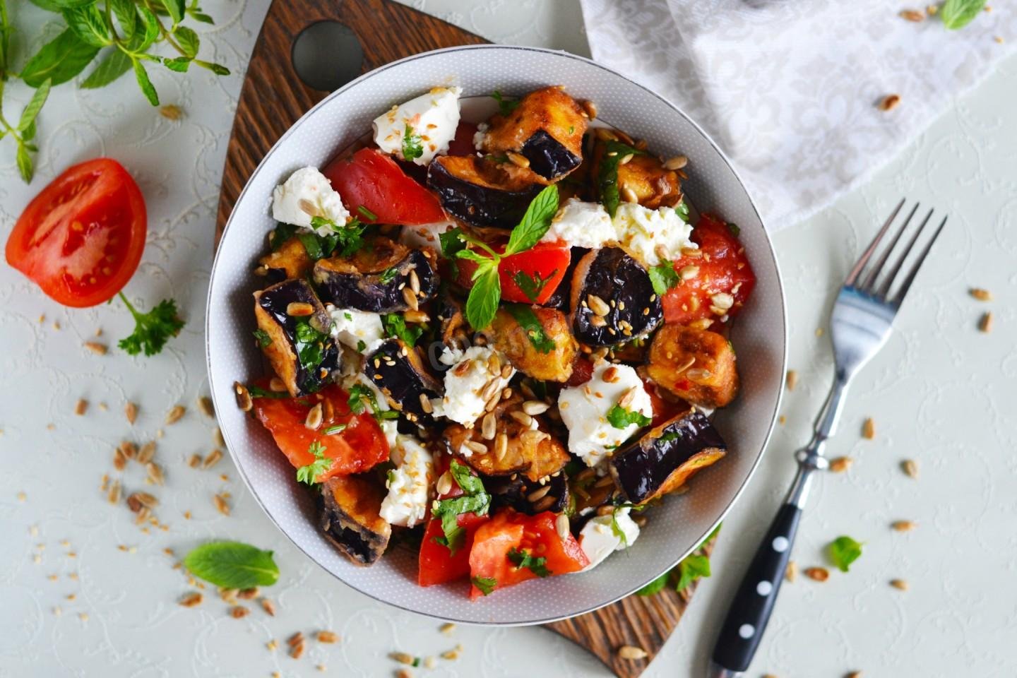 Салат «из баклажан» (баклажаны, помидоры, чеснок, масло, соевый соус)