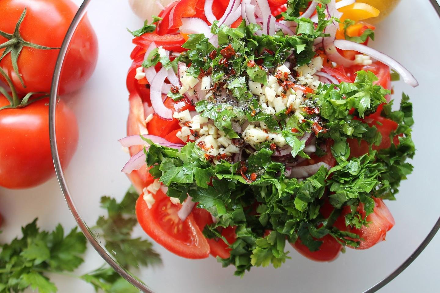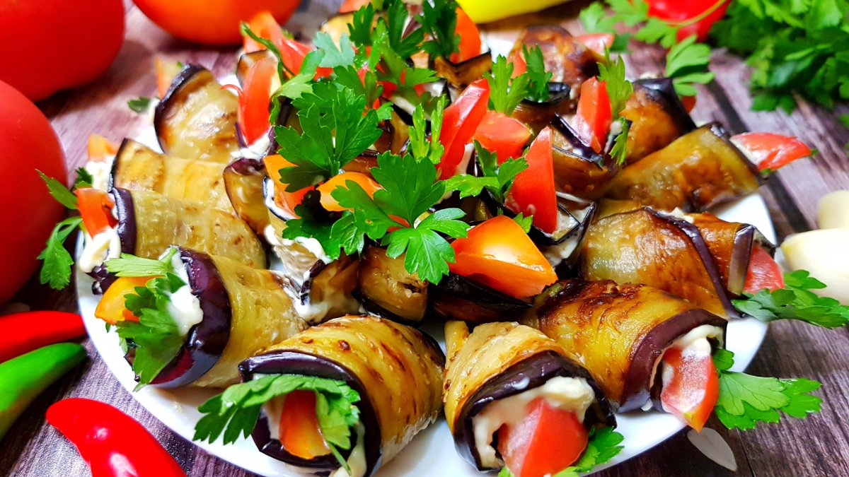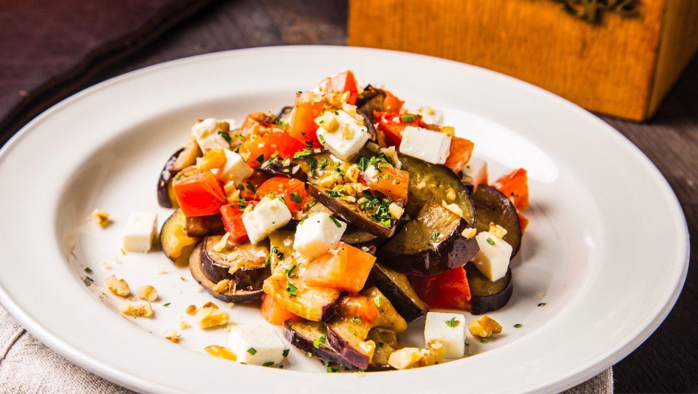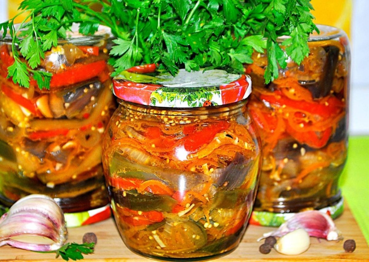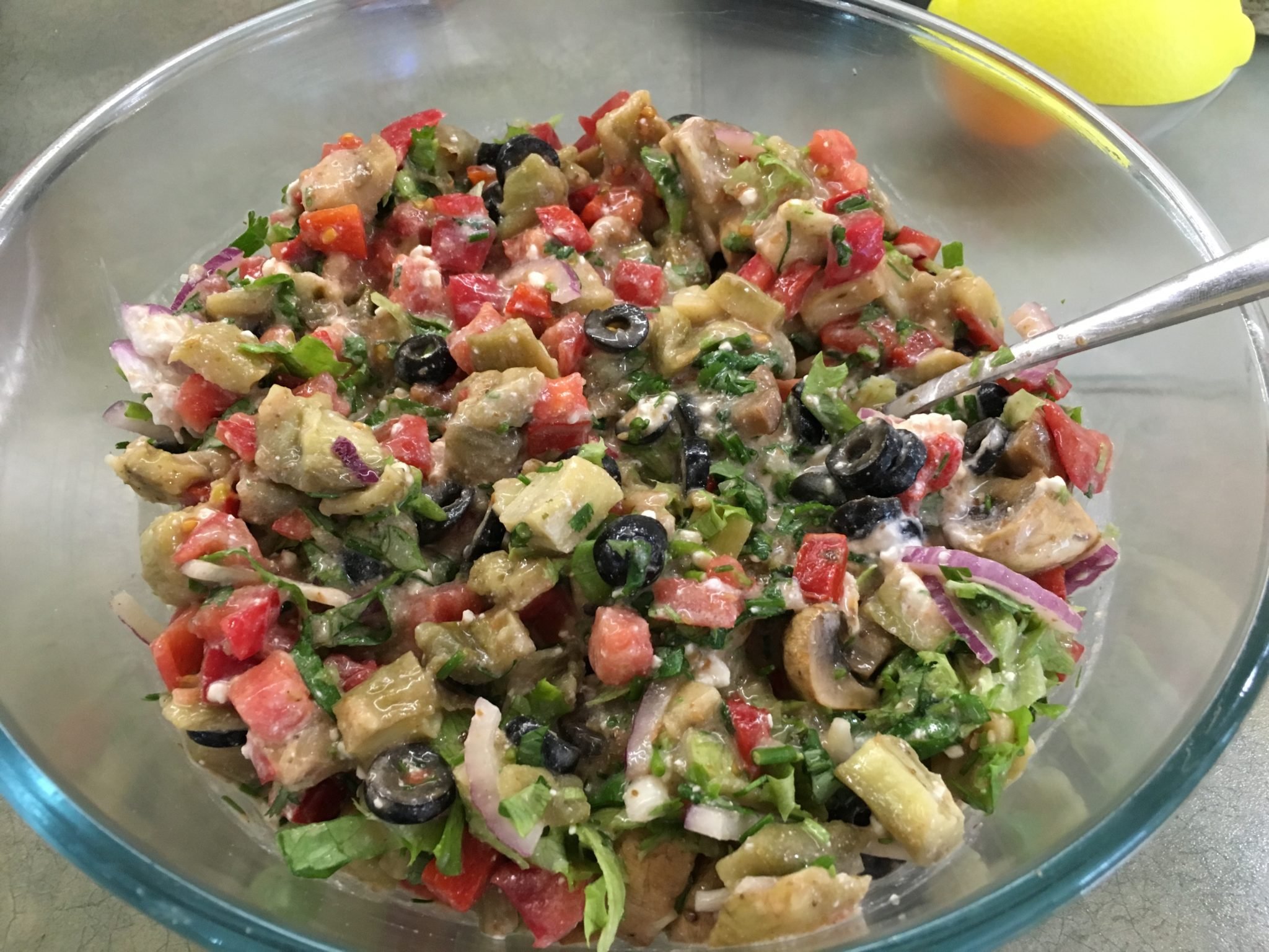 Салат «из баклажан» (баклажаны, помидоры, чеснок, масло, соевый соус)
