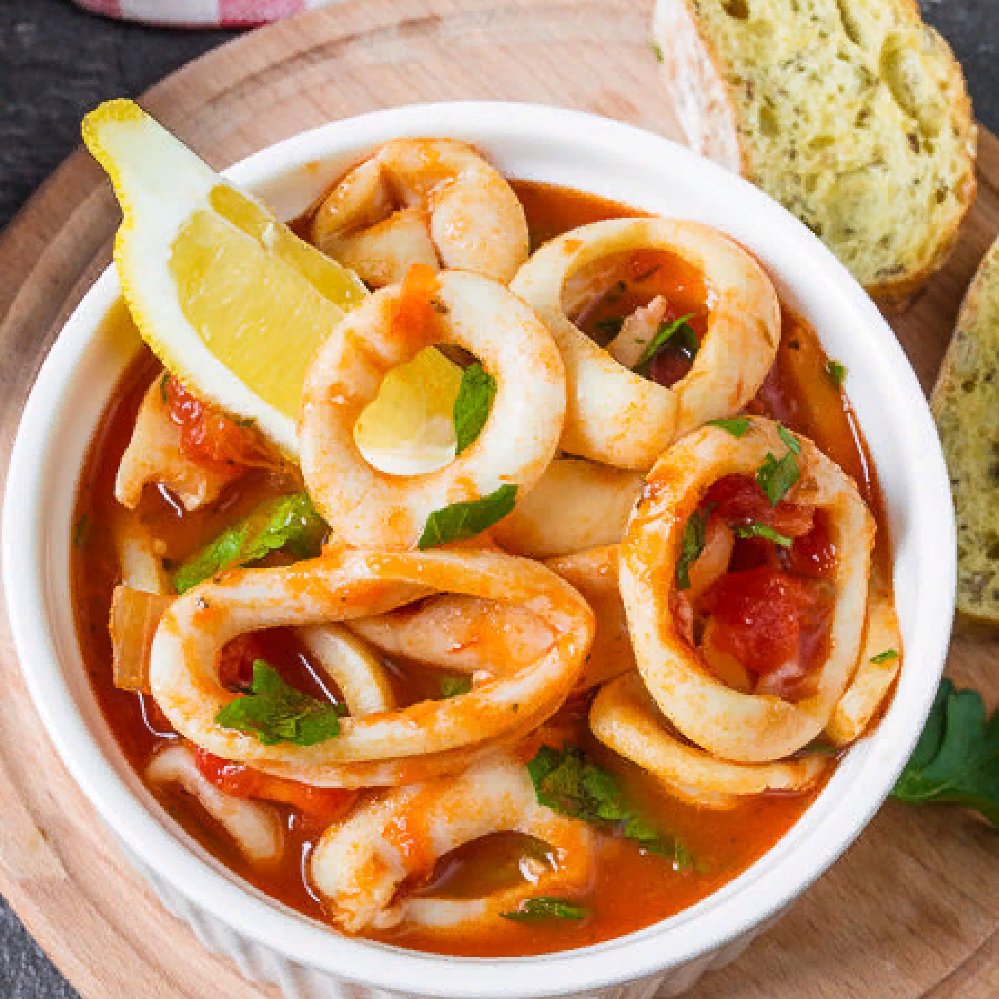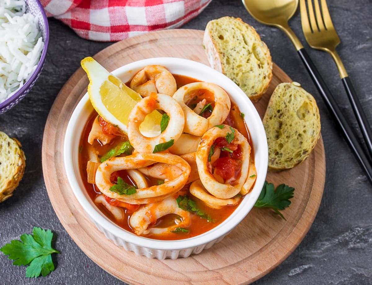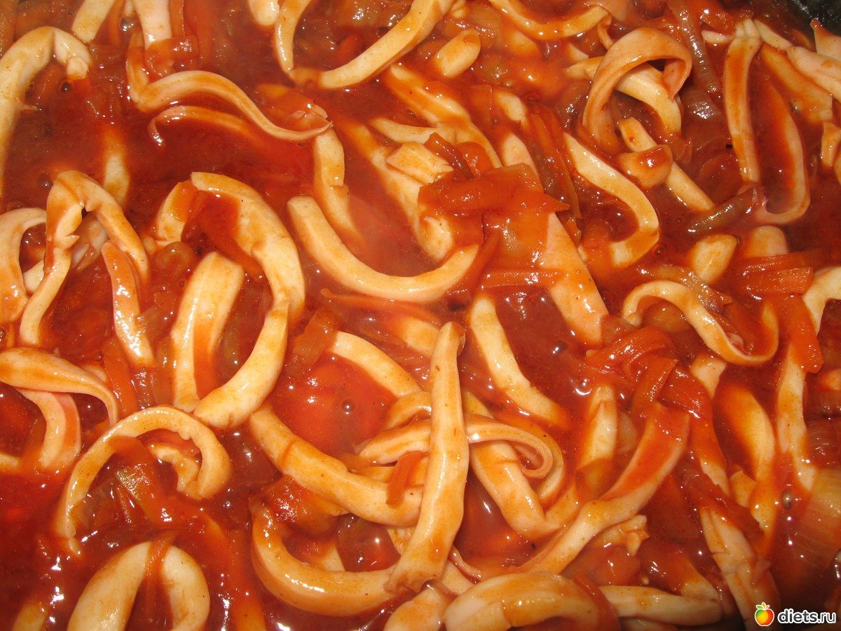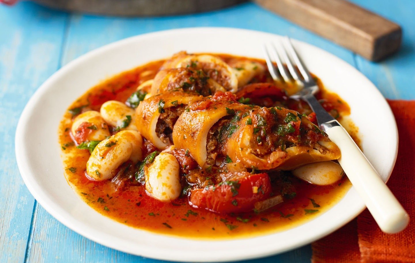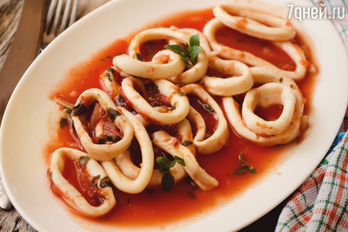 Кальмар, фаршированный ризотто, запеченный в томатном соусе
