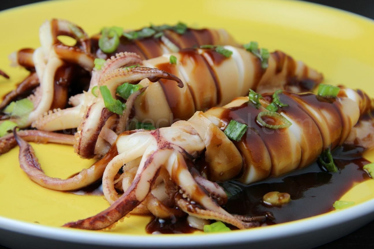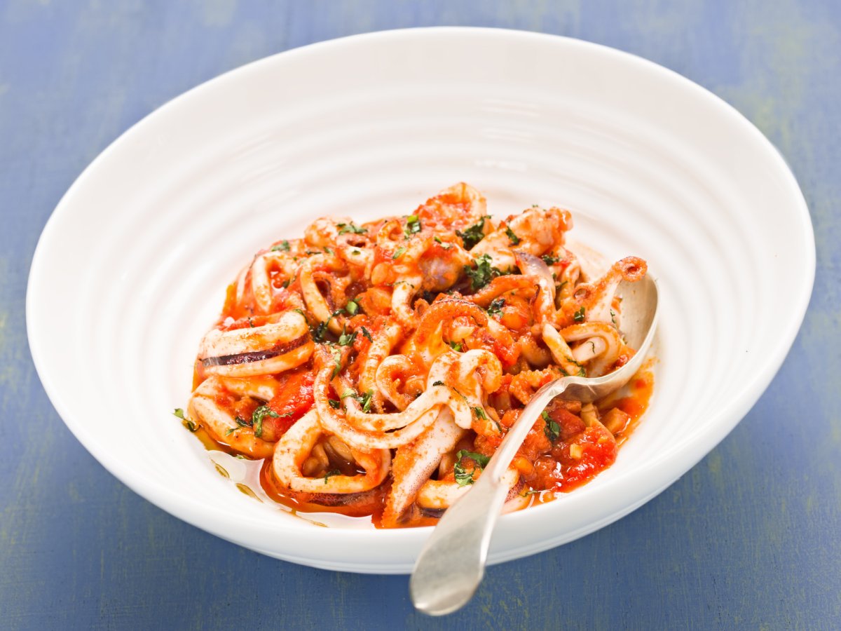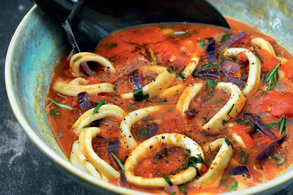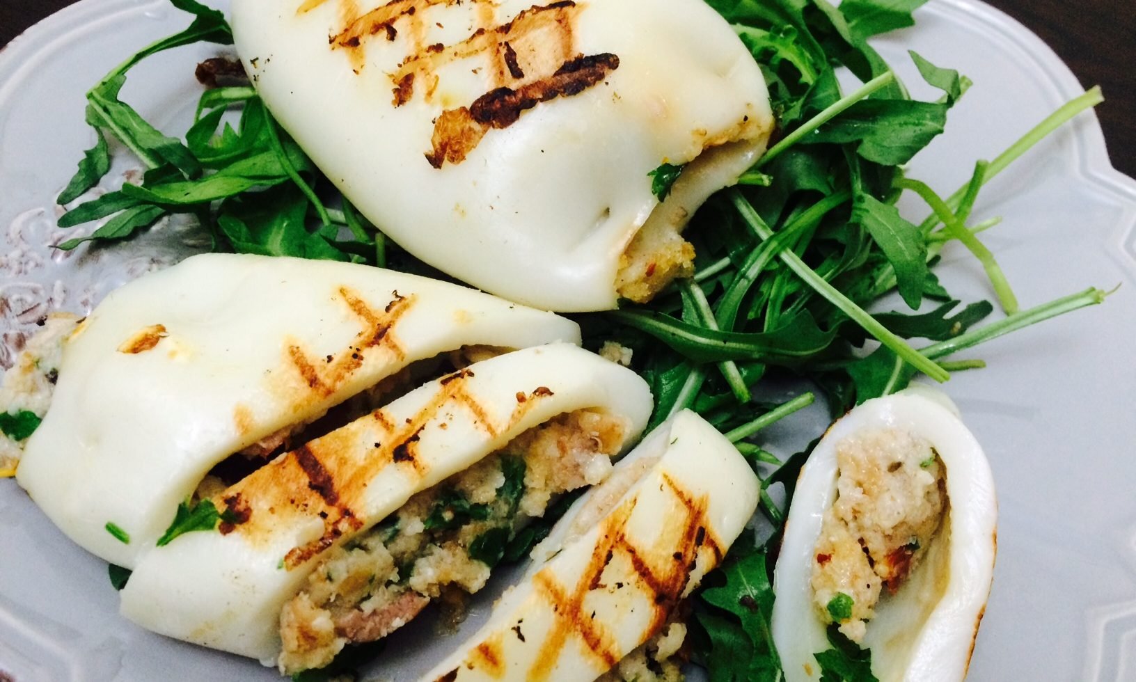Кальмар, фаршированный ризотто, запеченный в томатном соусе