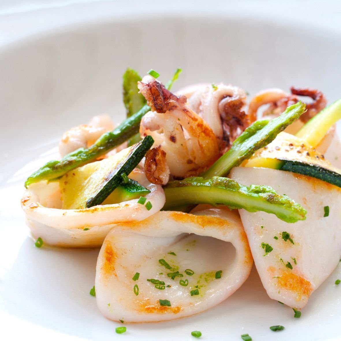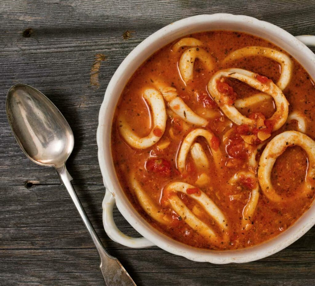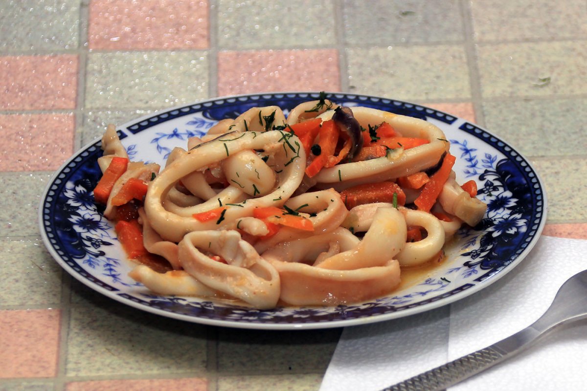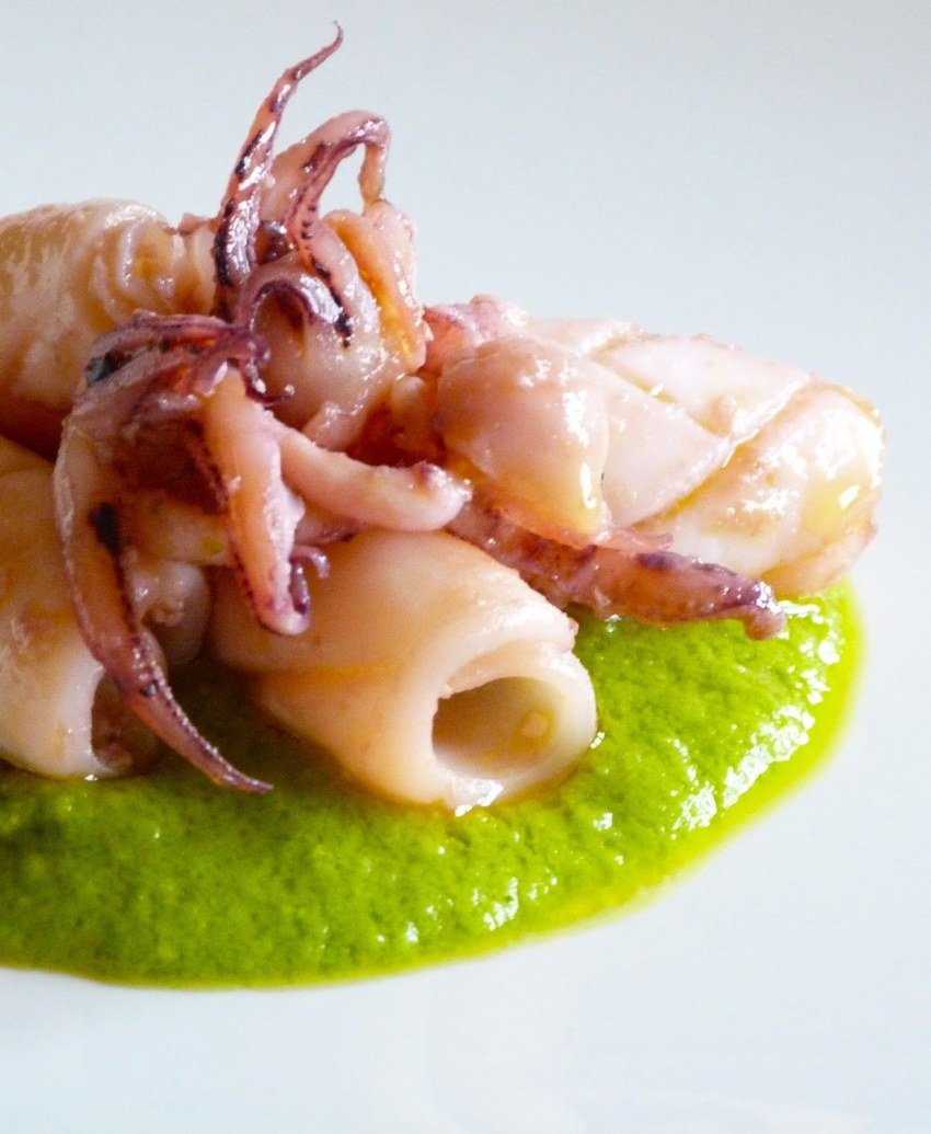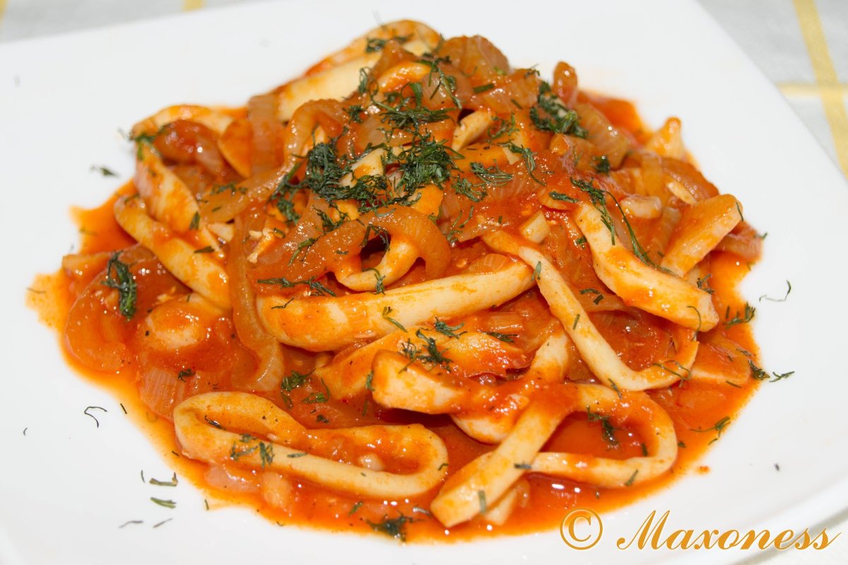 Кальмар, фаршированный ризотто, запеченный в томатном соусе