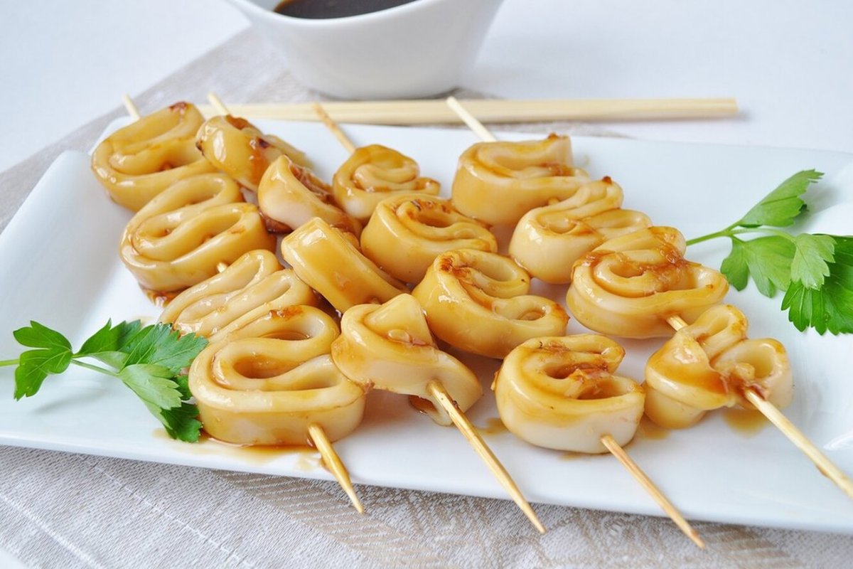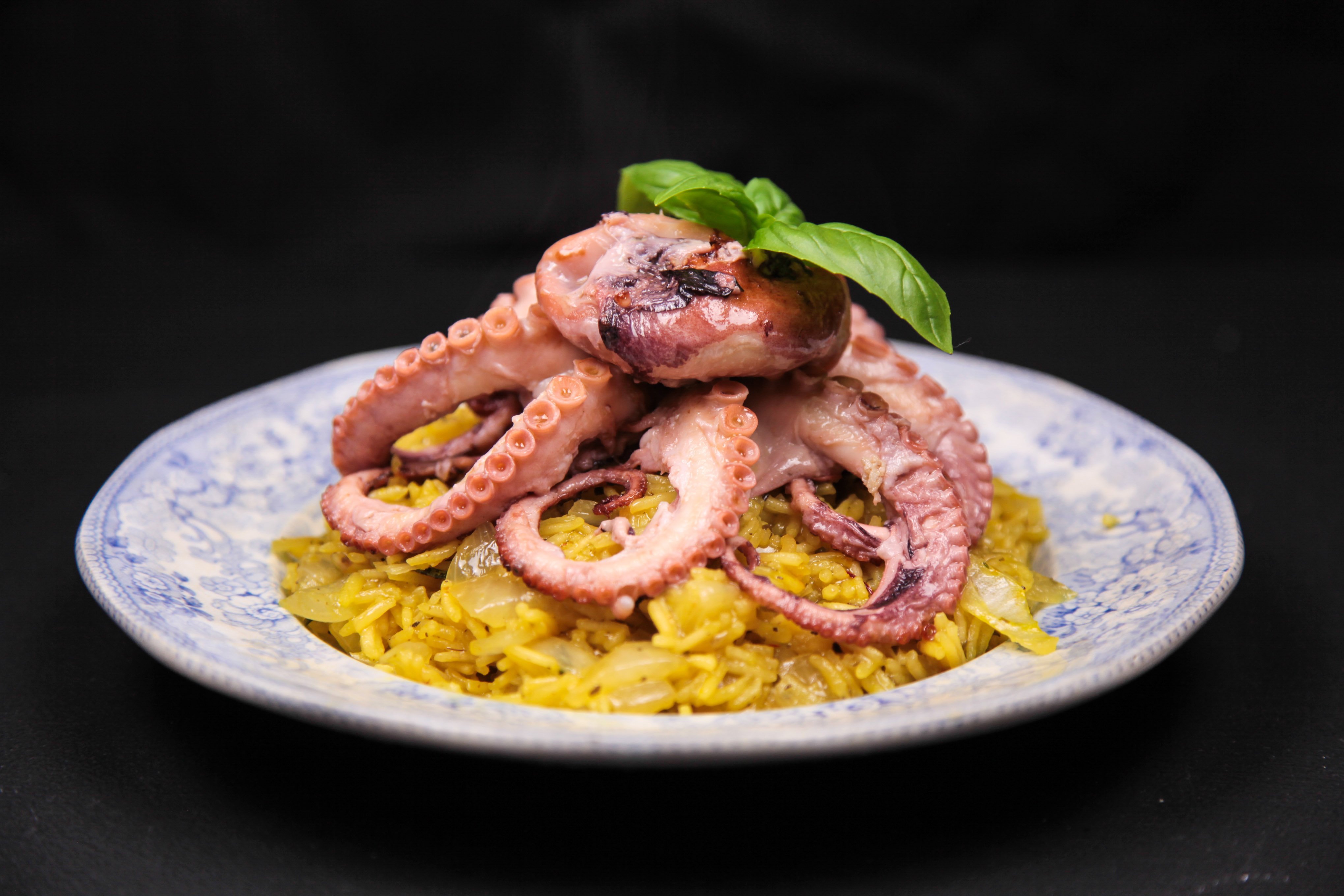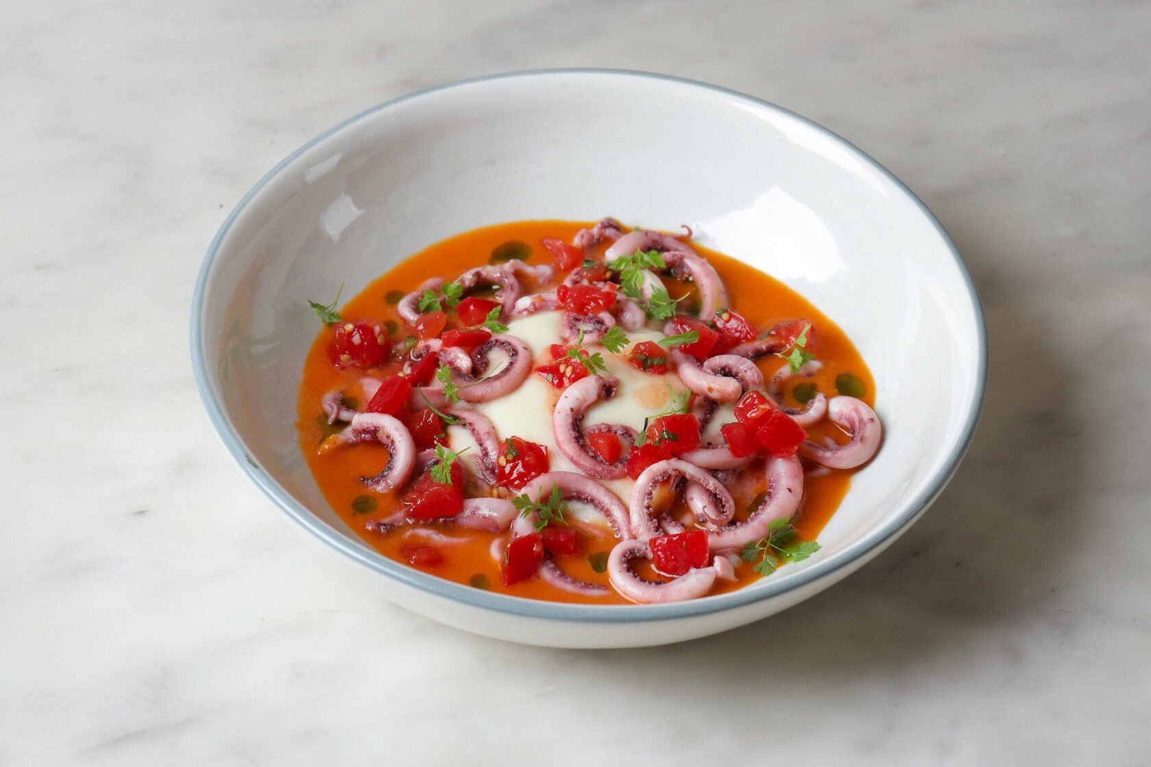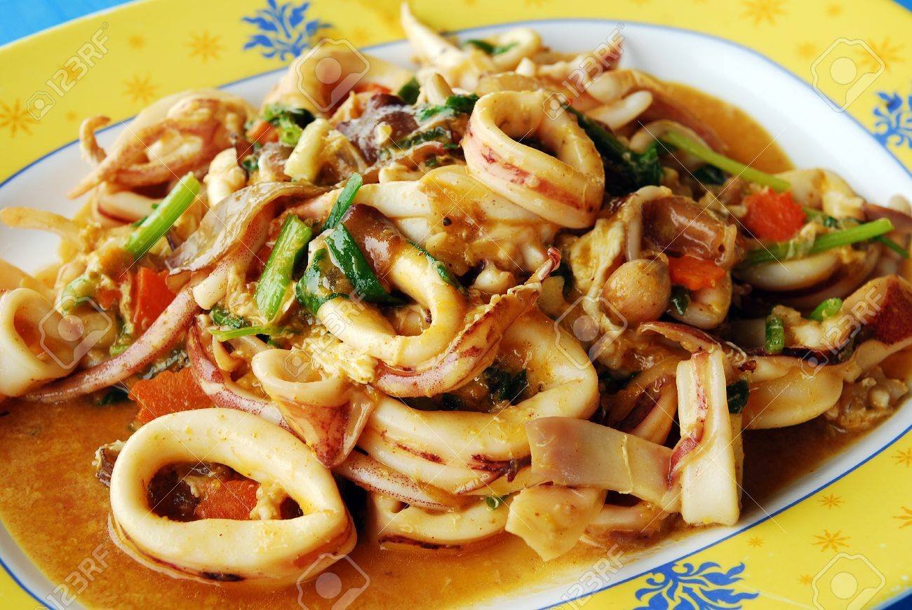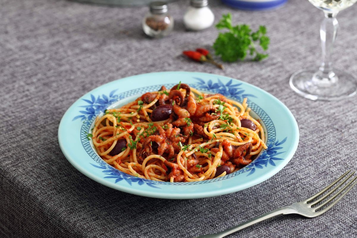 Кальмар, фаршированный ризотто, запеченный в томатном соусе