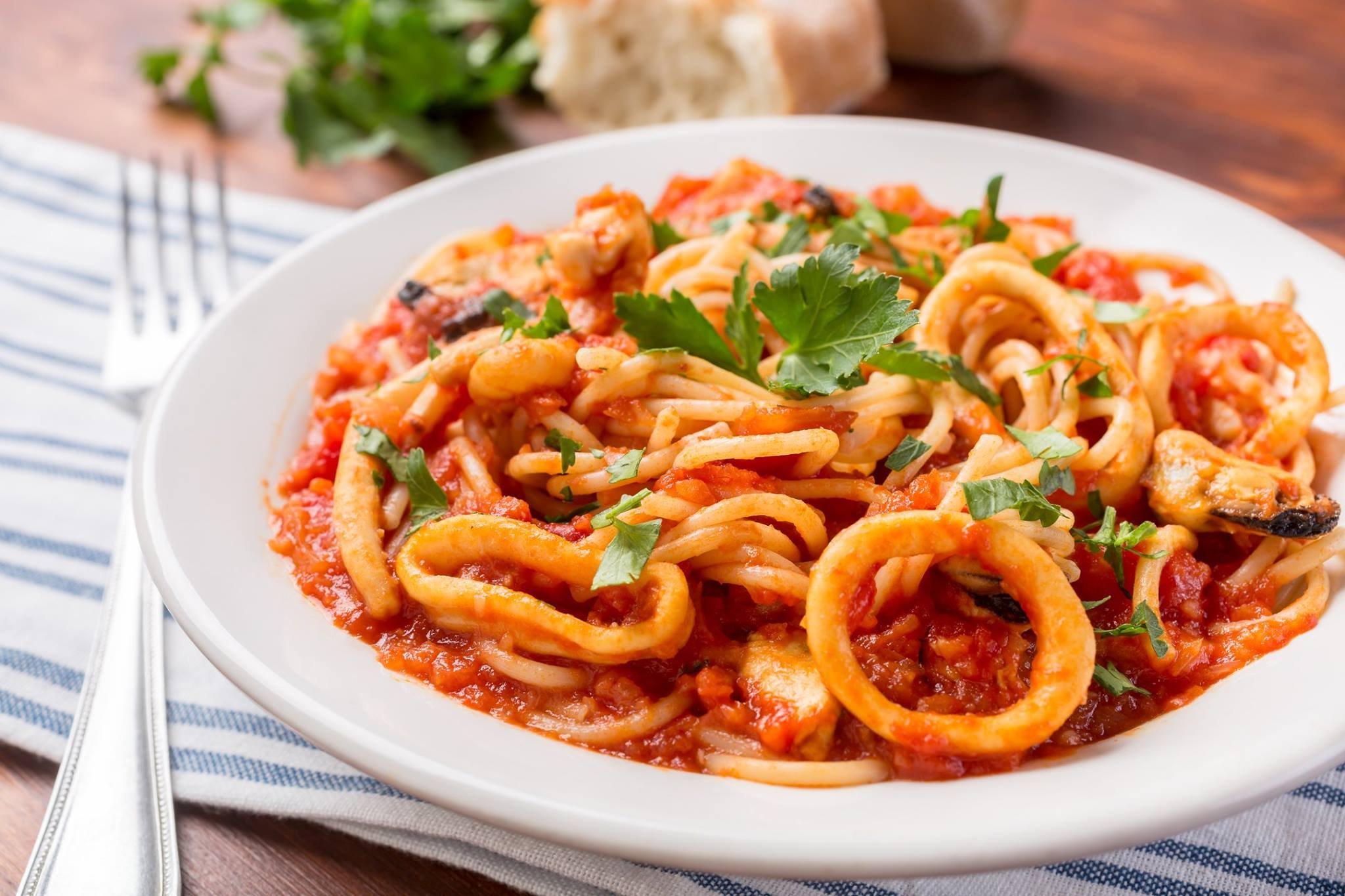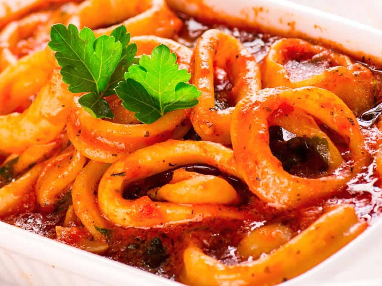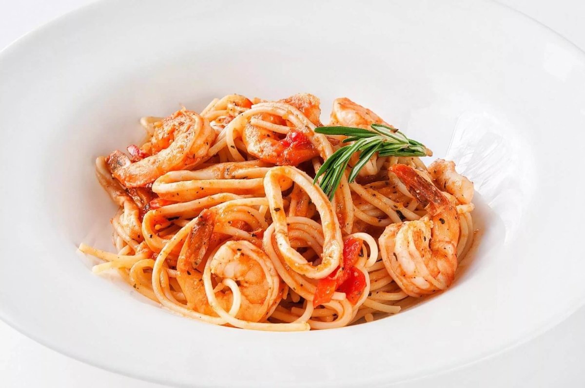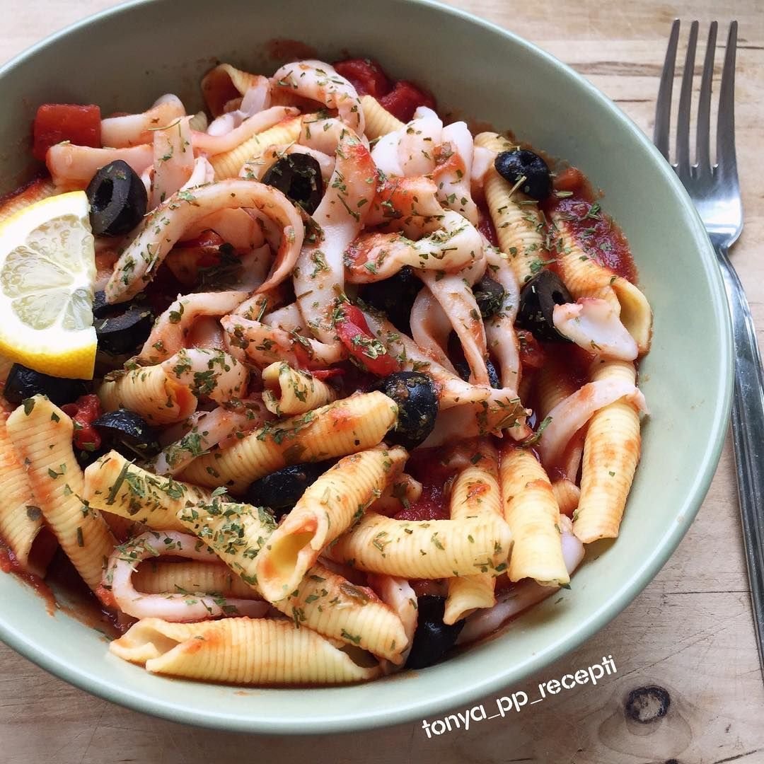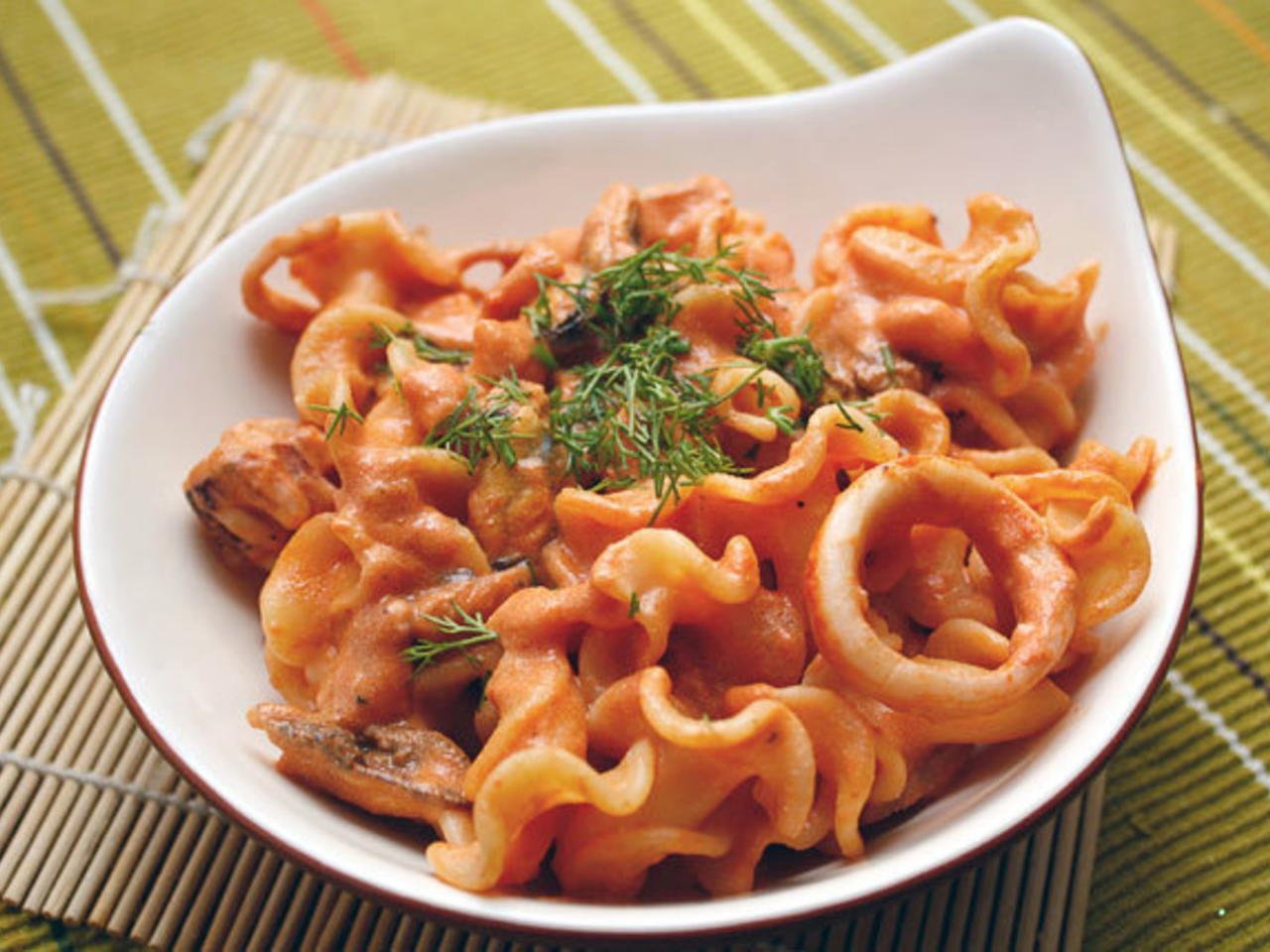 Паккери с креветками и кальмарами в сливочно-томатном соусе