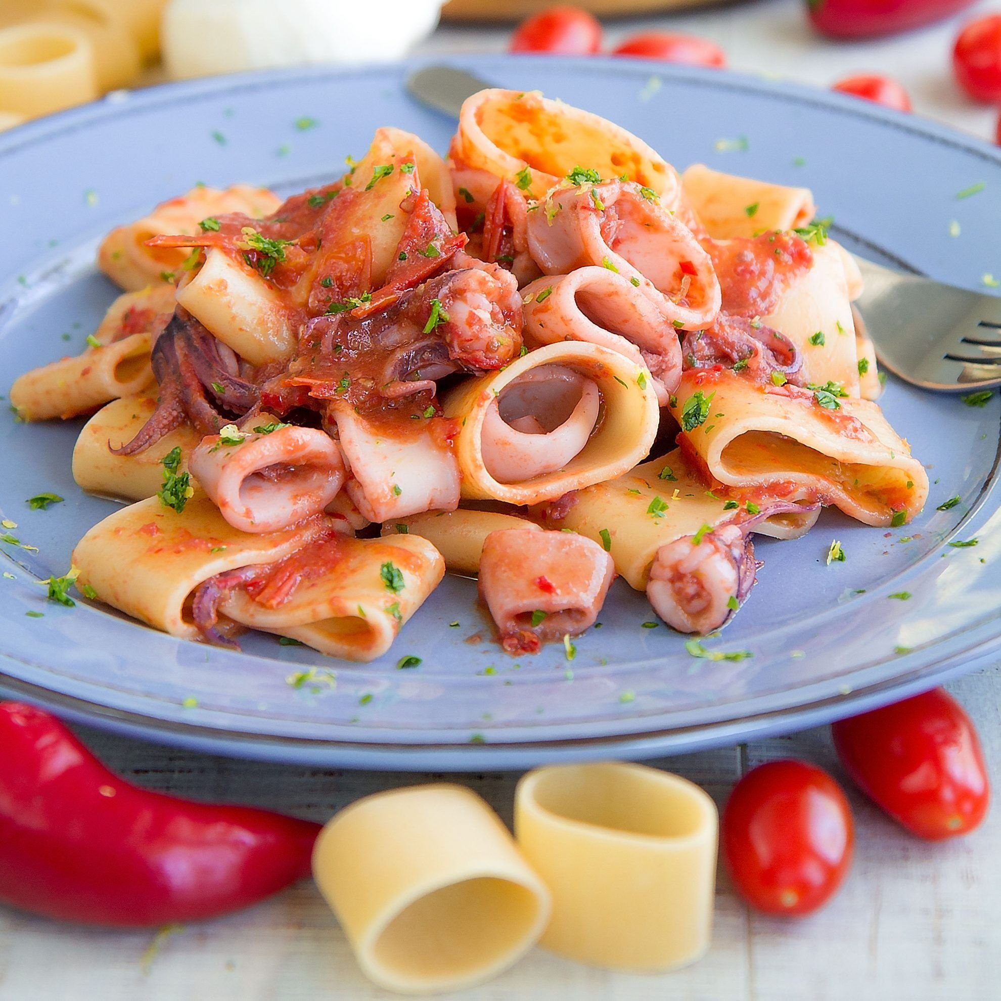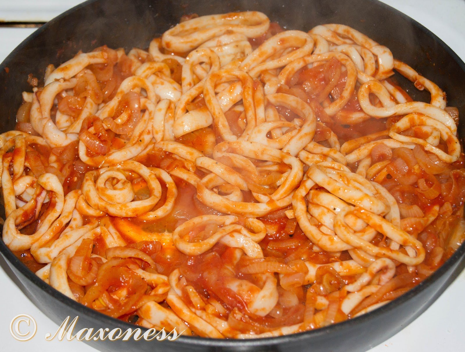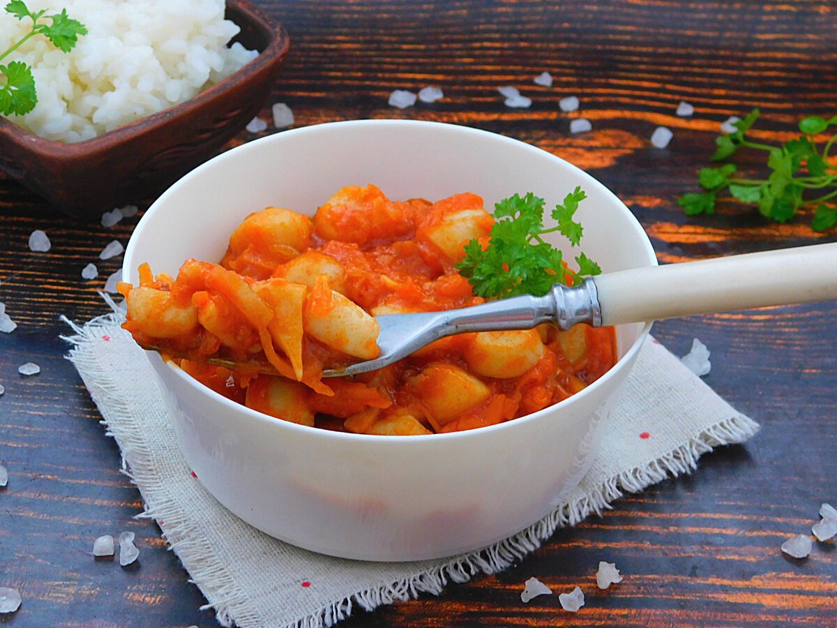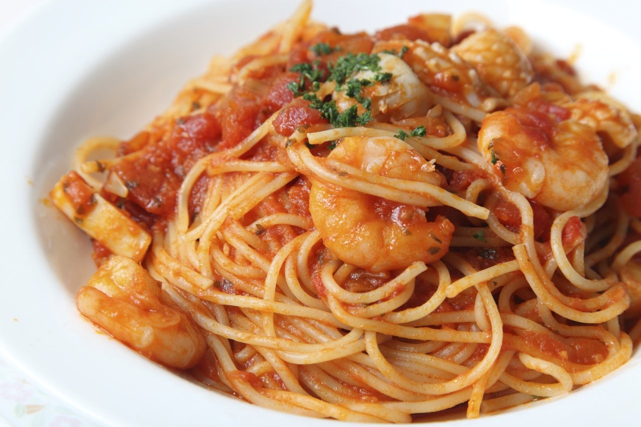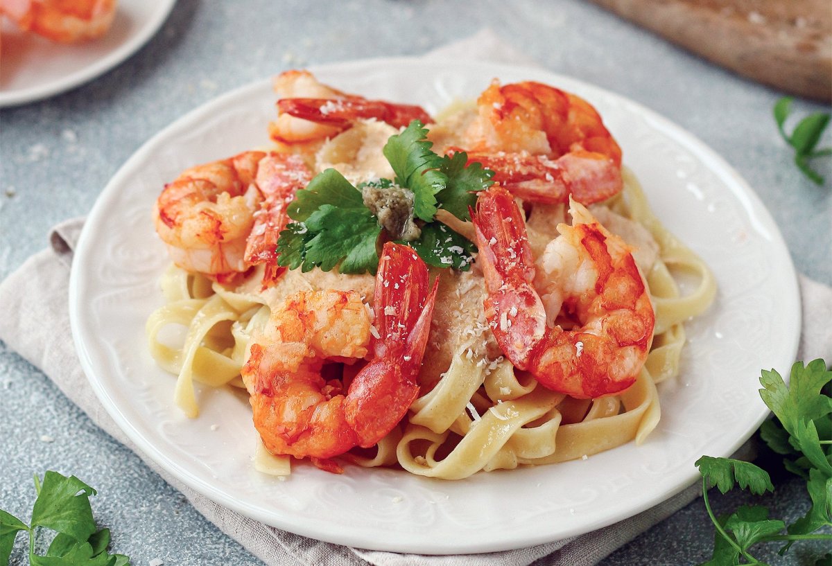 Паккери с креветками и кальмарами в сливочно-томатном соусе