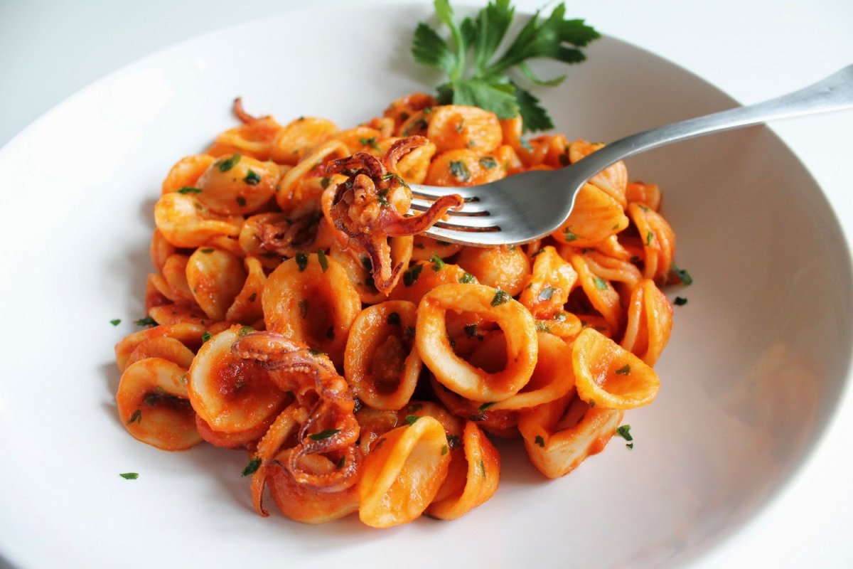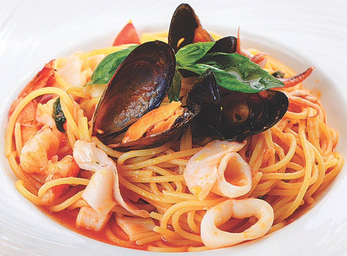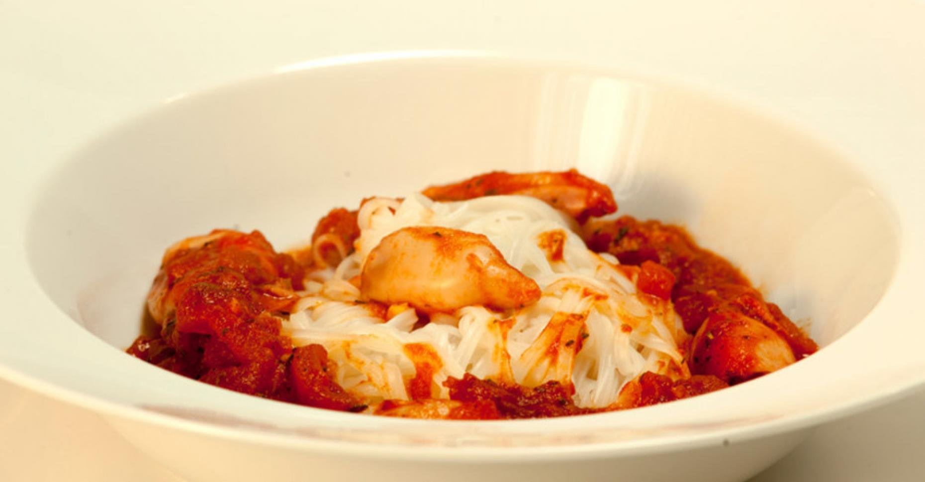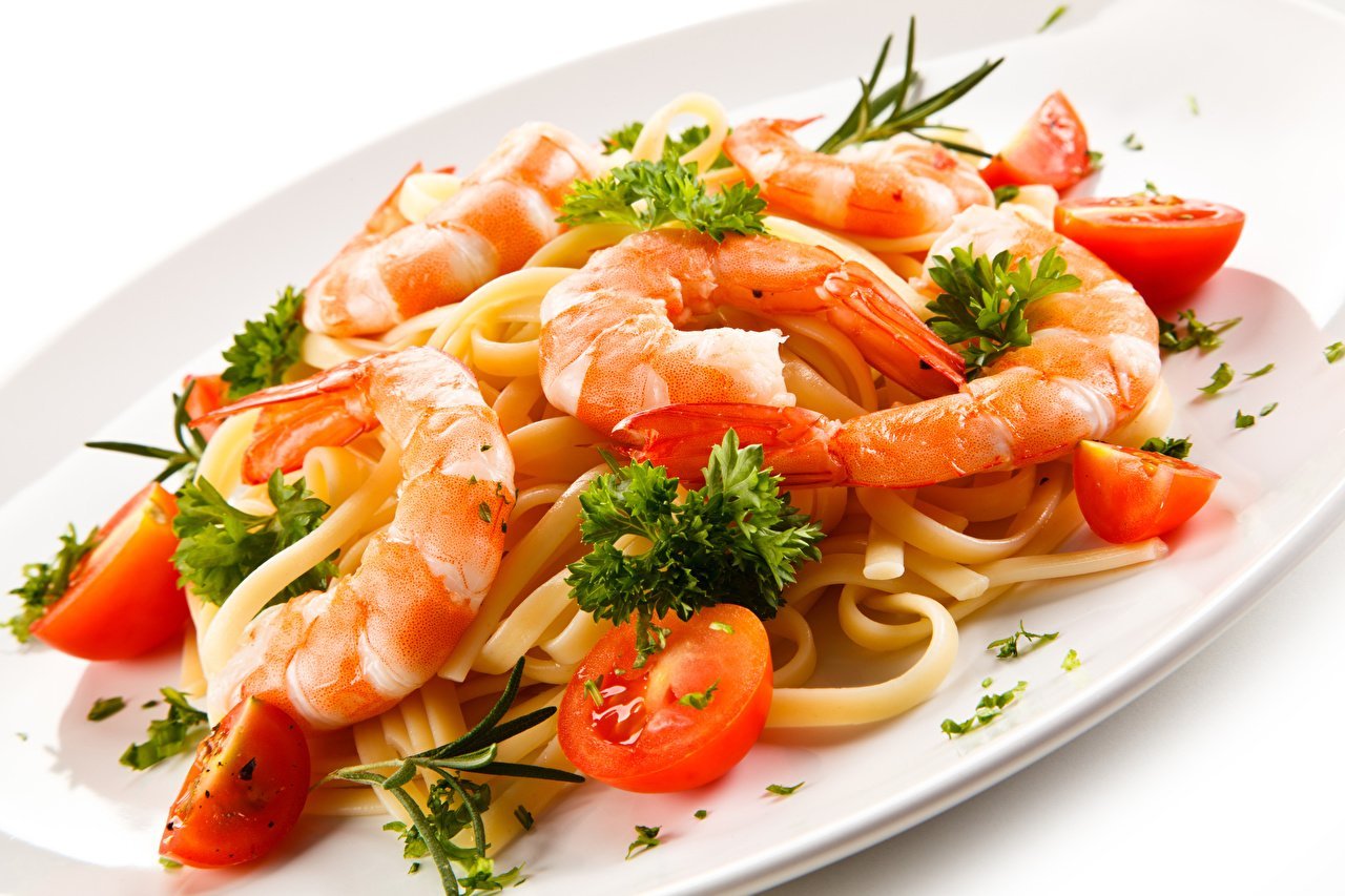Паккери с креветками и кальмарами в сливочно-томатном соусе