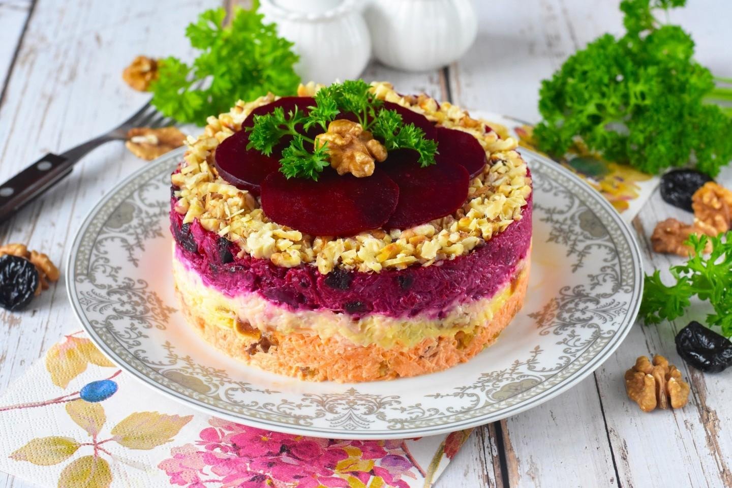Слоеный салат со свеклой и черносливом