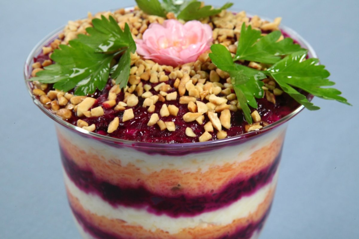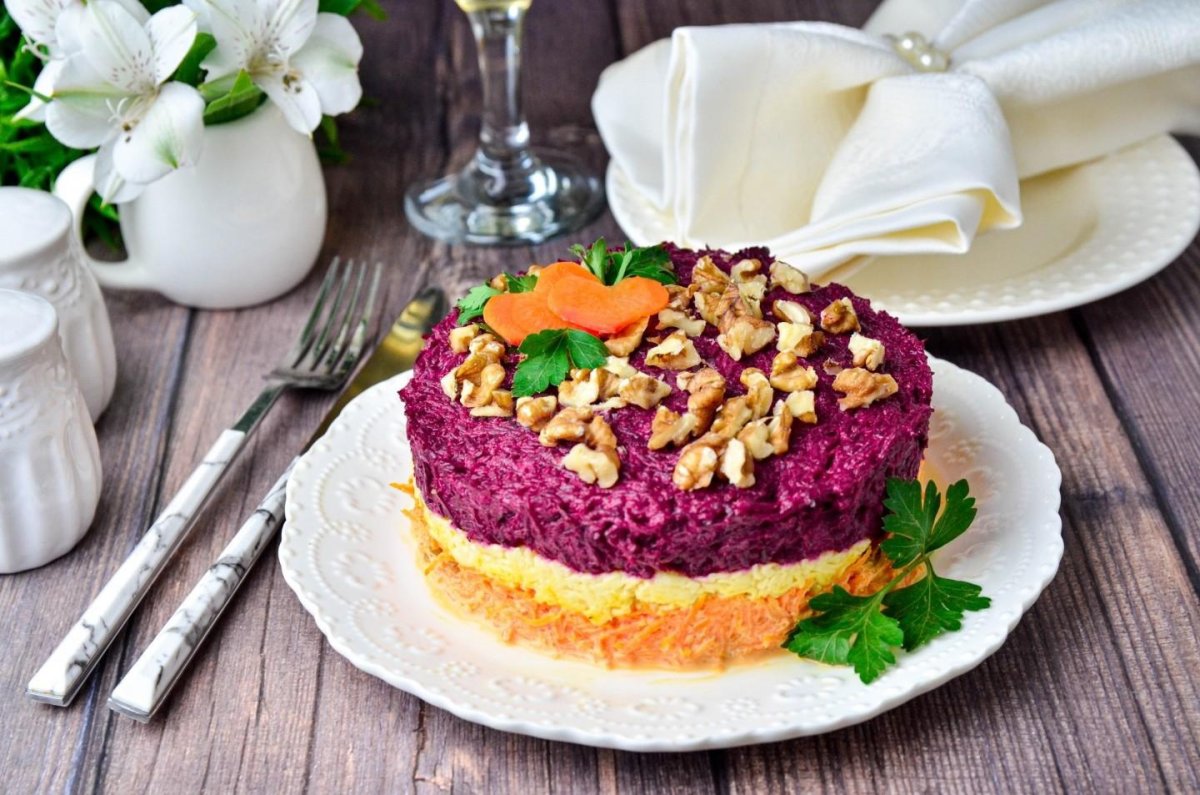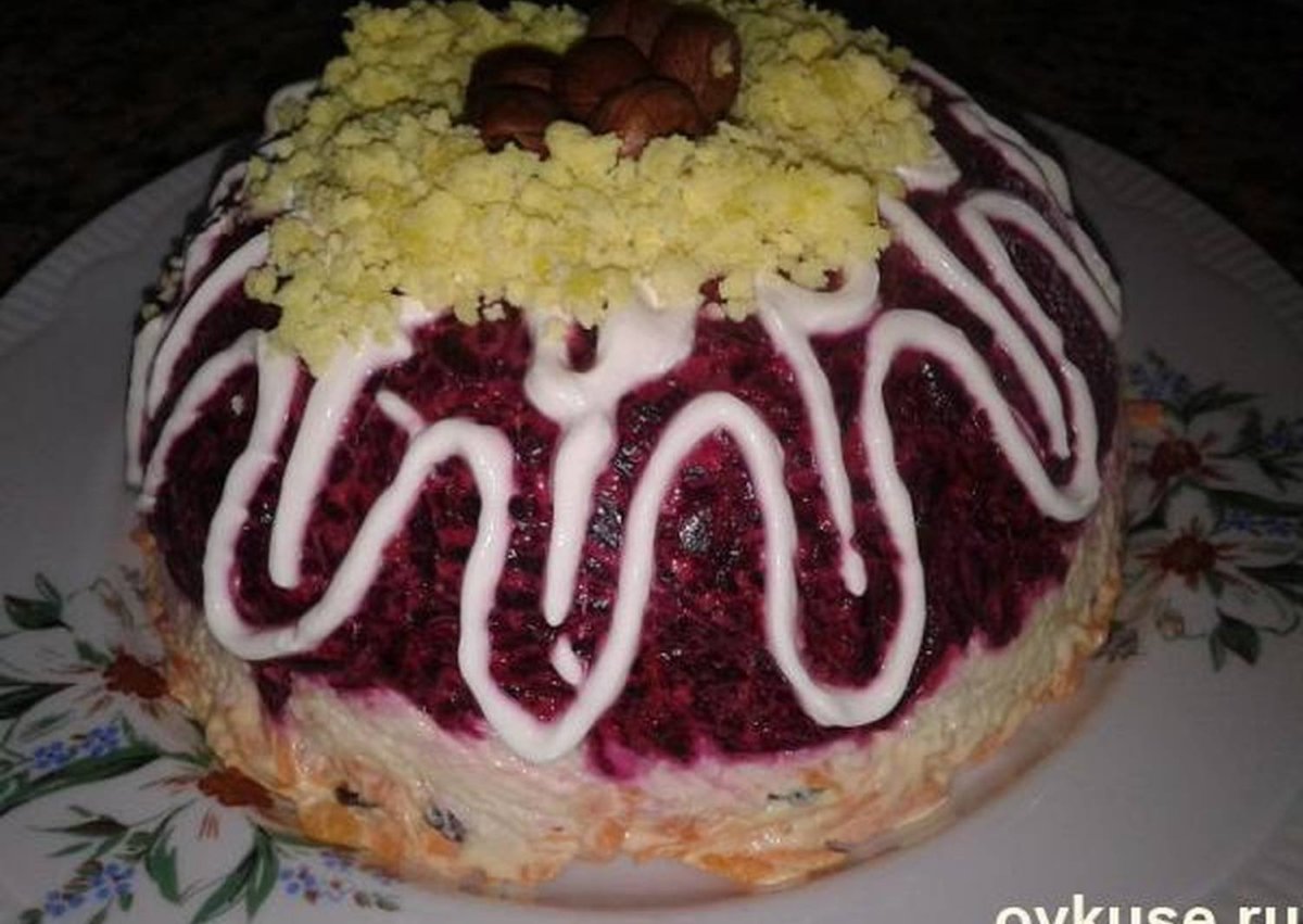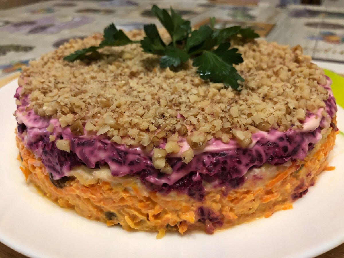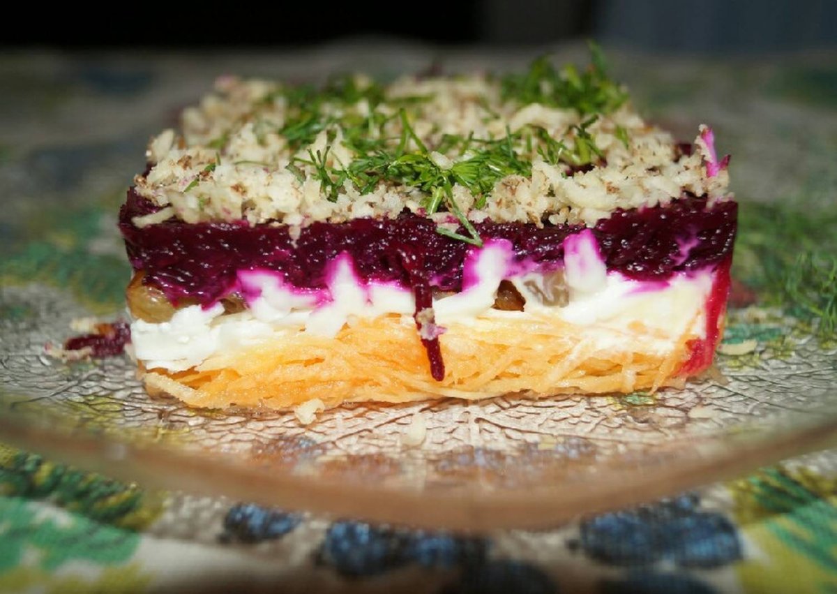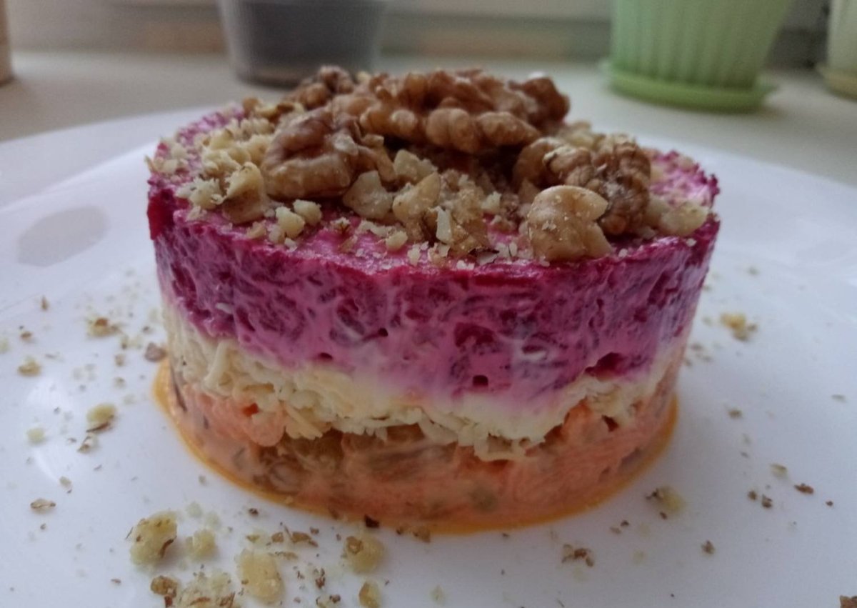 Слоеный салат со свеклой и грецкими орехами
