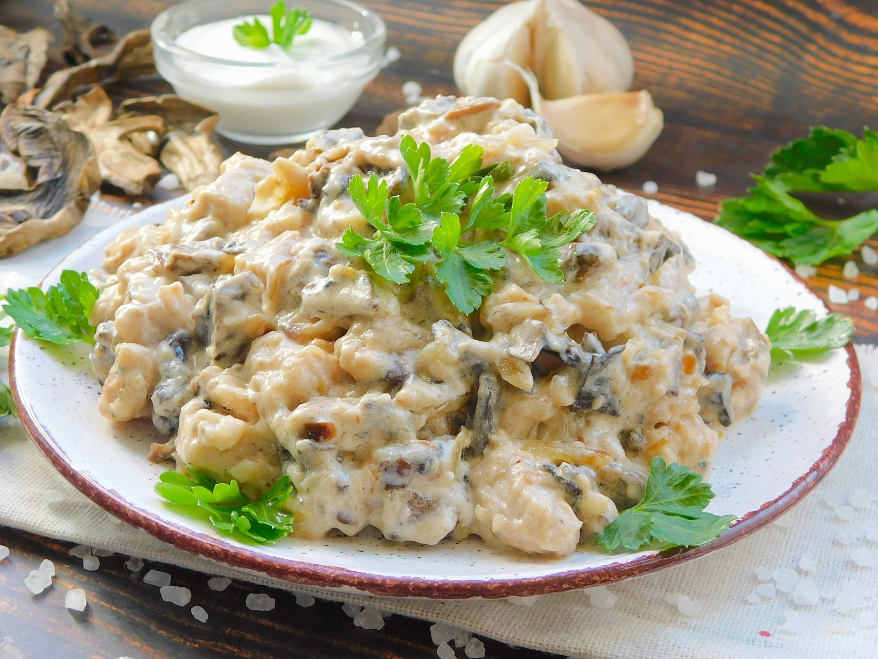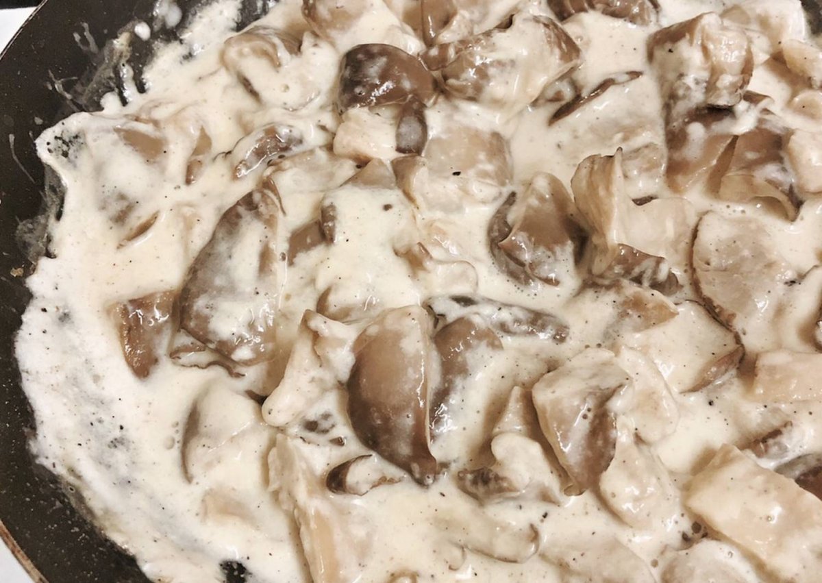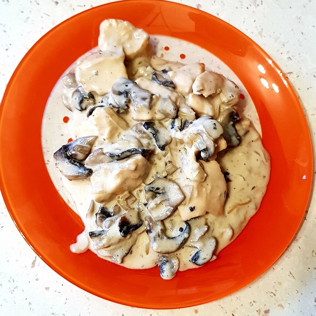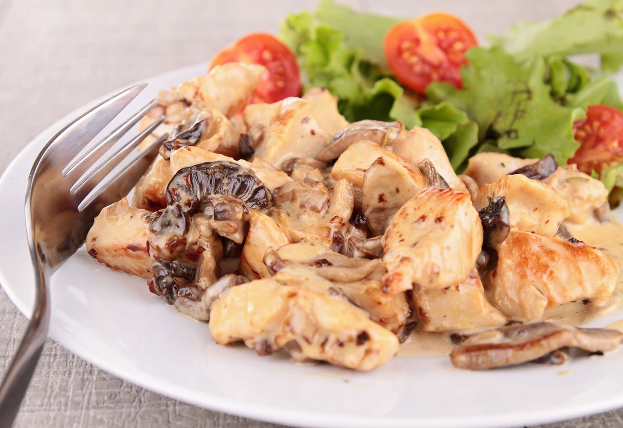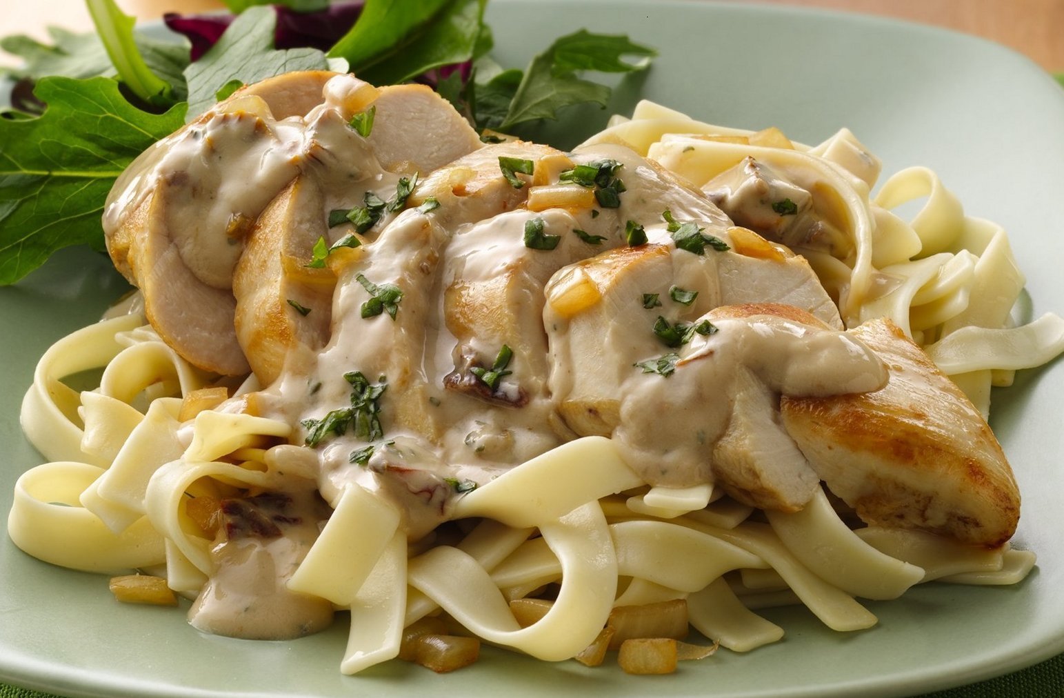Паста с грибами и курицей в сливочном соусе и курицей.