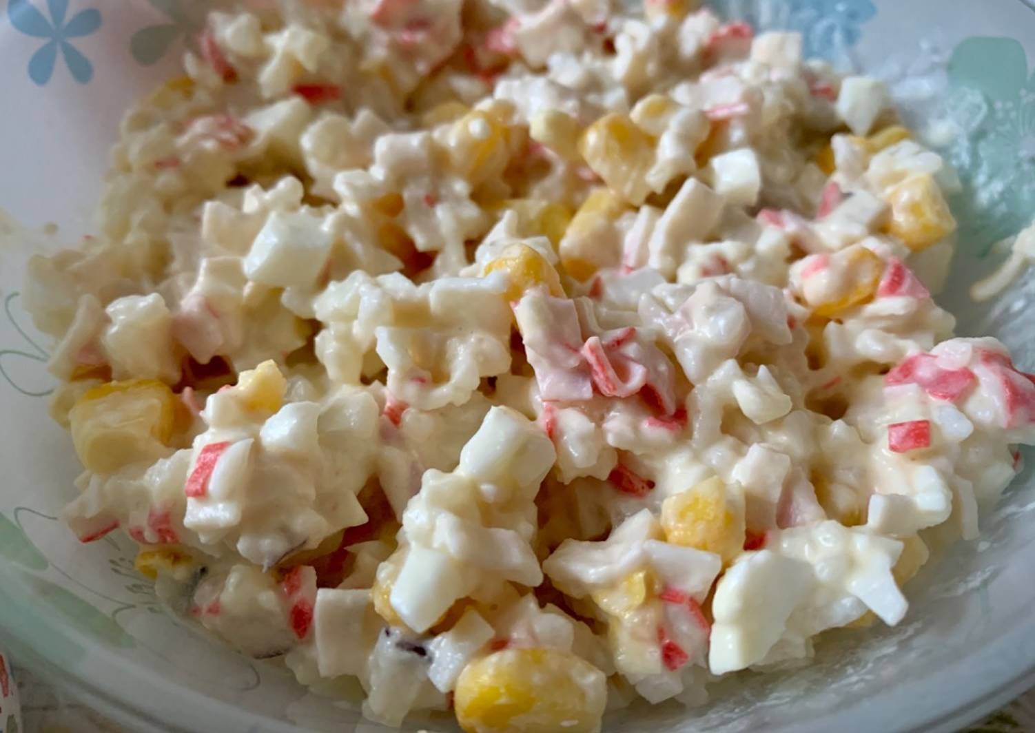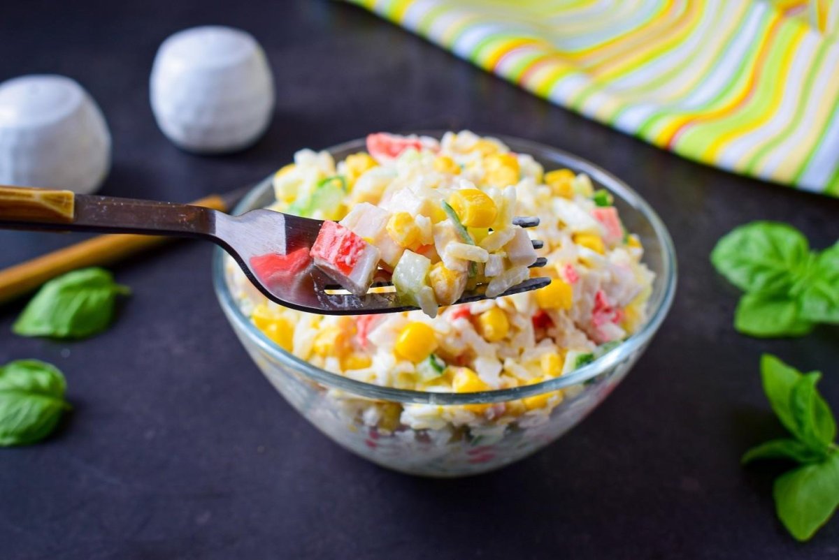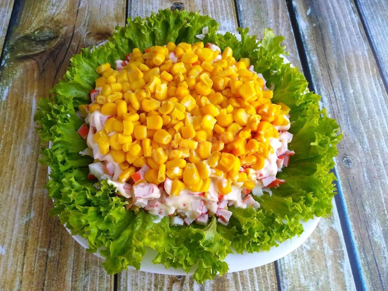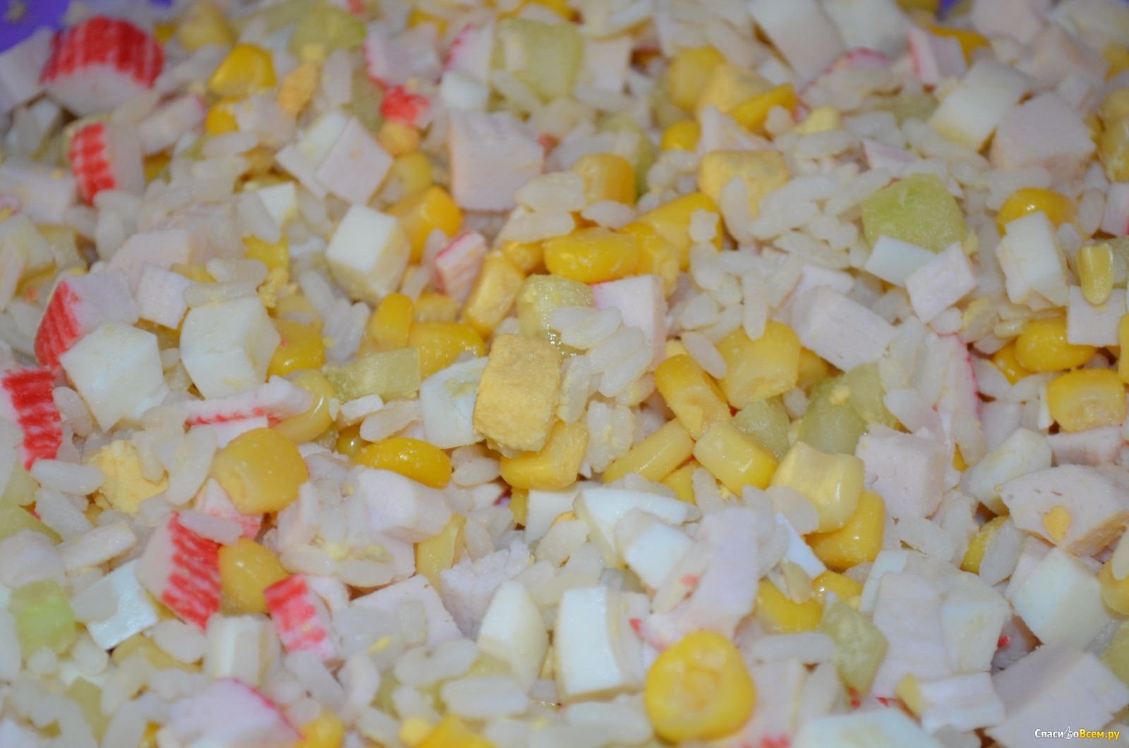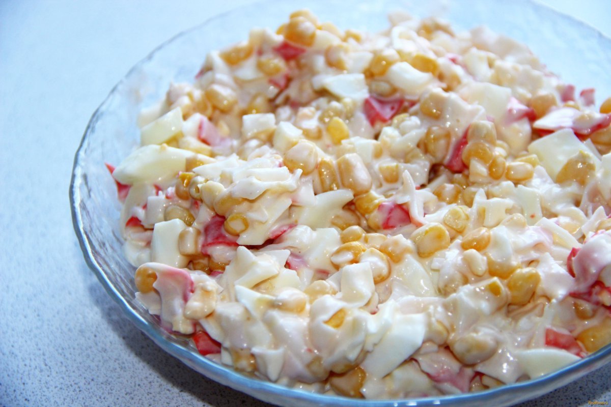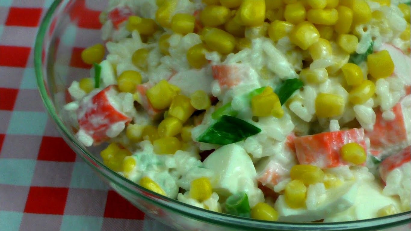 Салат с крабовыми палочками и кукурузой и яйцом и рисом