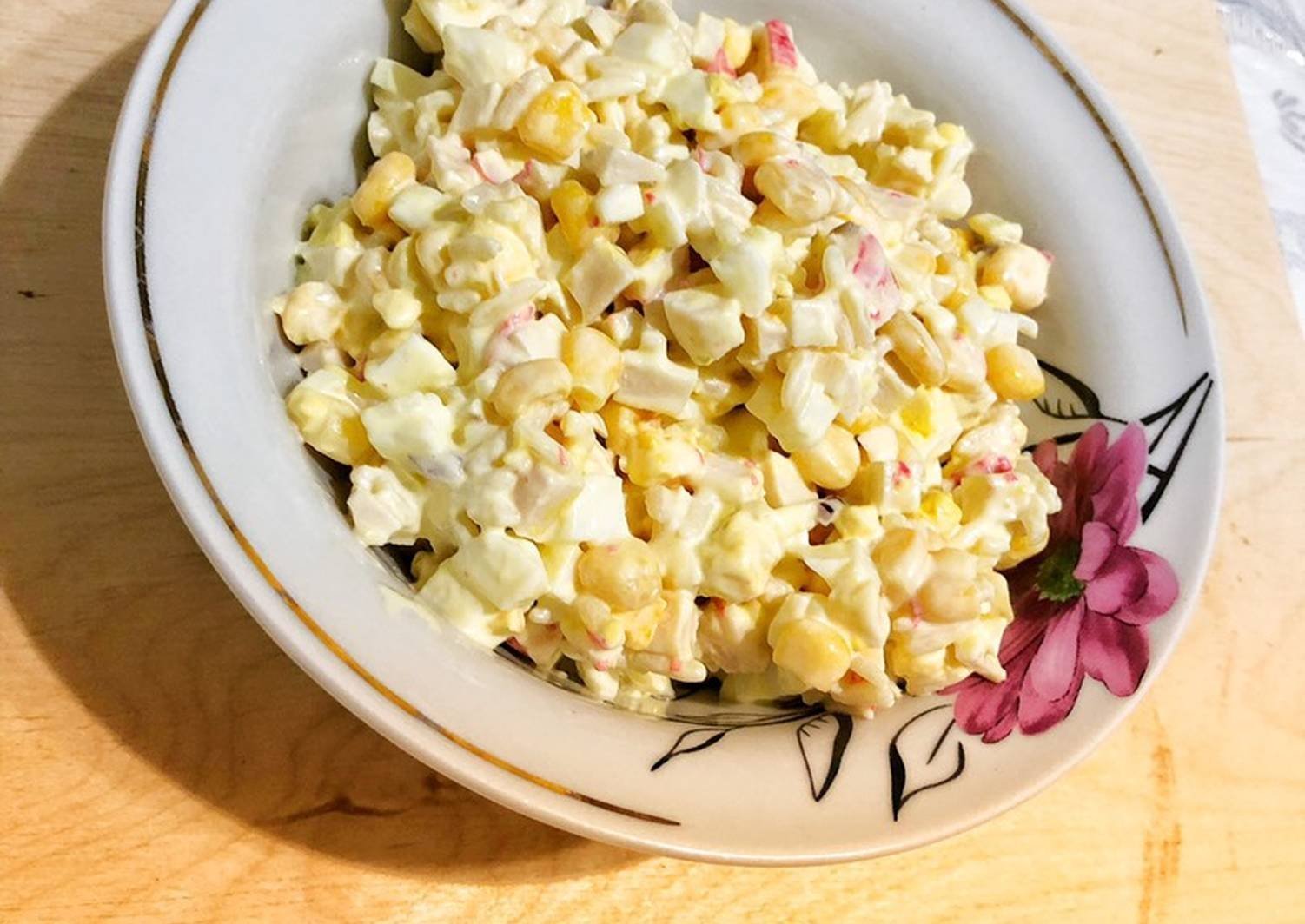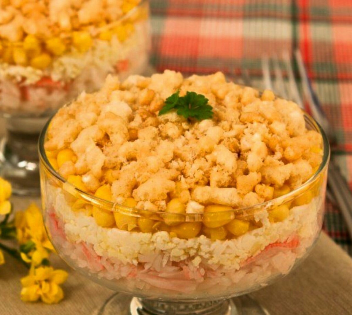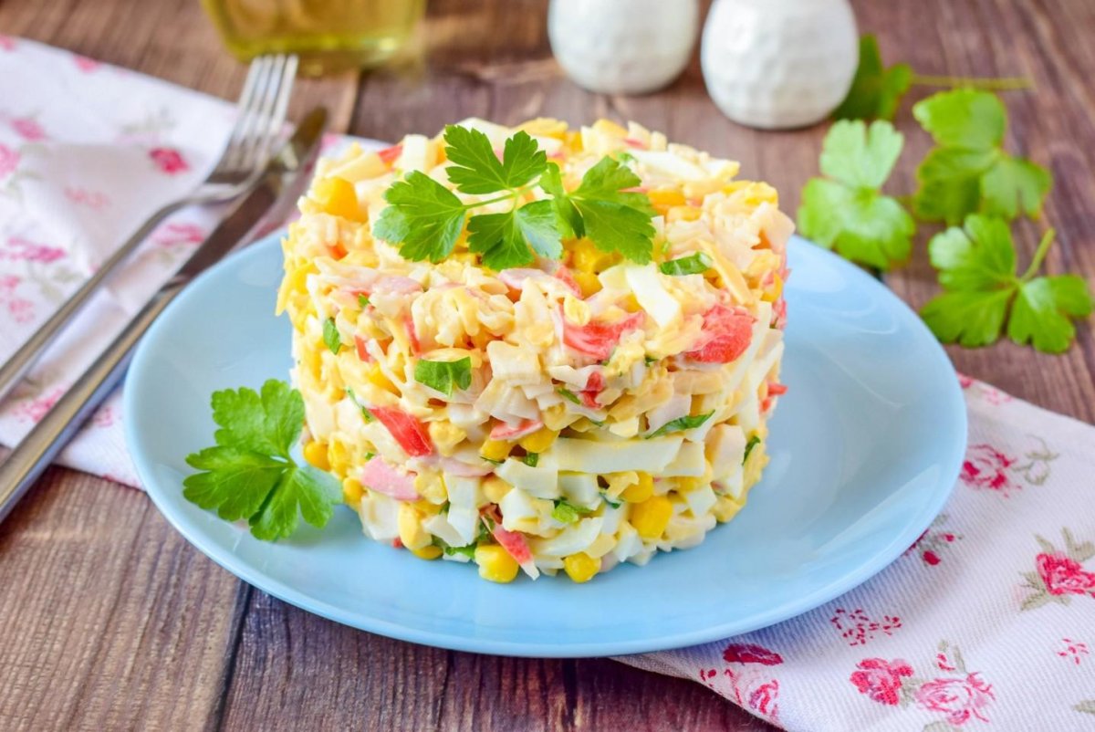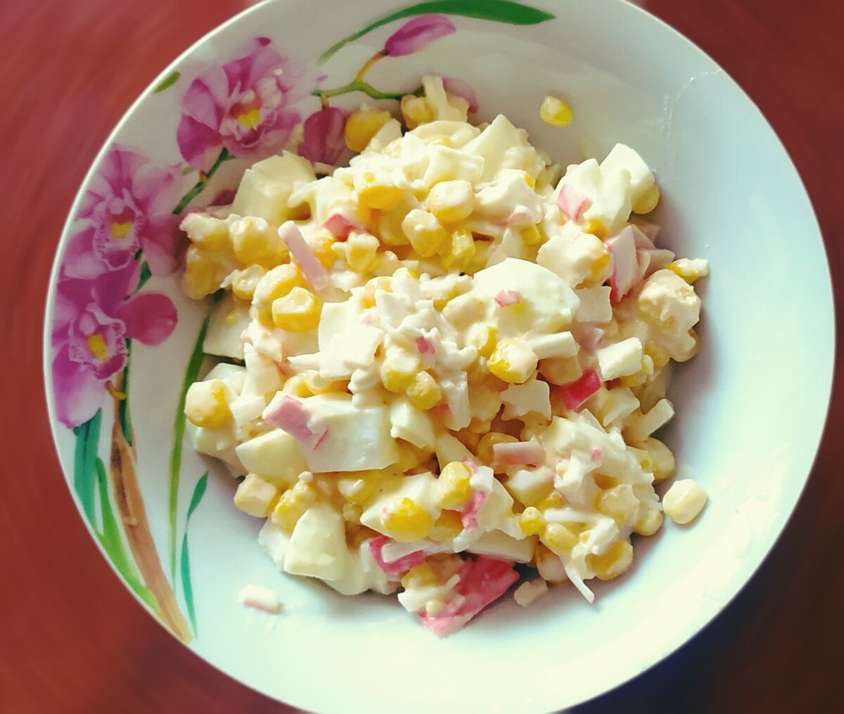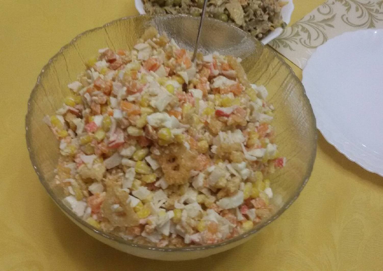 Салат с крабовыми палочками и кукурузой и яйцом и рисом