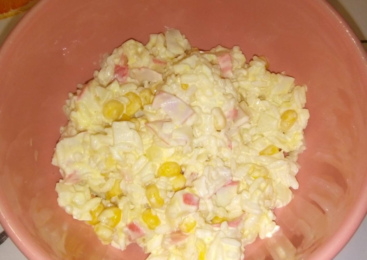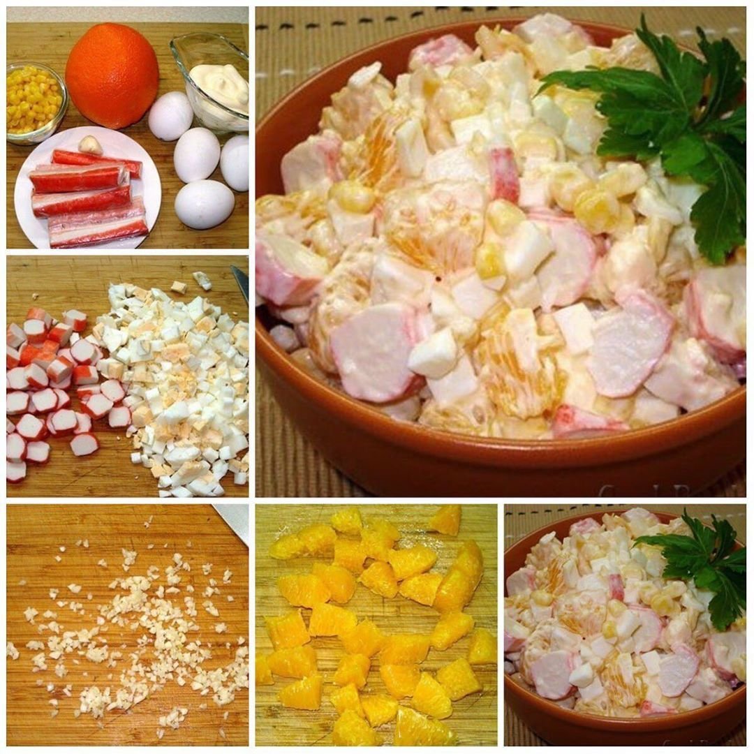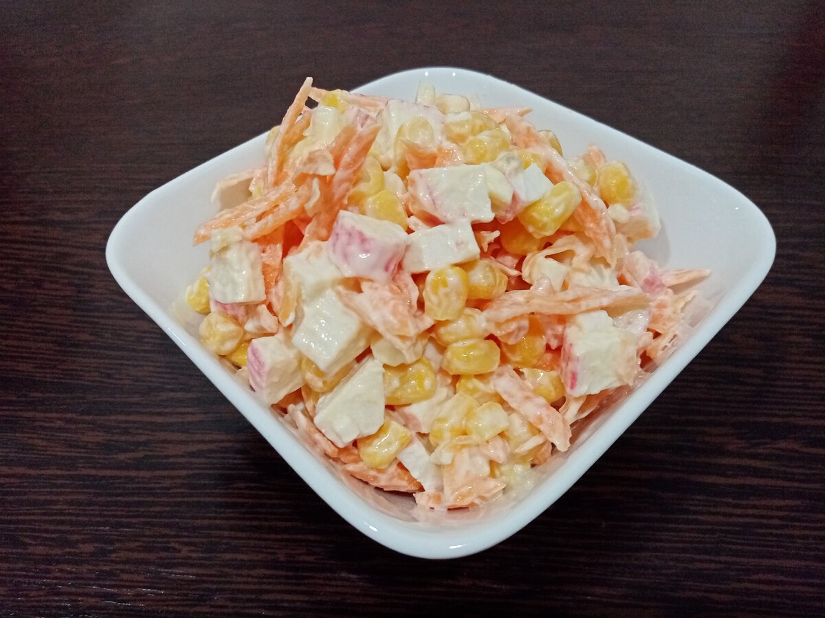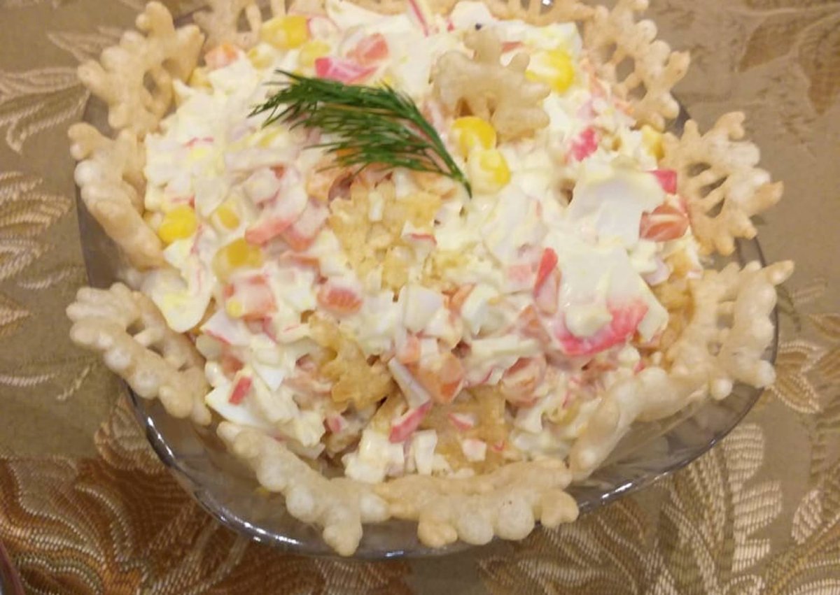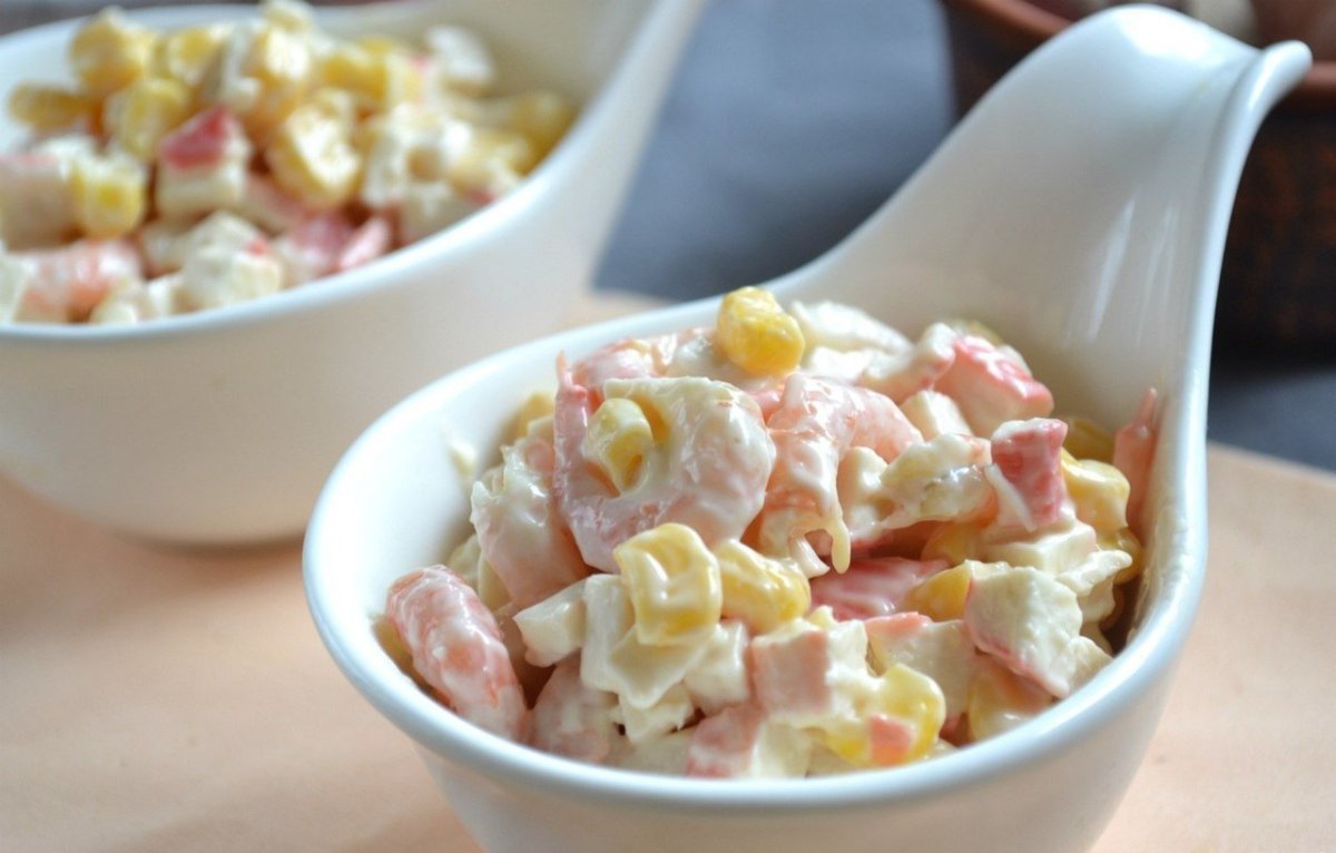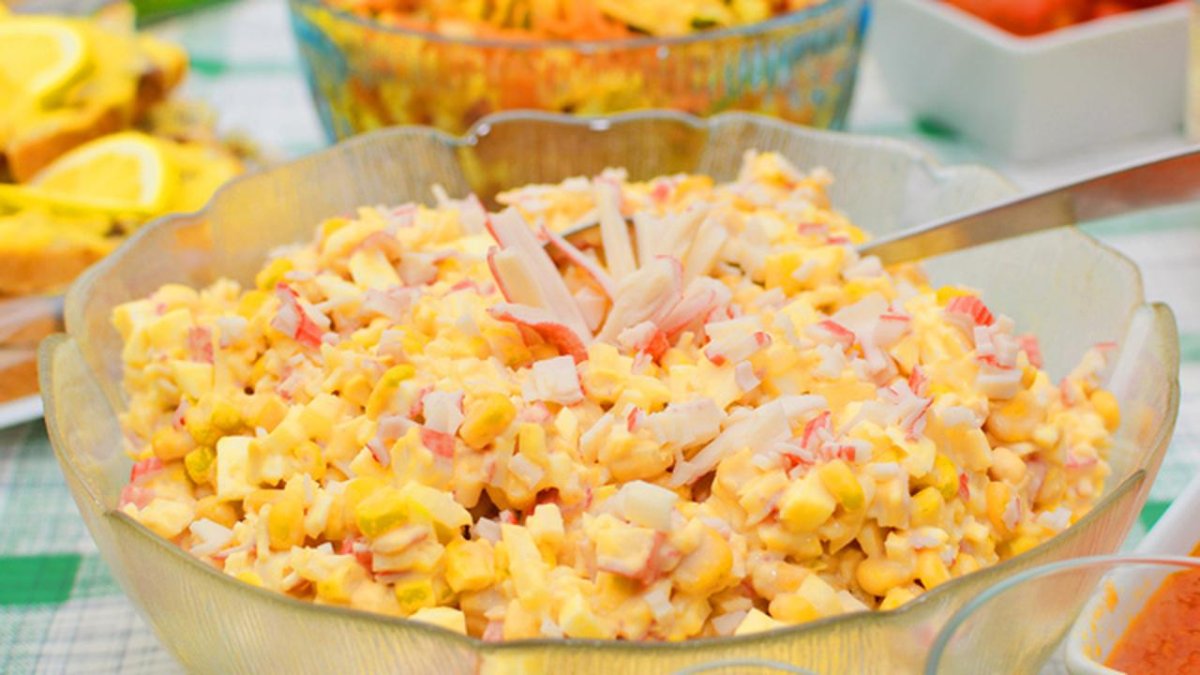Салат с крабовыми палочками и кукурузой и яйцом и рисом