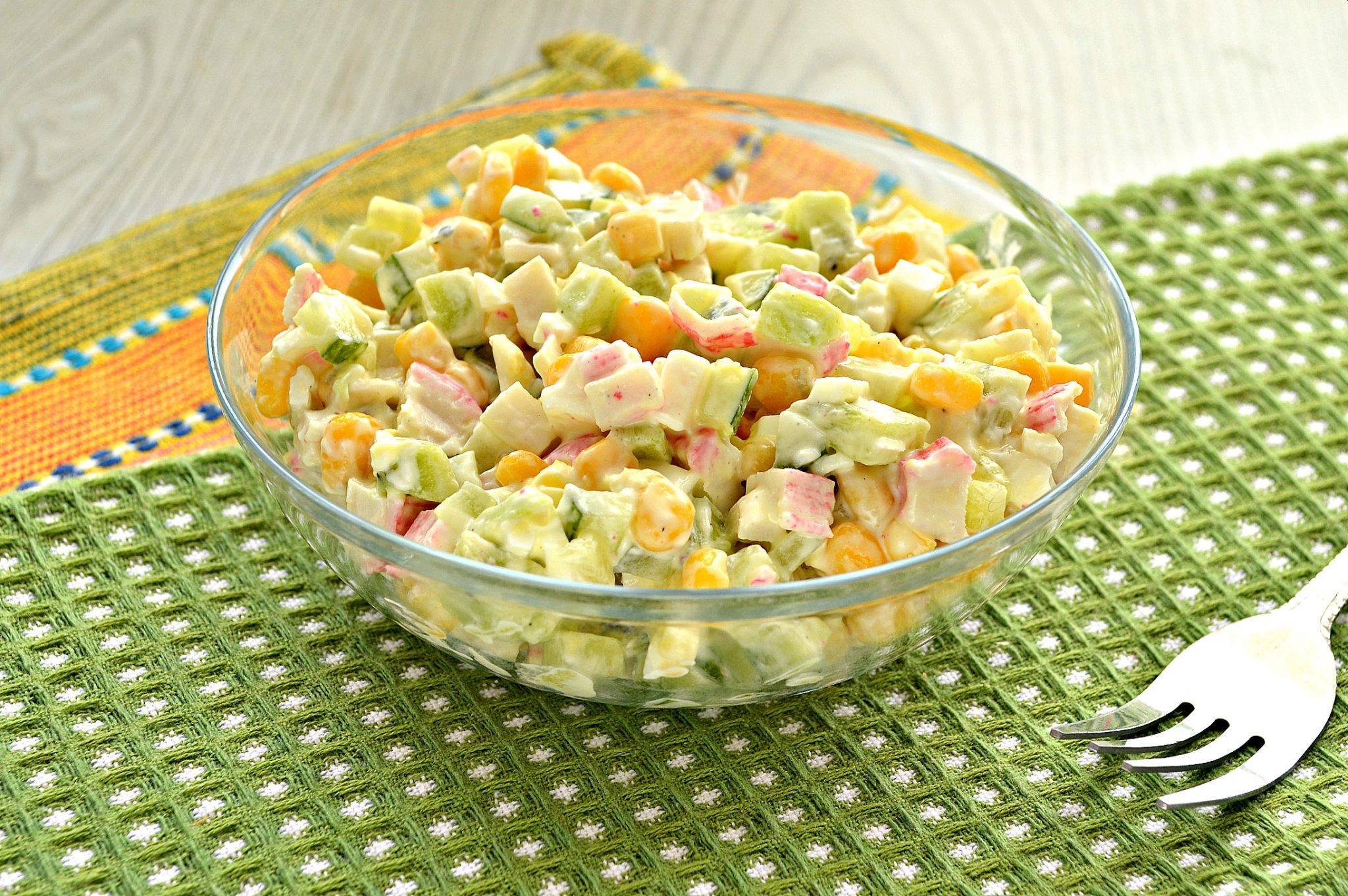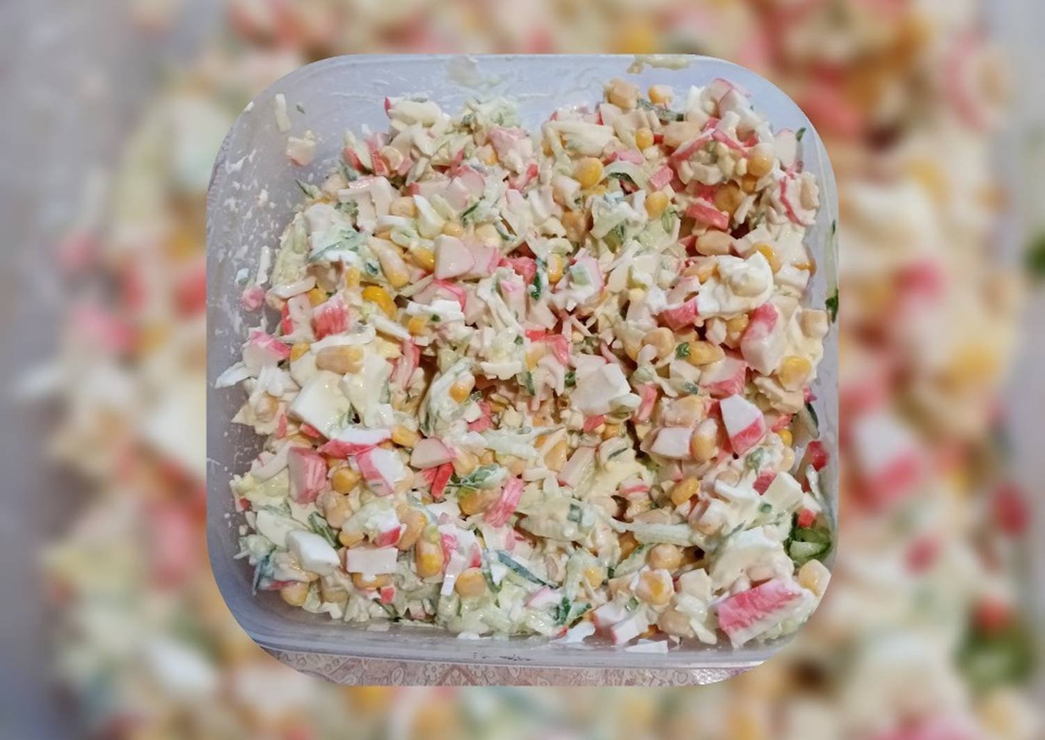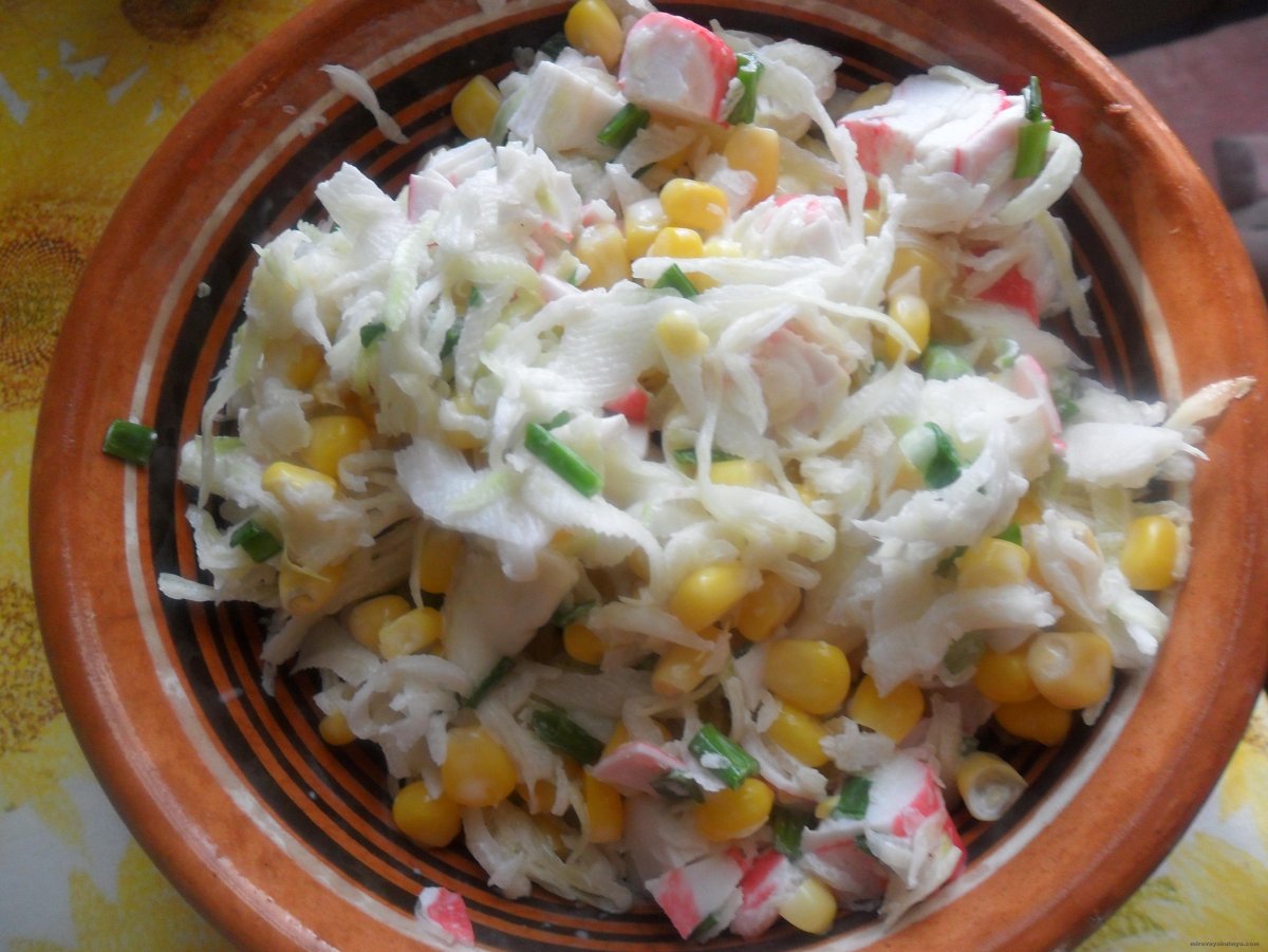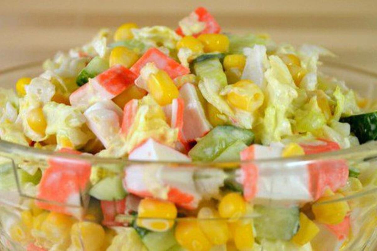 Салат с крабовыми палочками и кукурузой и капустой и огурцом
