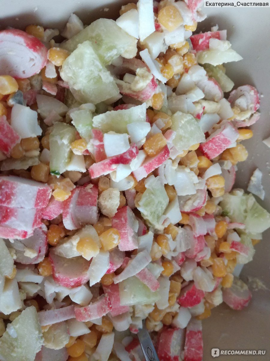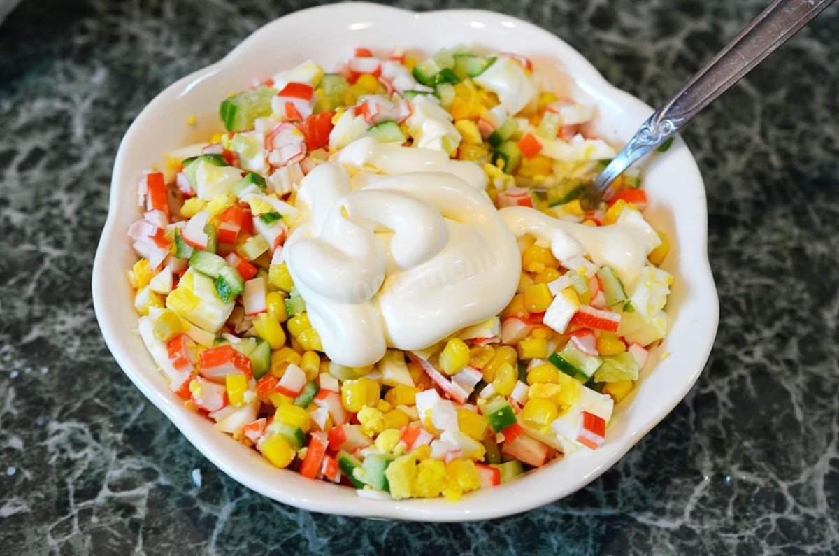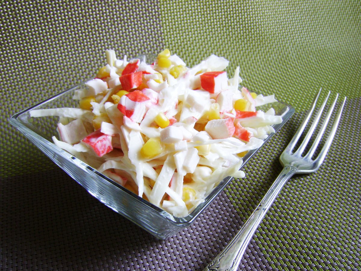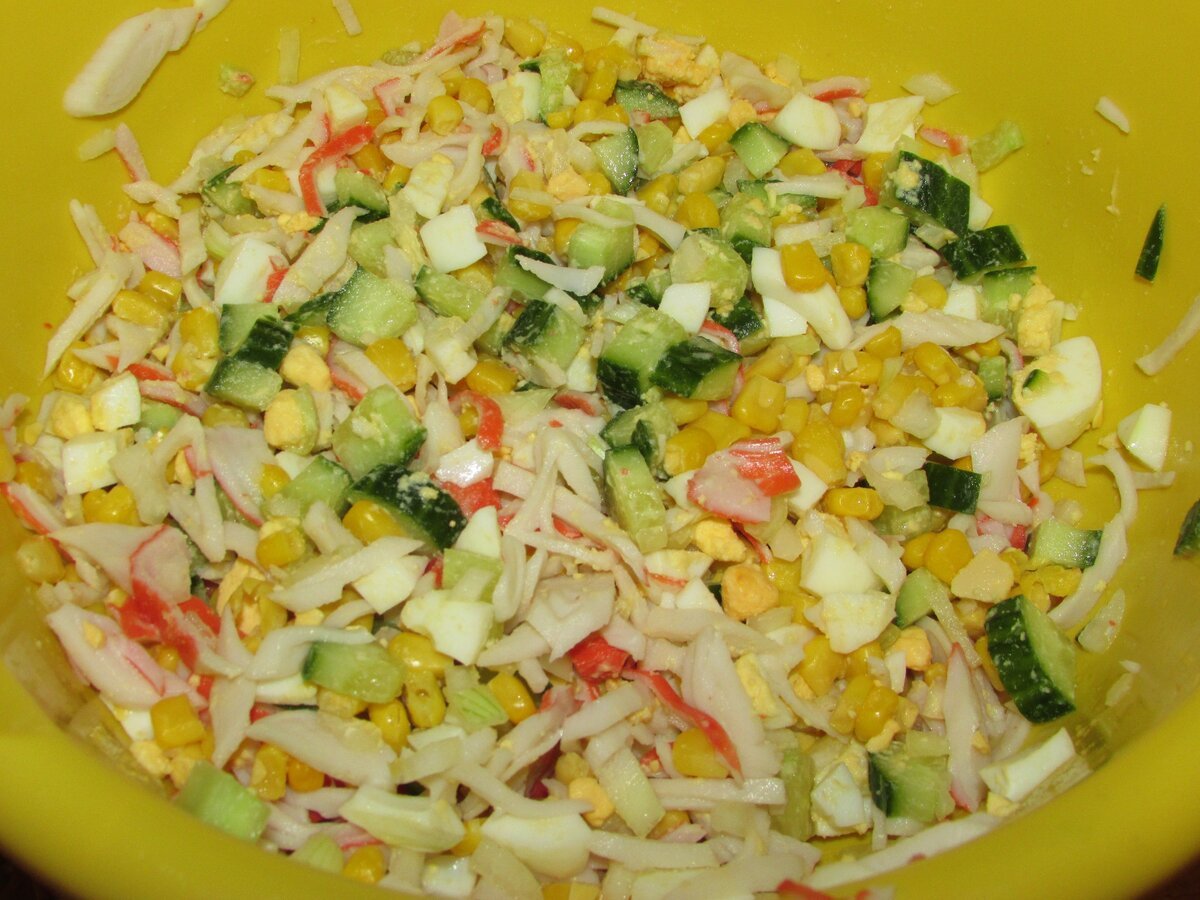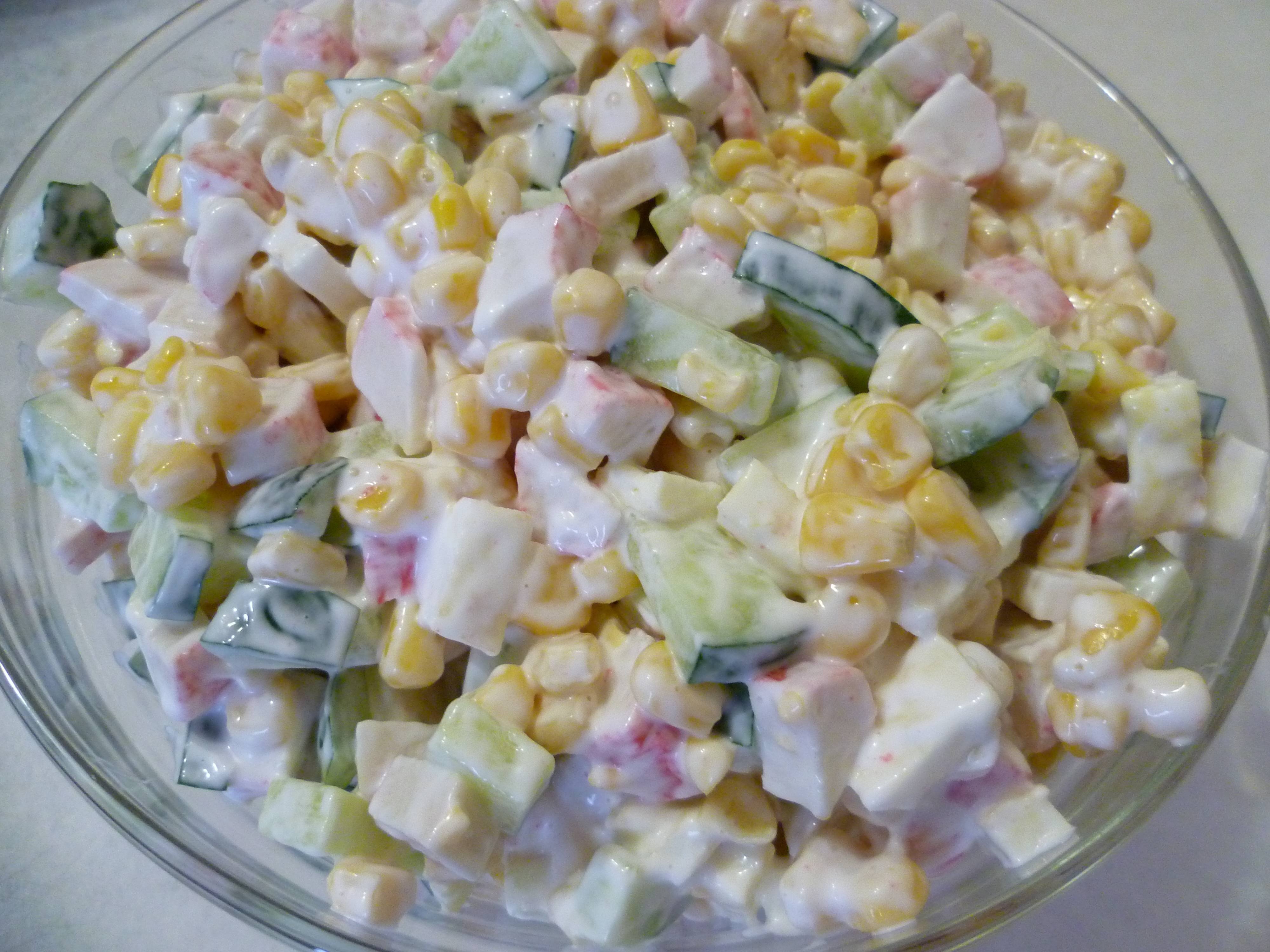 Салат с крабовыми палочками и кукурузой и капустой и огурцом