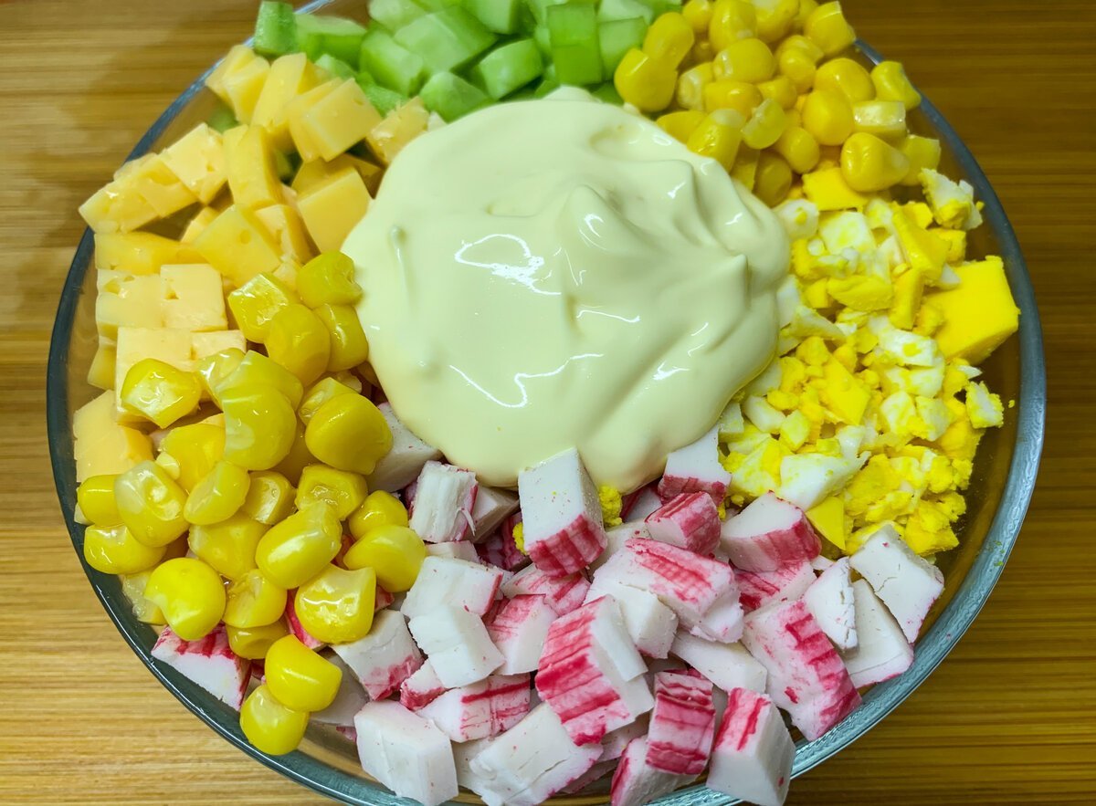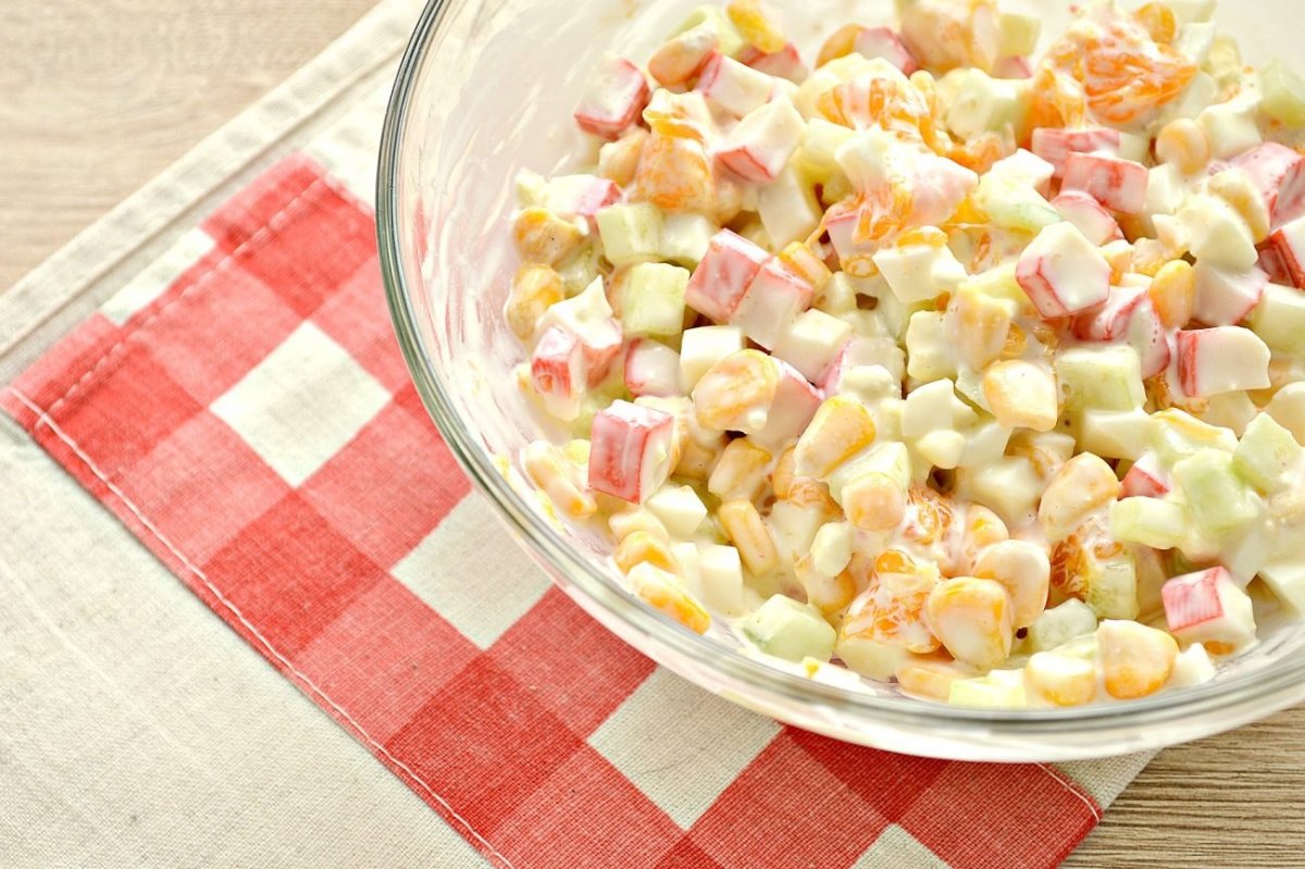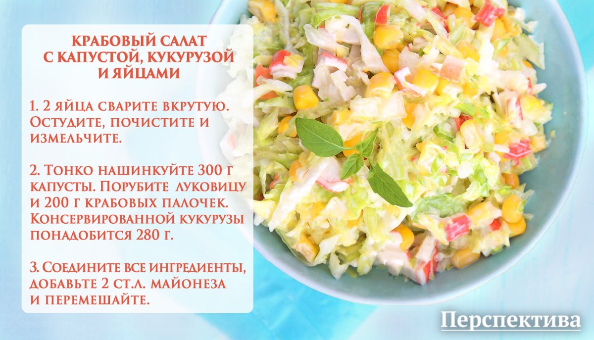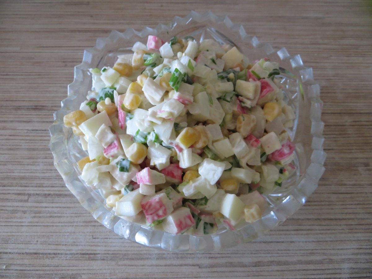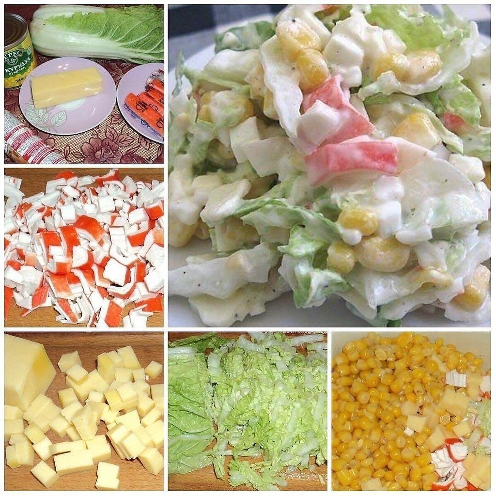 Салат с крабовыми палочками и кукурузой и капустой и огурцом