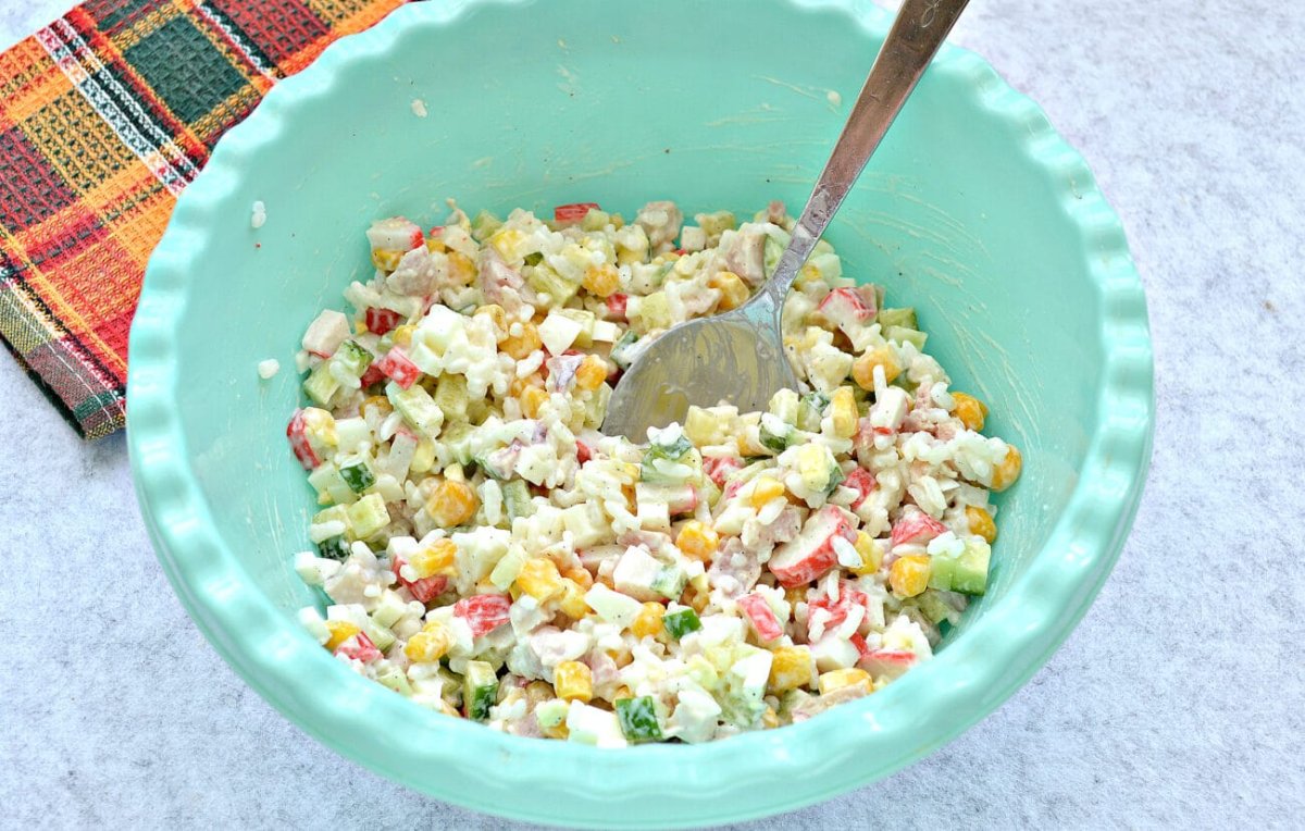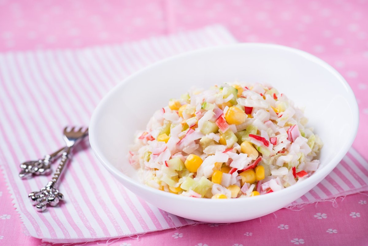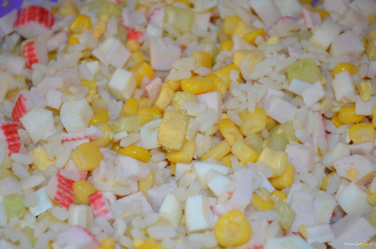 Салат с рисом и крабовыми палочками и кукурузой и огурцом