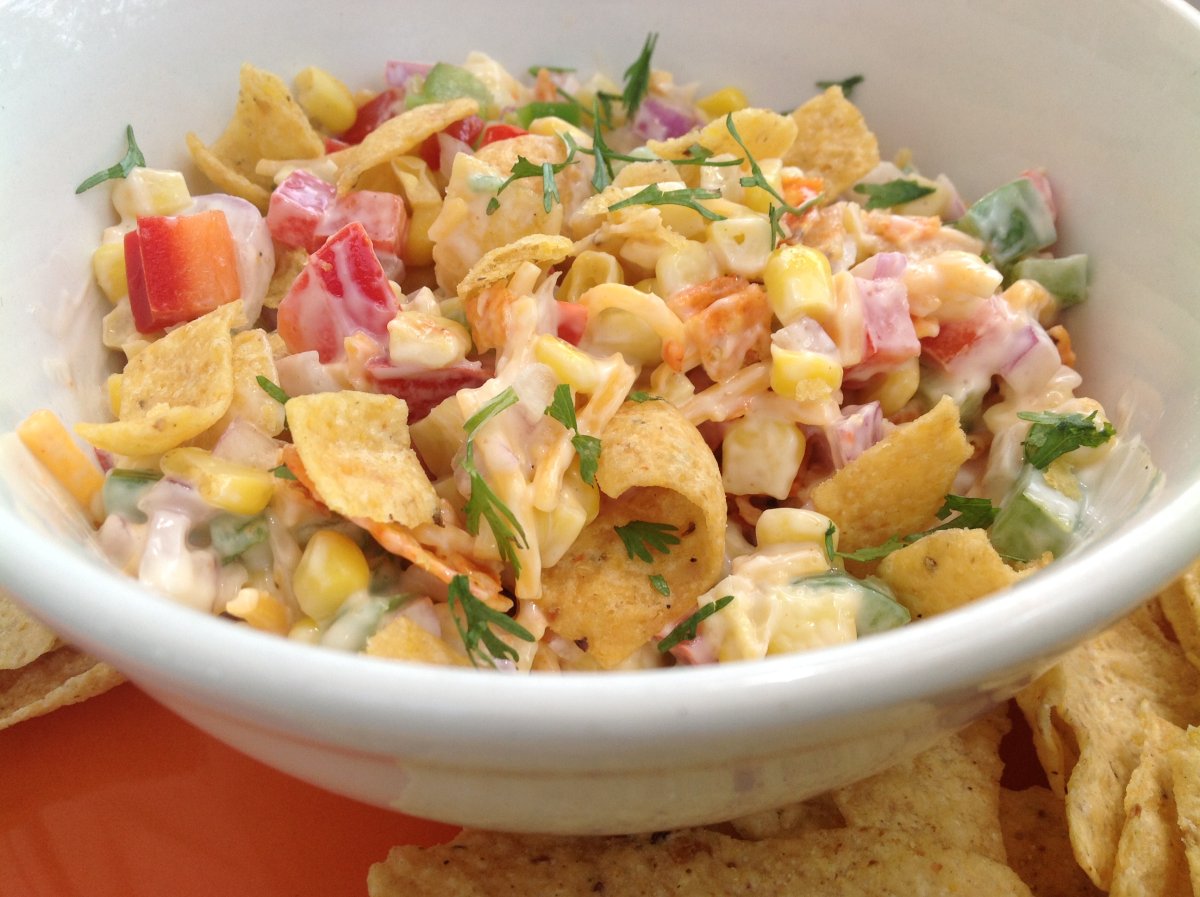 Салат с чипсами и кукурузой и колбасой и огурцами