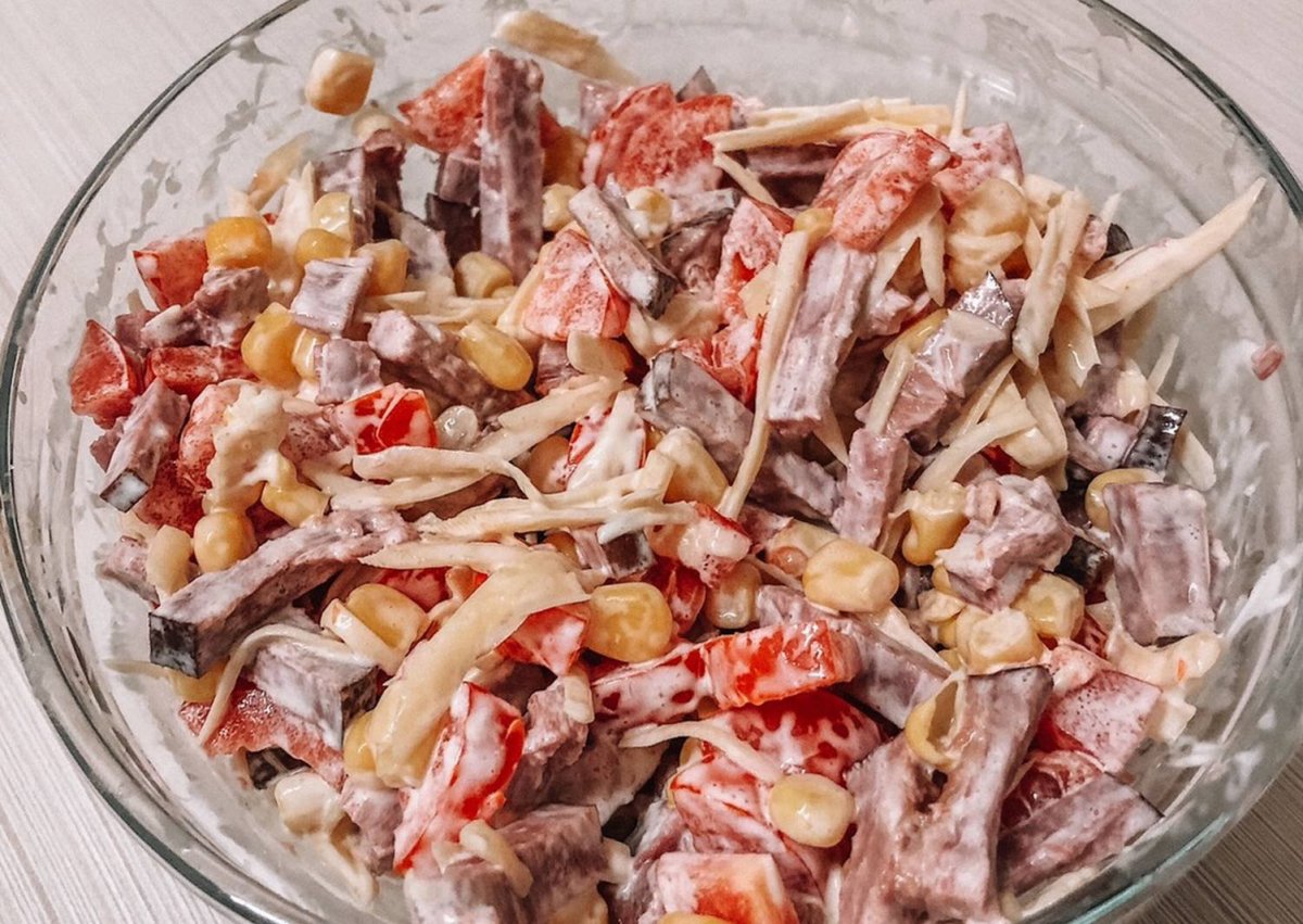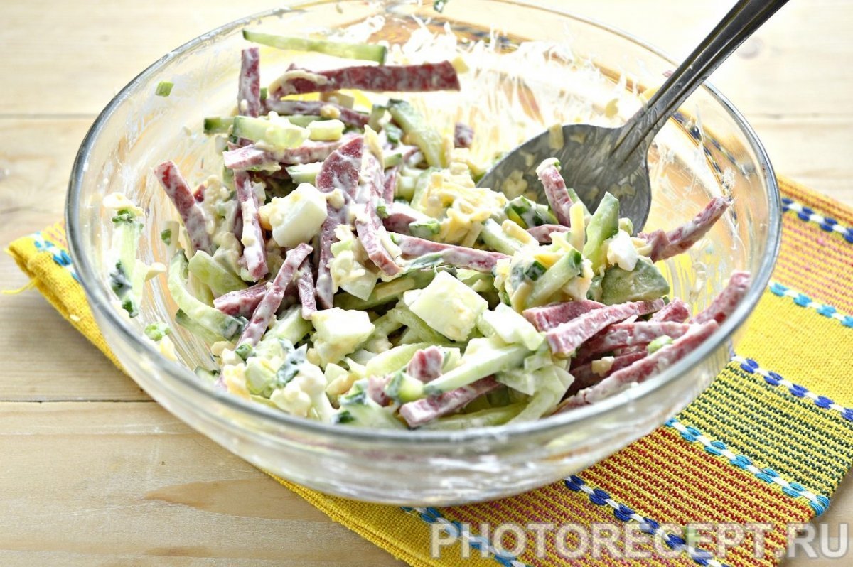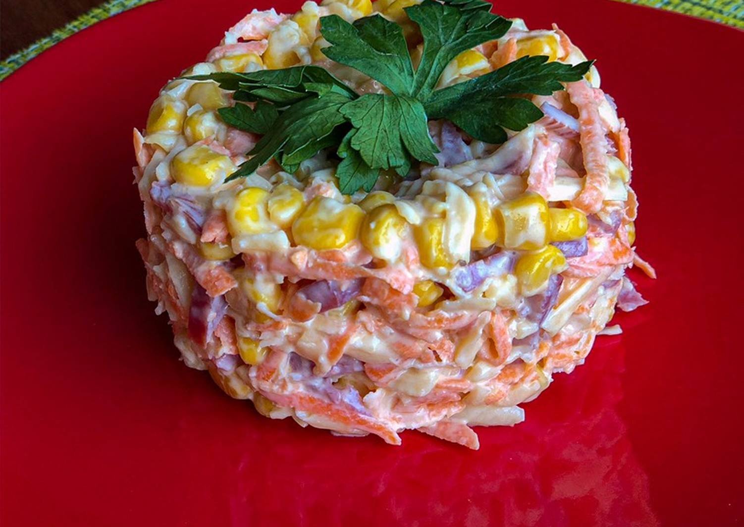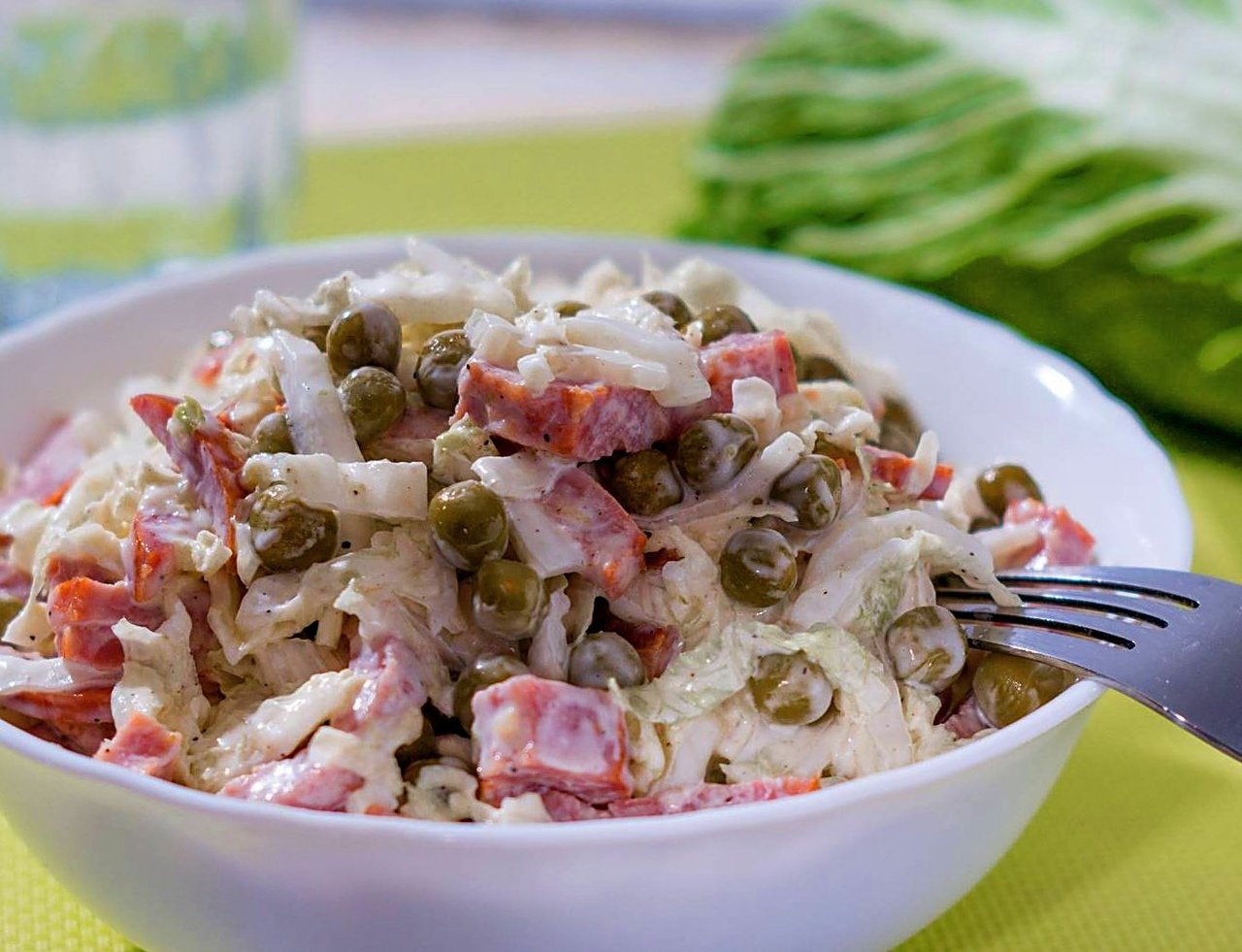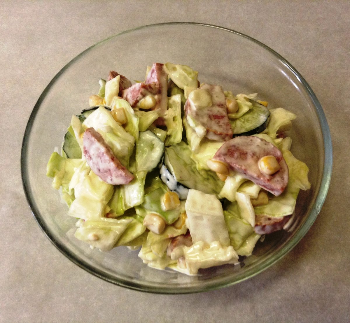 Салат из пекинской капусты с огурцом и кукурузой и колбасой копченой