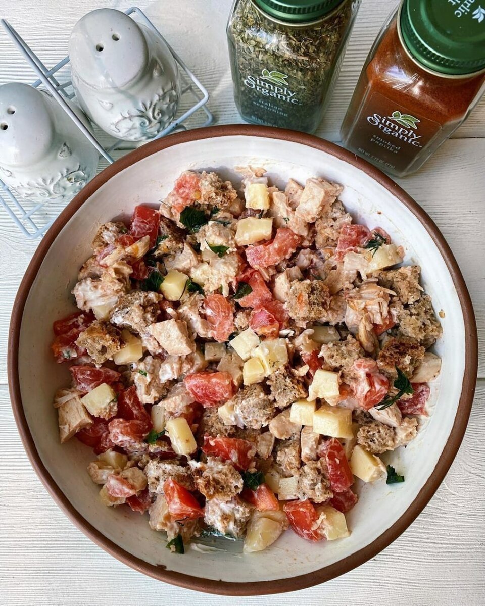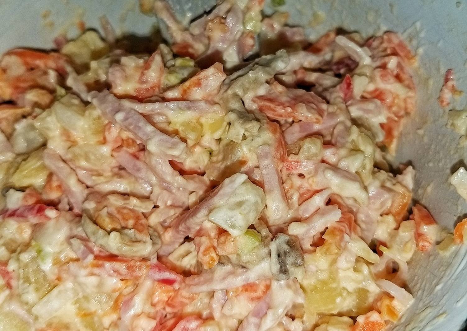 Салат с фасолью и сухариками и ветчиной и помидорами