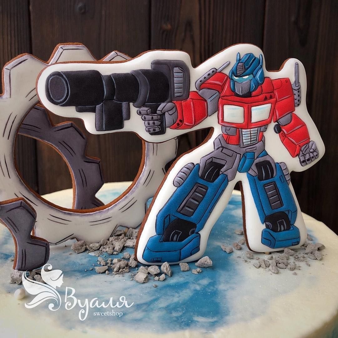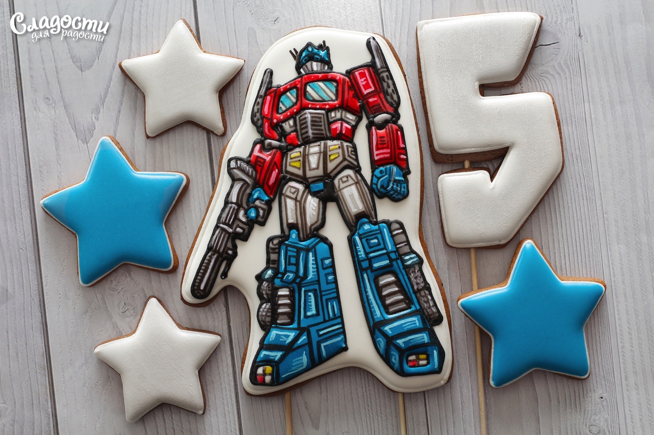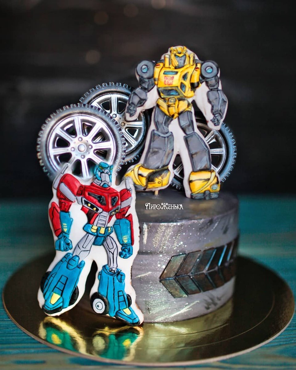 Торт на 6 лет мальчику с пряниками Бамблби и Оптимус Прайм