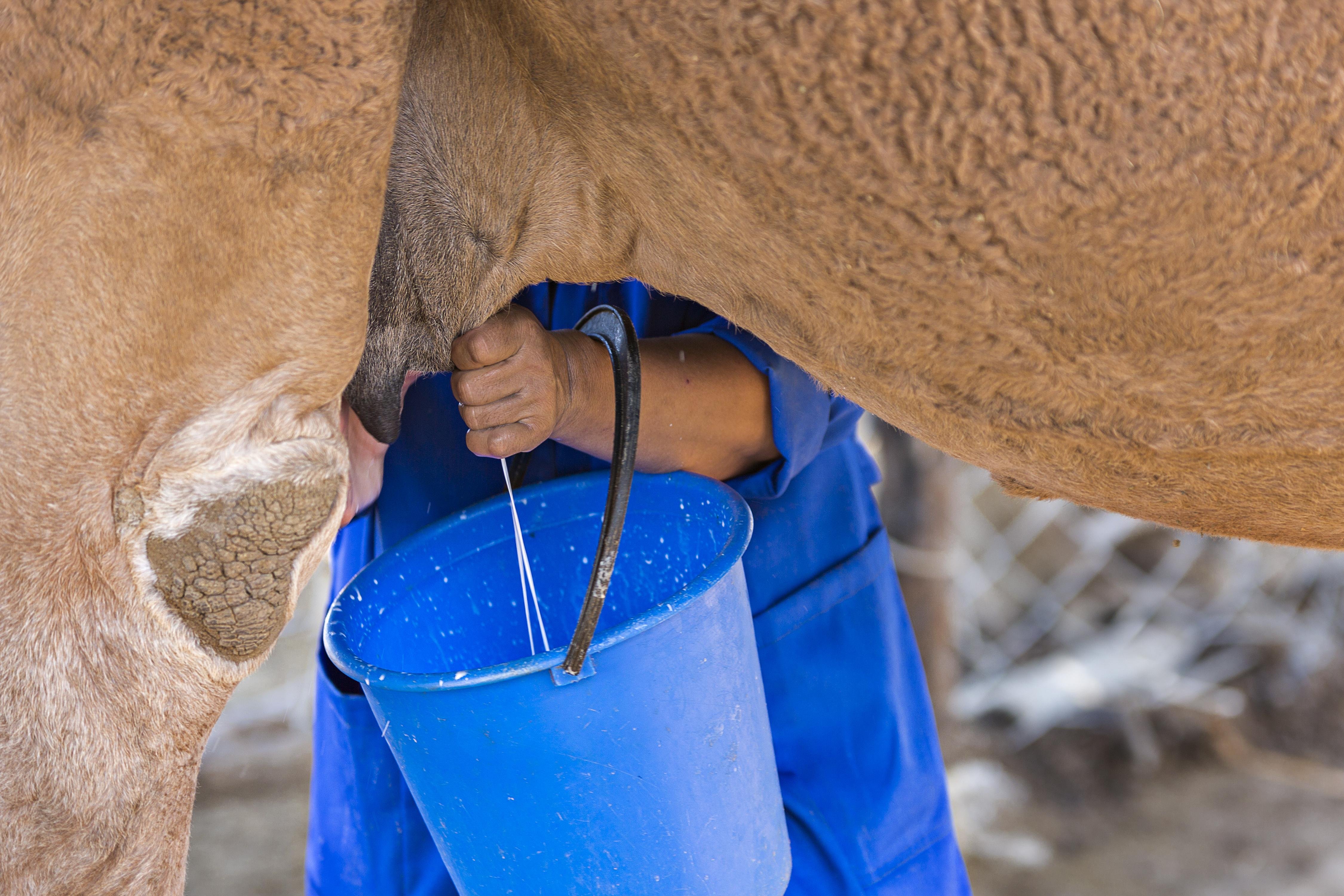Мужчина доит верблюда