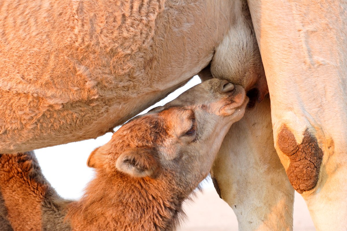 Верблюжонок пьет молоко