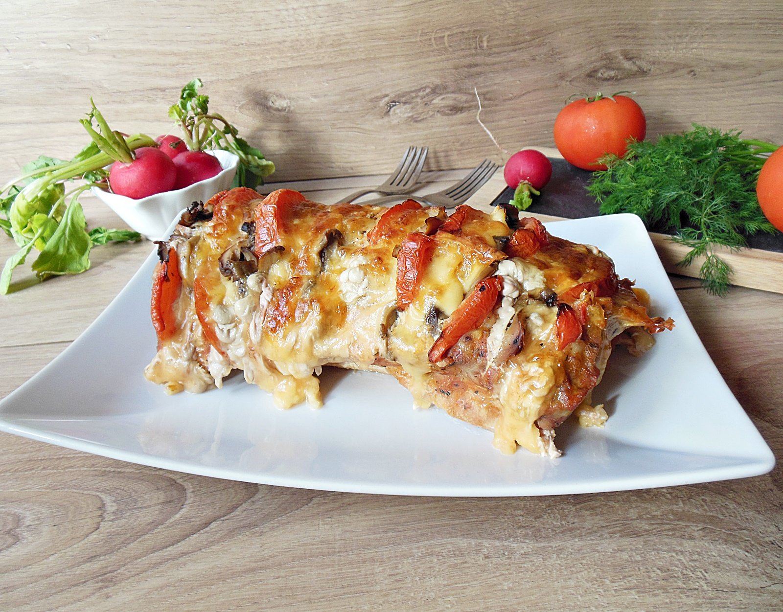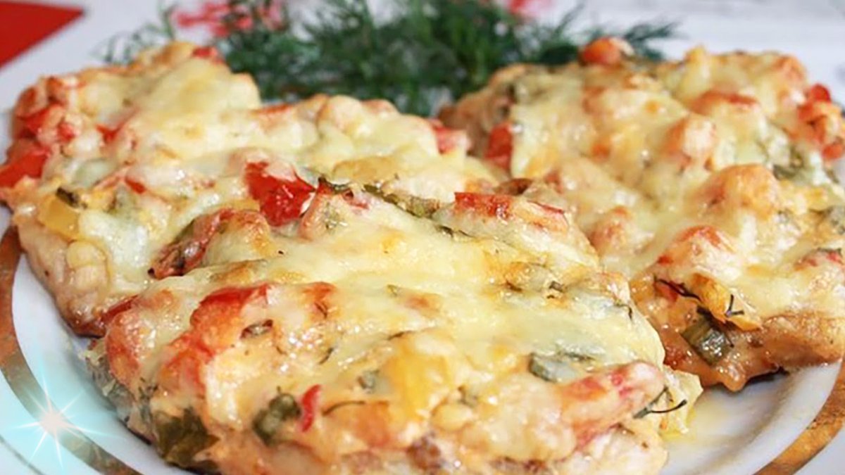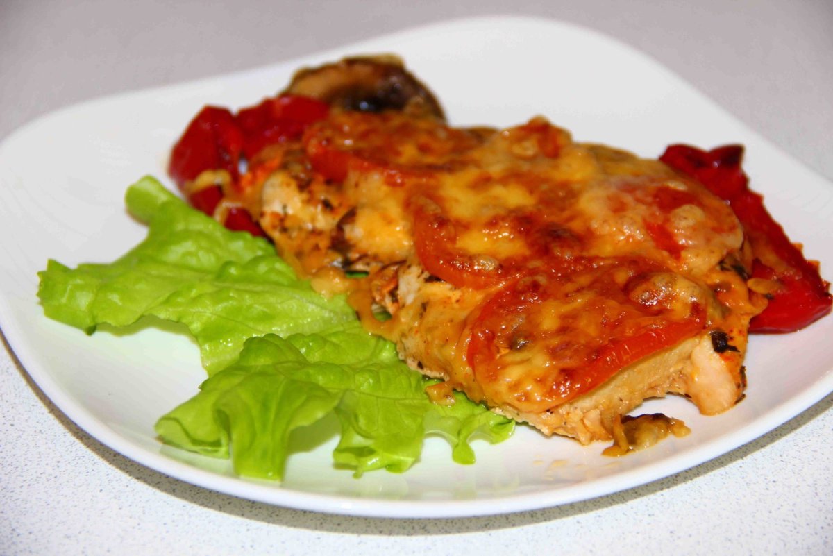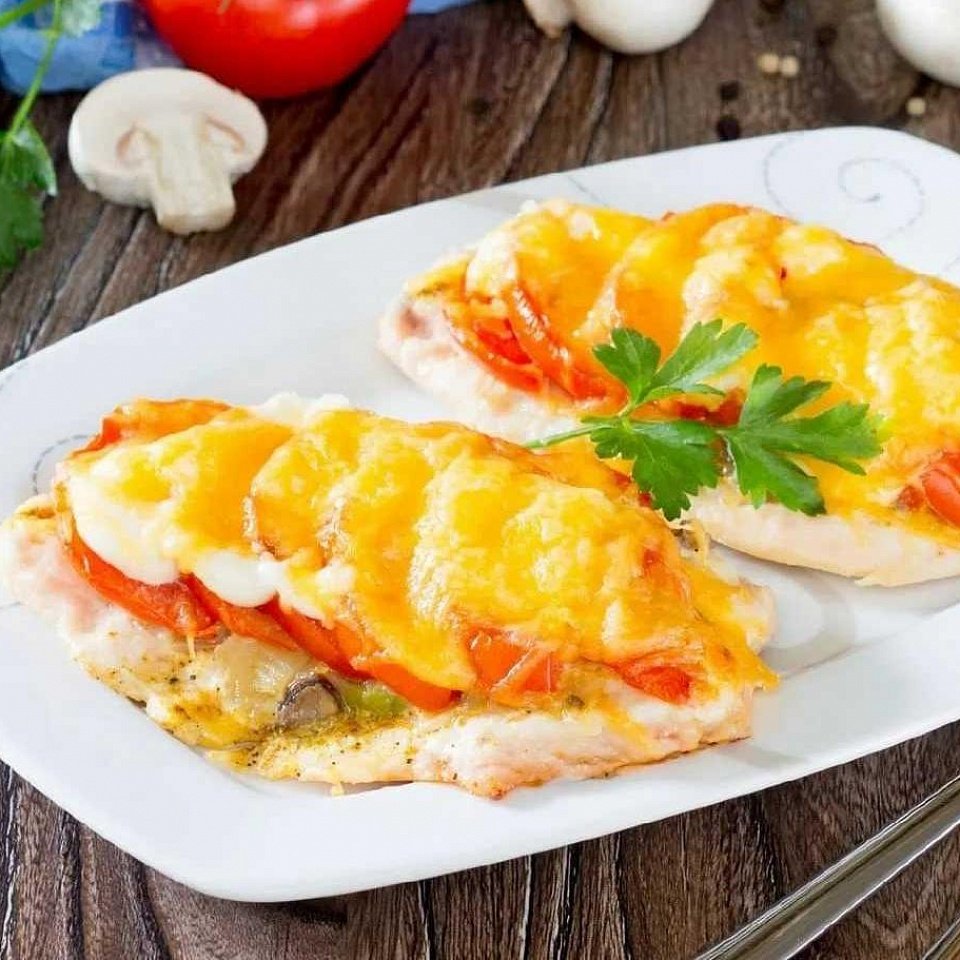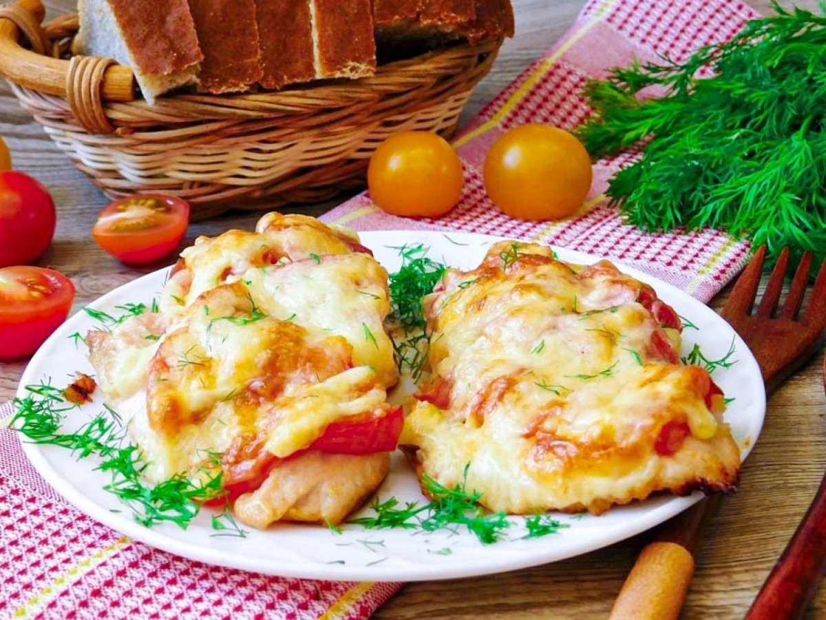 Куриная грудка под шубой в духовке с помидорами и сыром