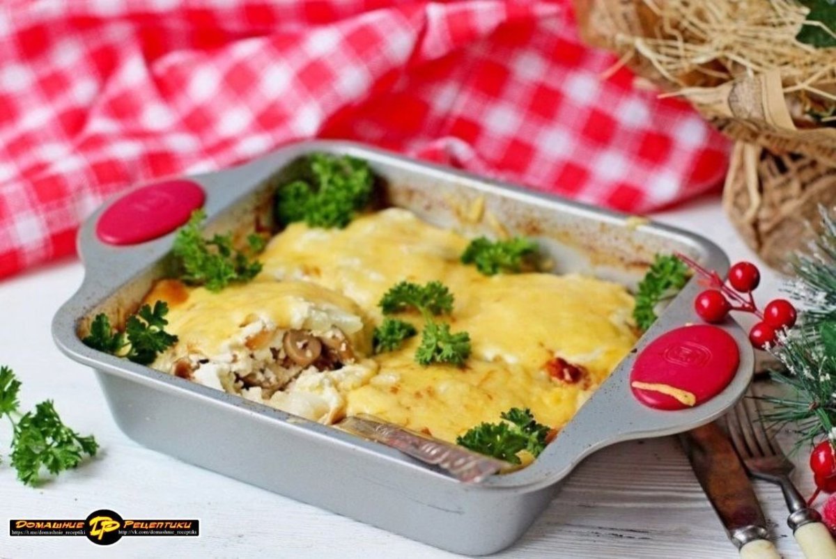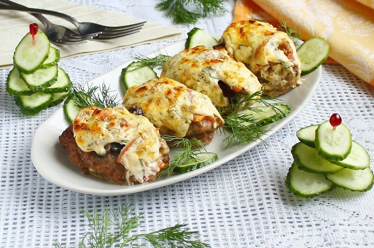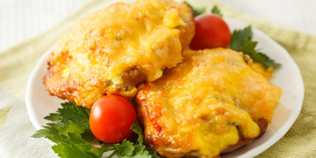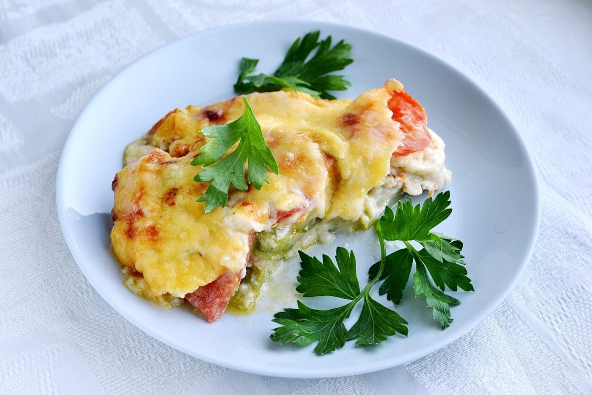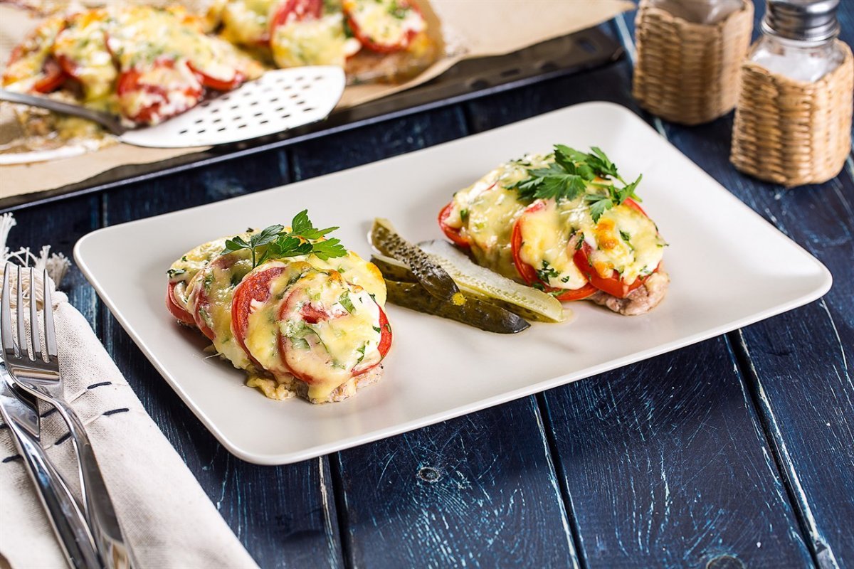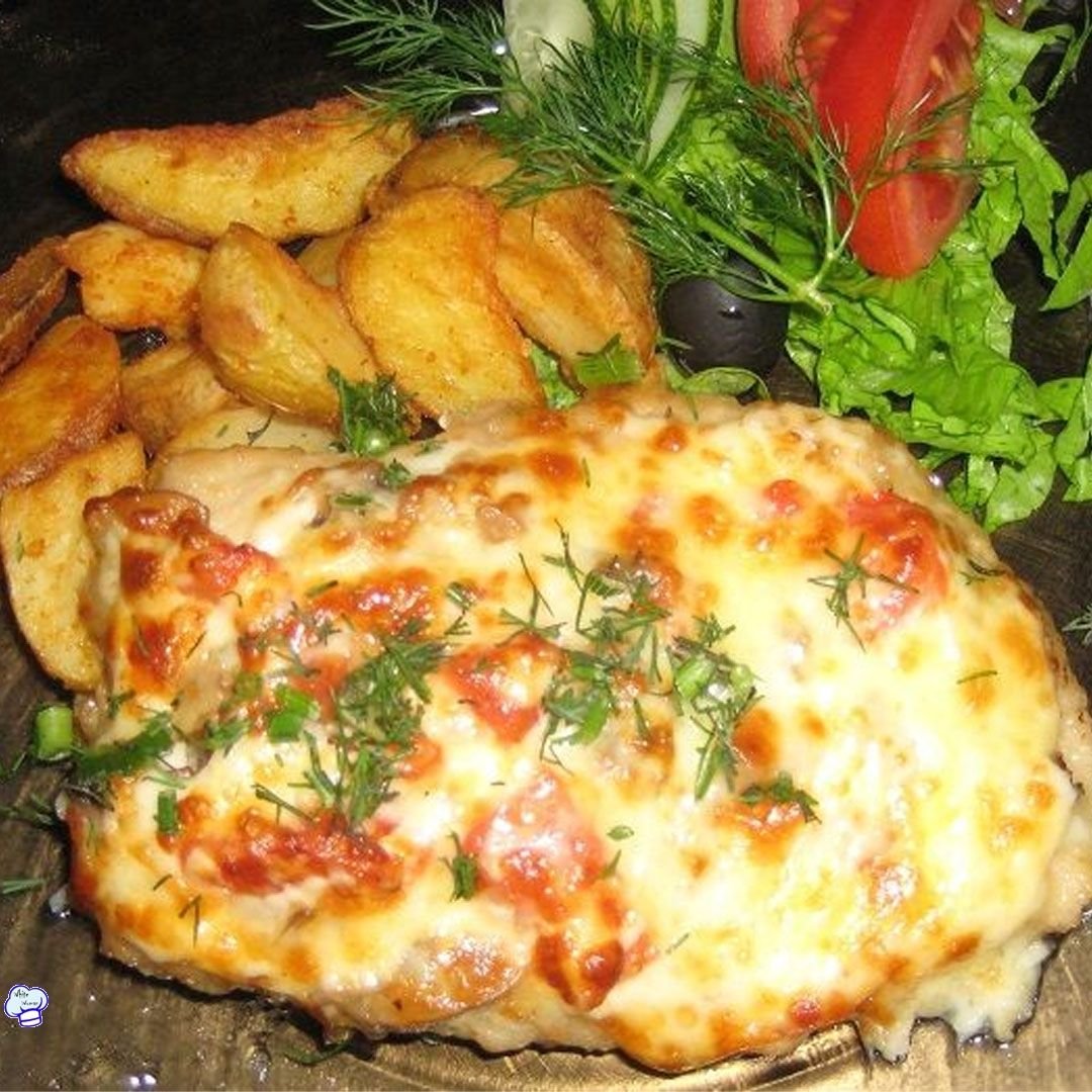 Куриная грудка под шубой в духовке с помидорами и сыром