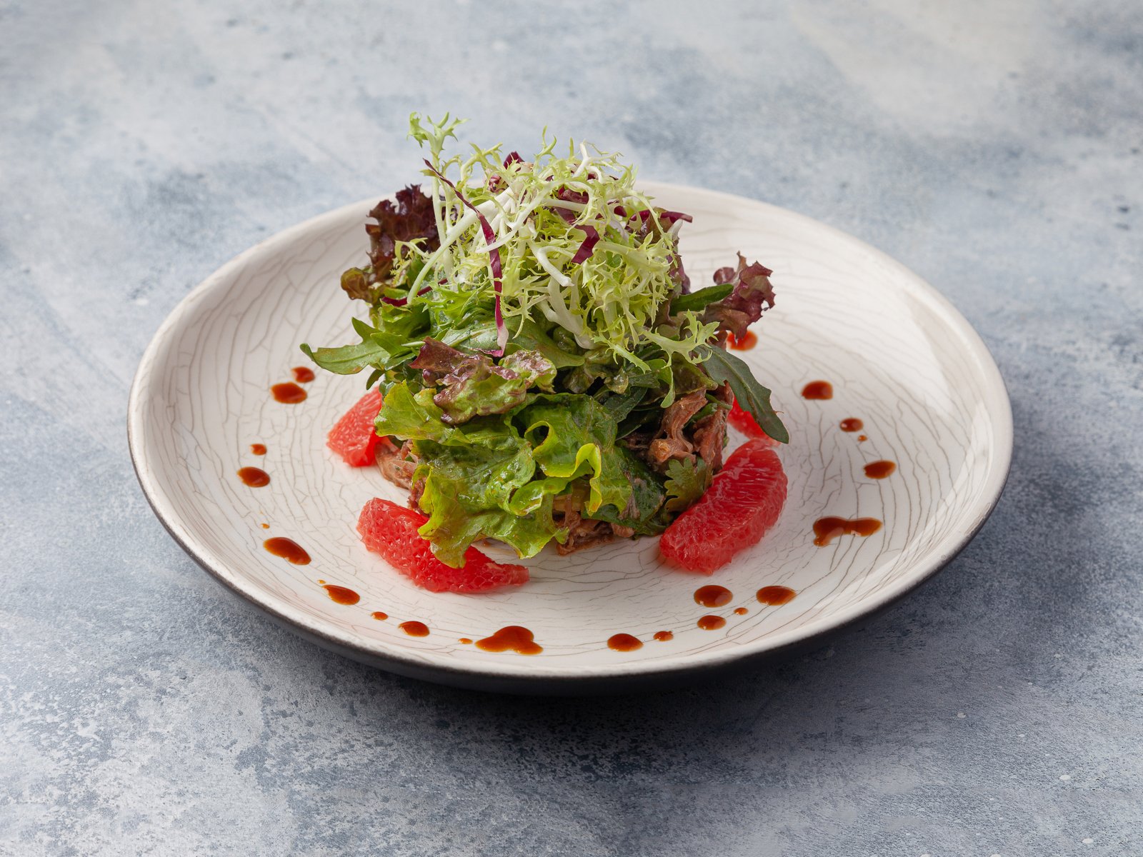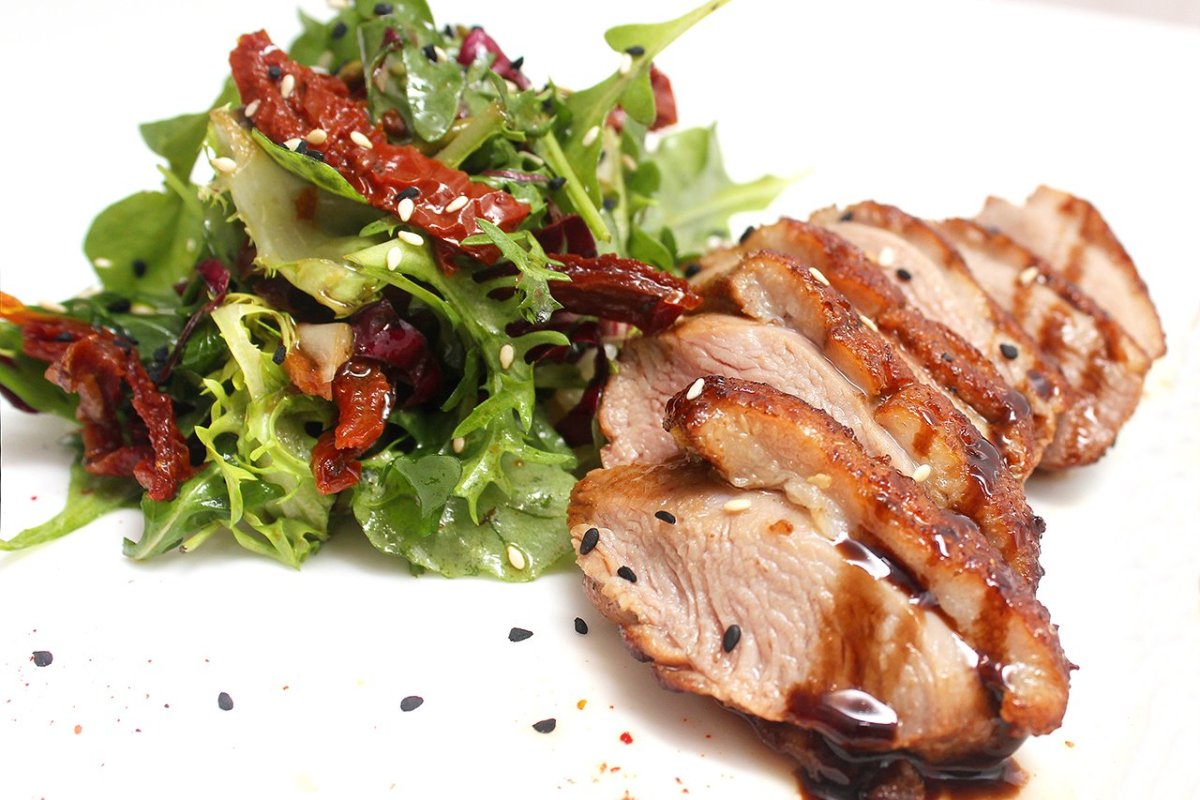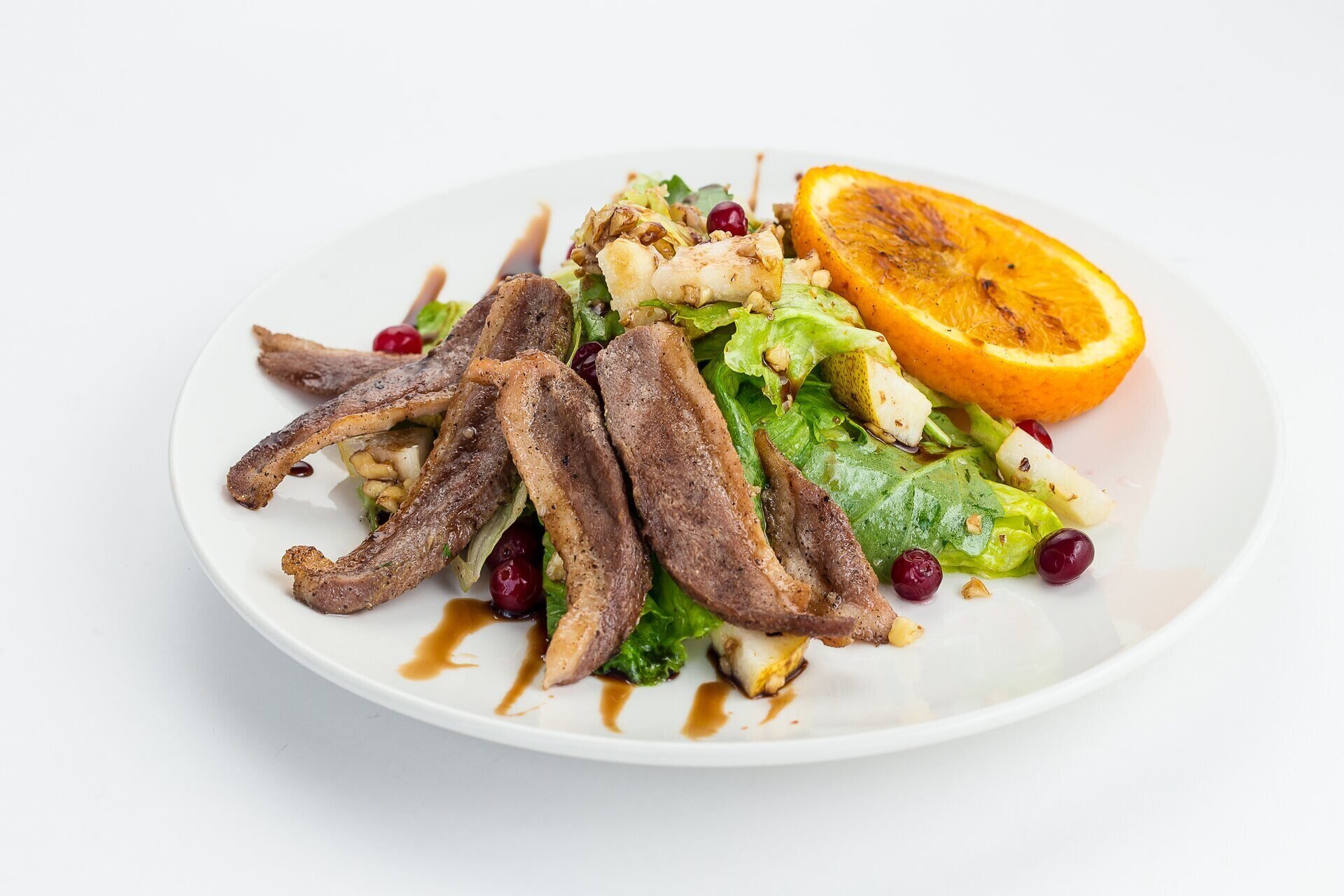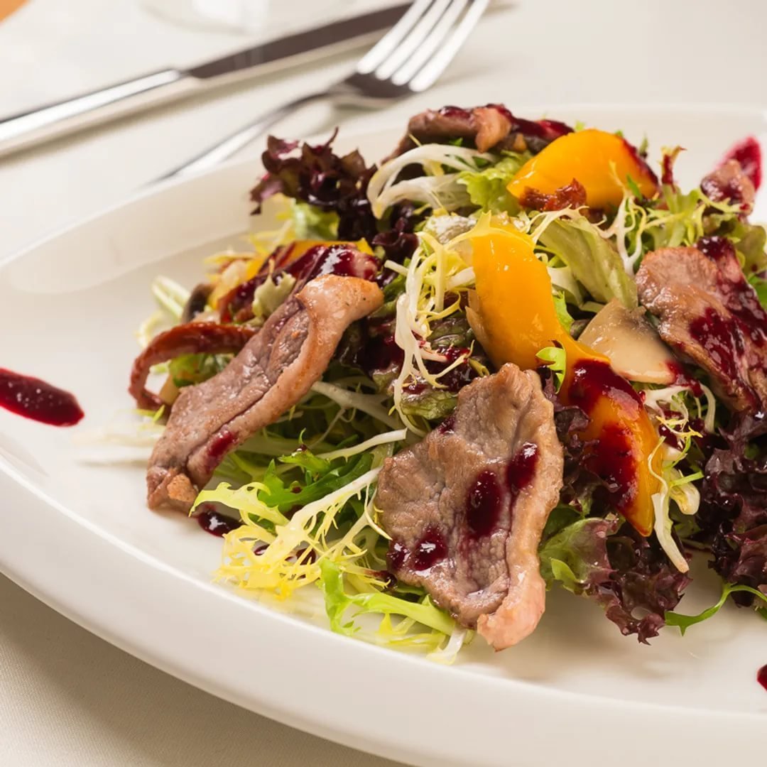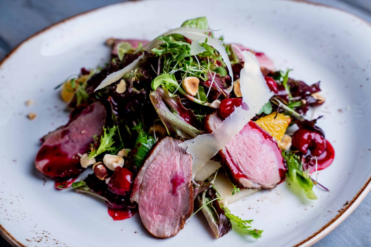 Тёплый салат с утиной грудкой и вишнёвым конфи