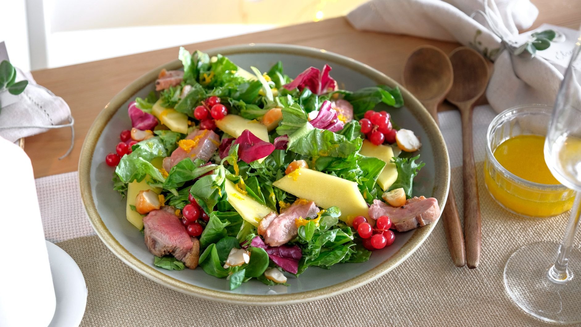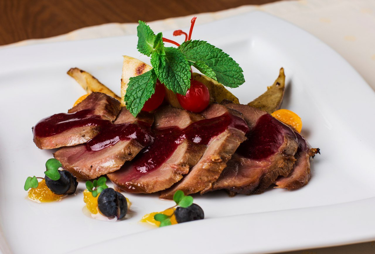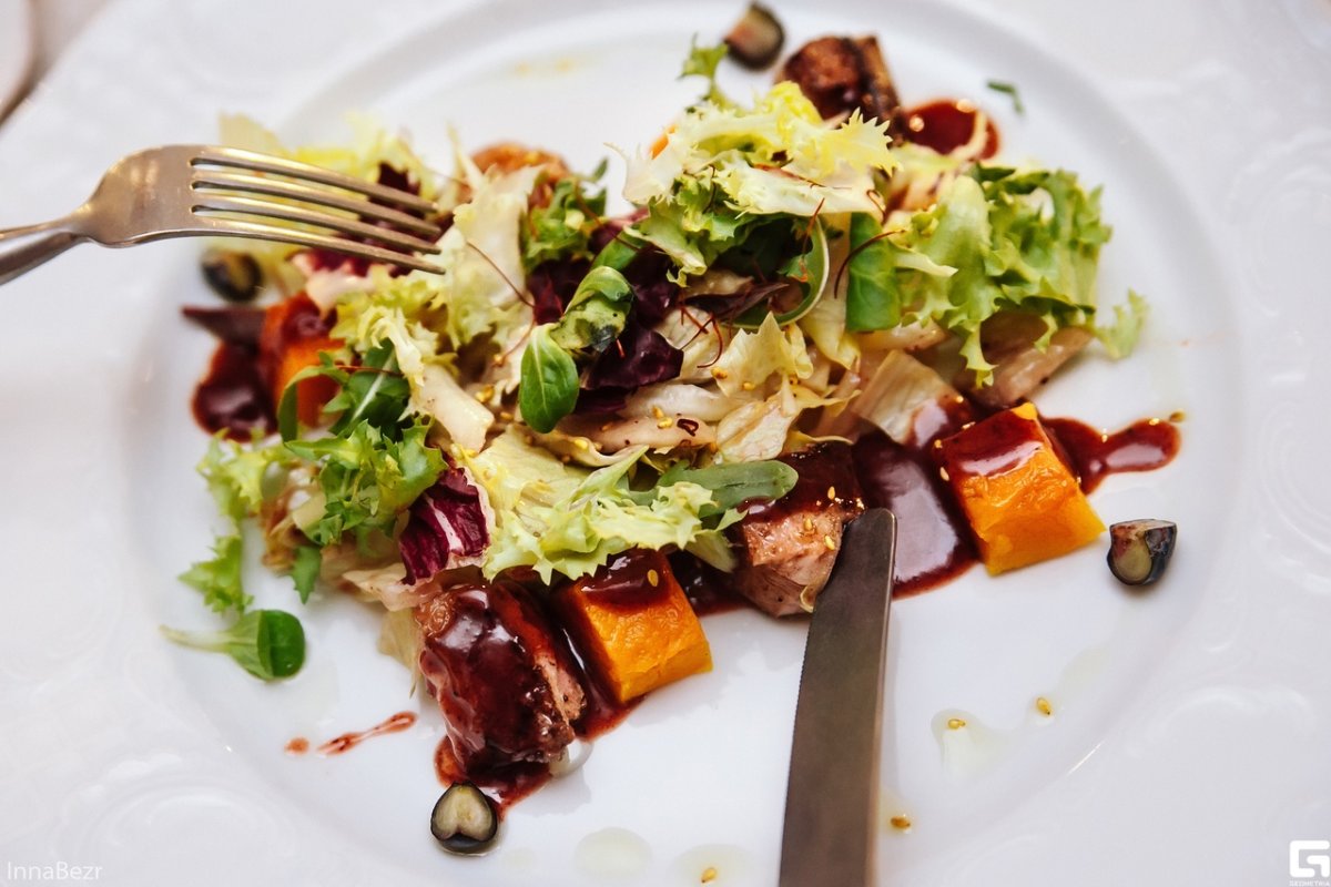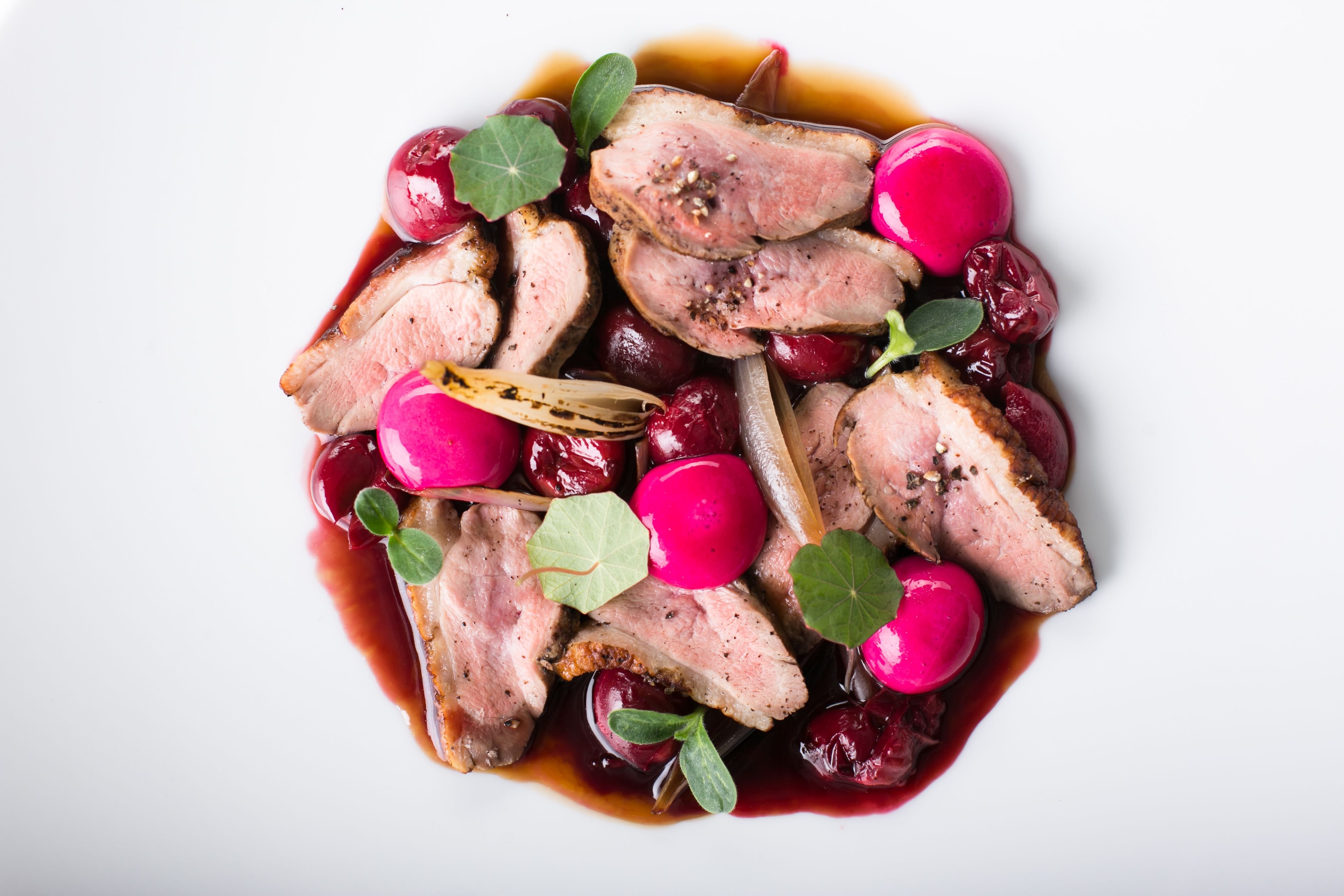 Тёплый салат с утиной грудкой и вишнёвым конфи