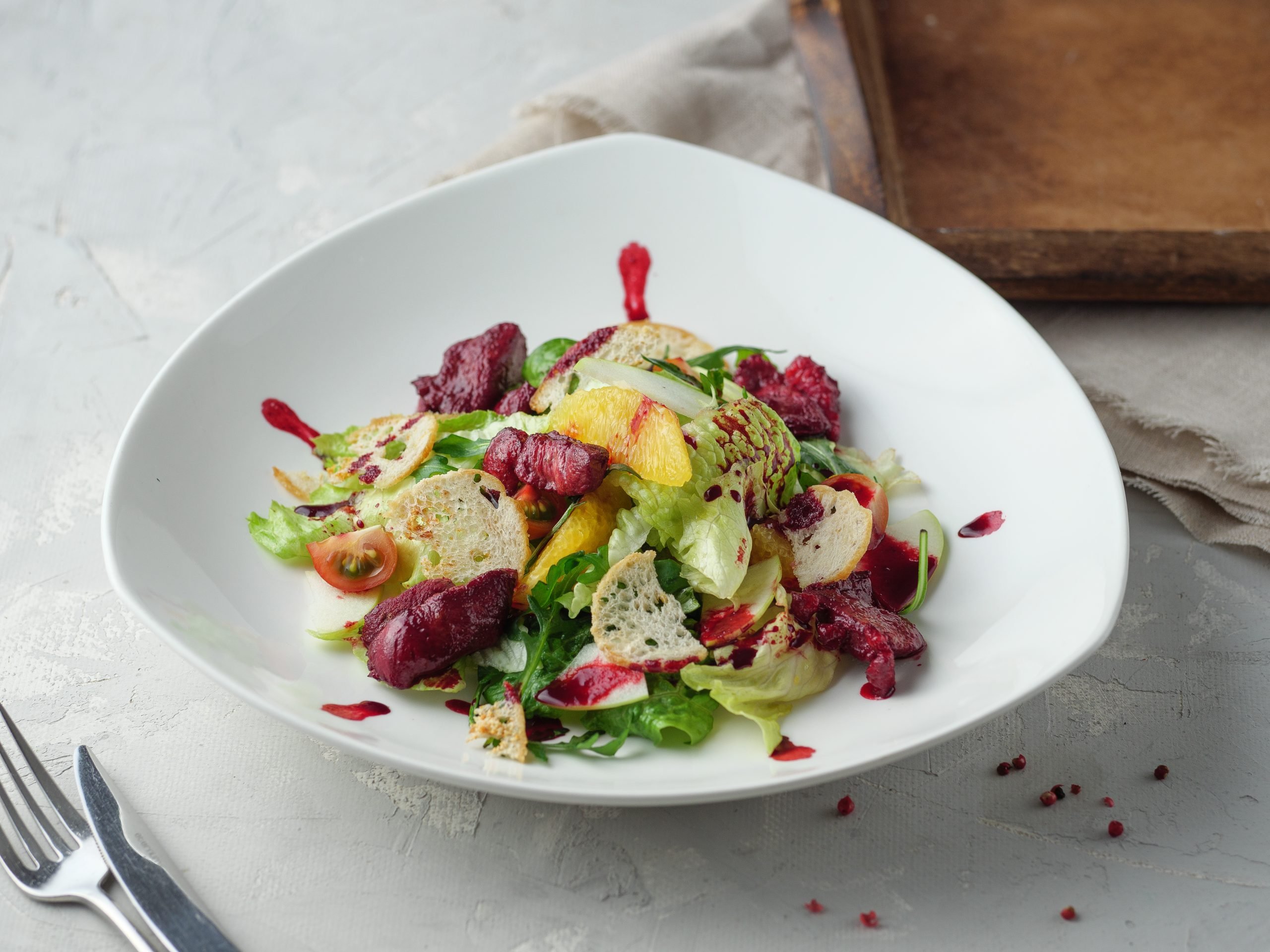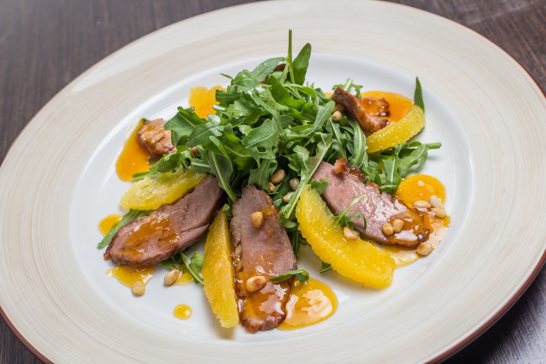 Тёплый салат с утиной грудкой картошкой и апельсинами