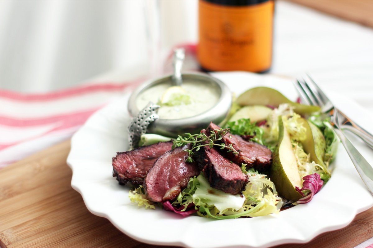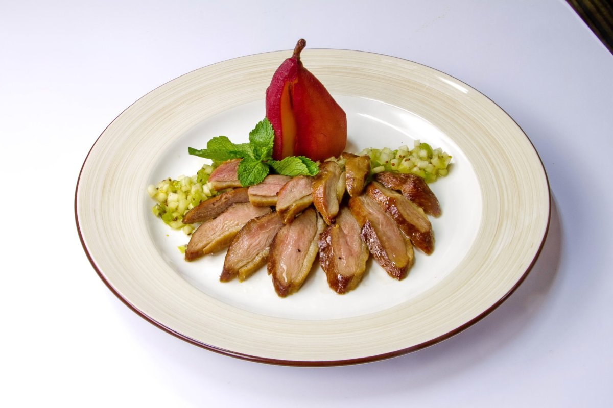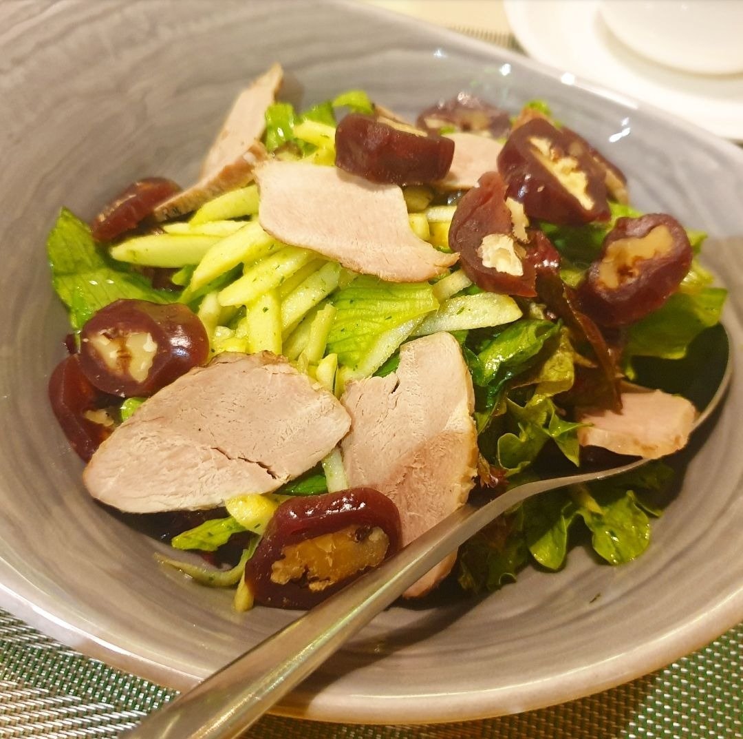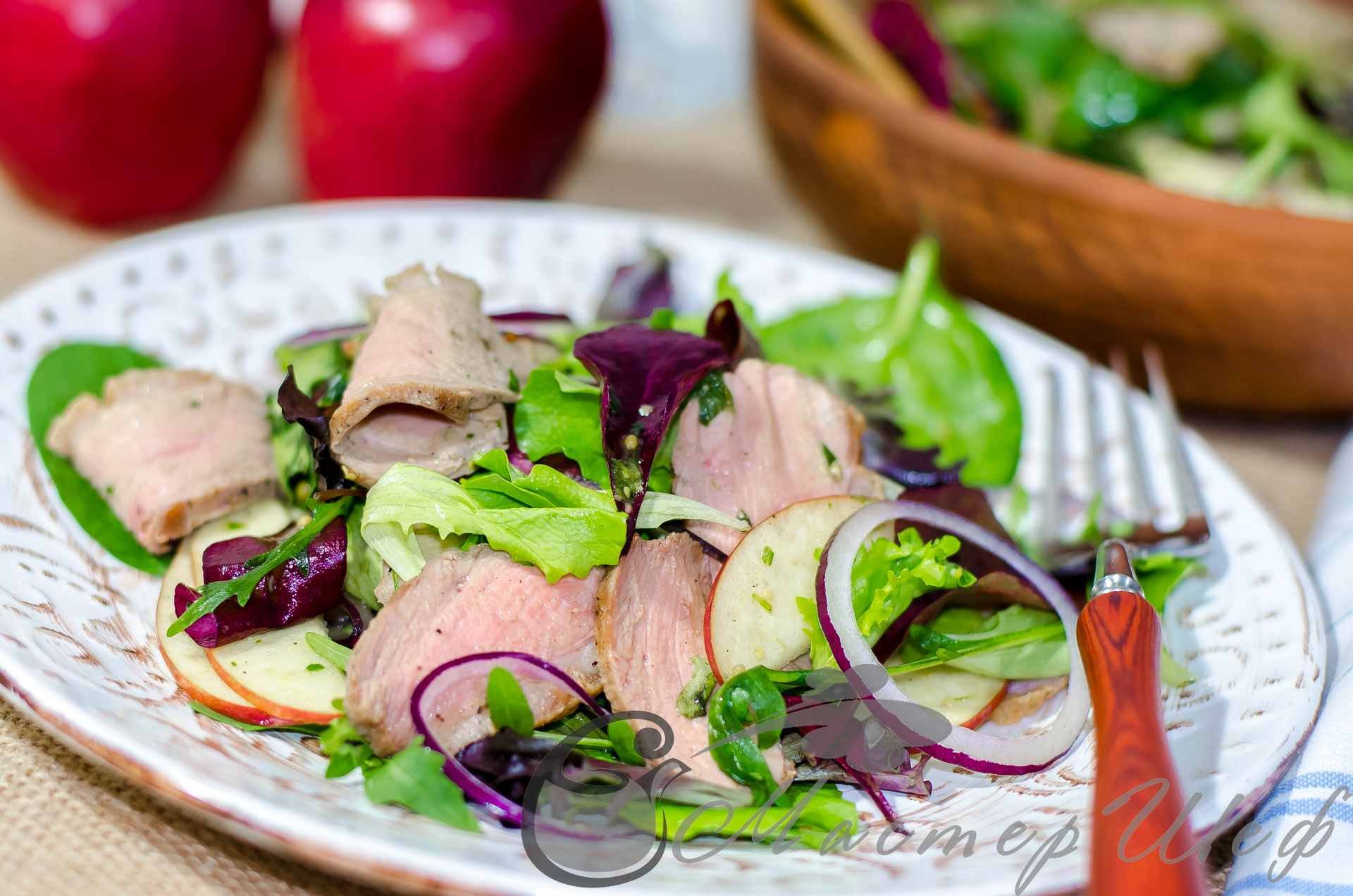 Салат с копчёной уткой и свежей грушей с соусом терияки