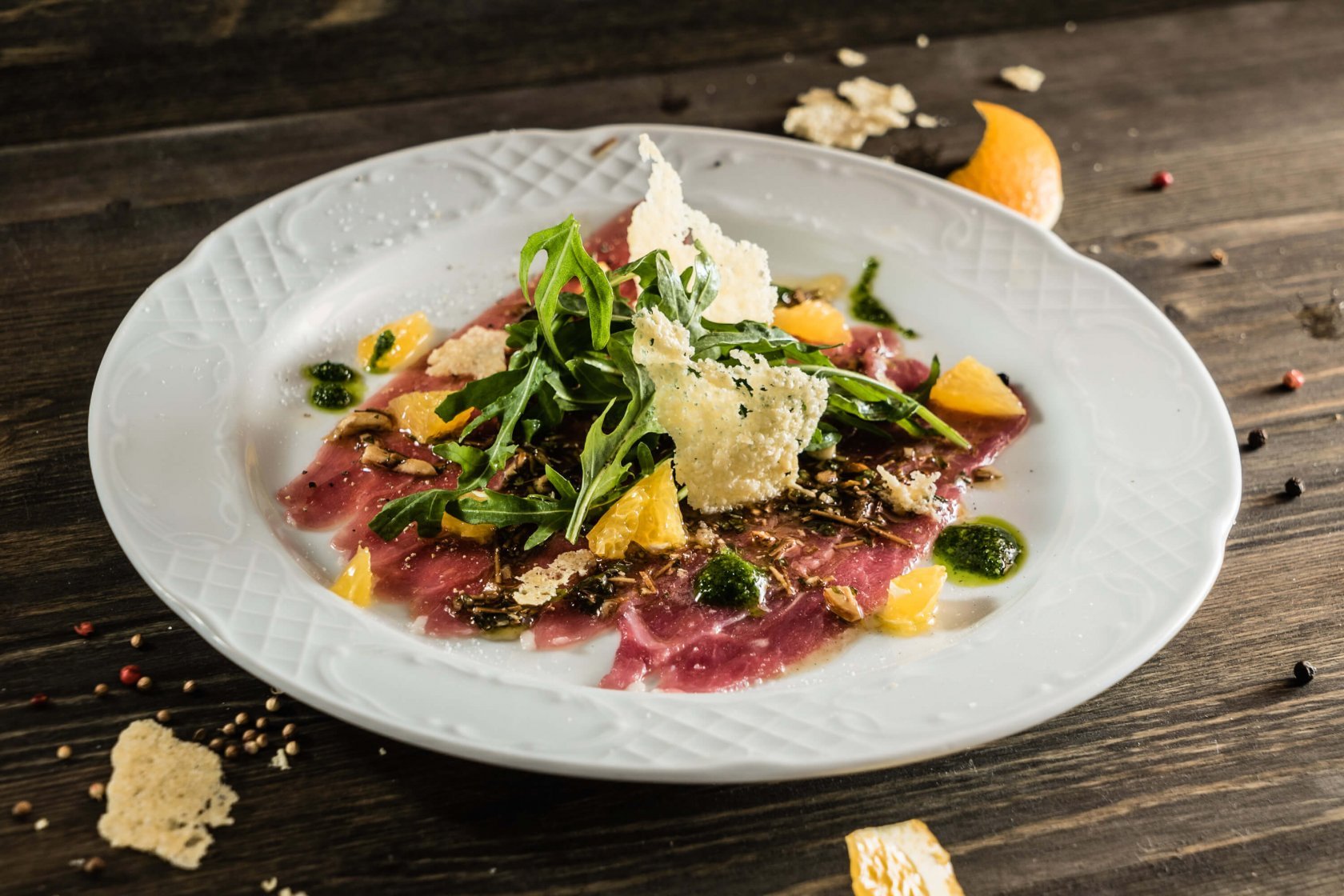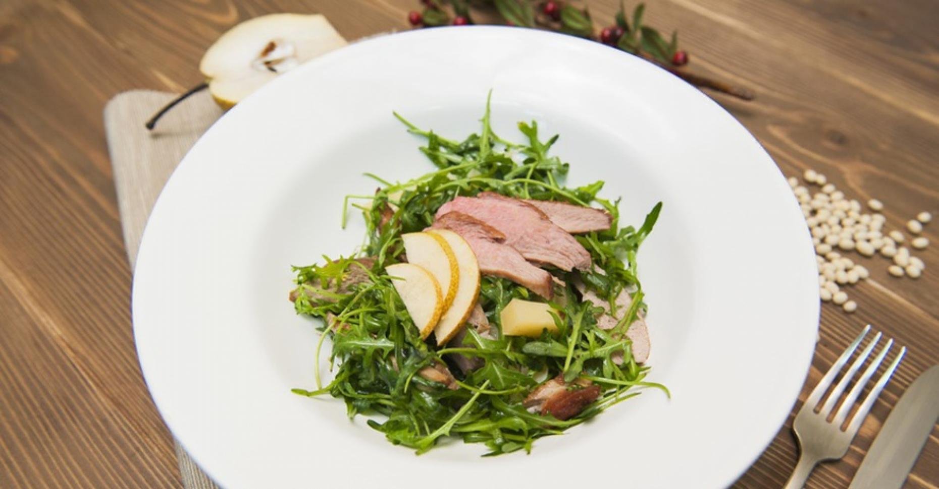 Салат из утиной грудки с рукколой и кедровыми орешками