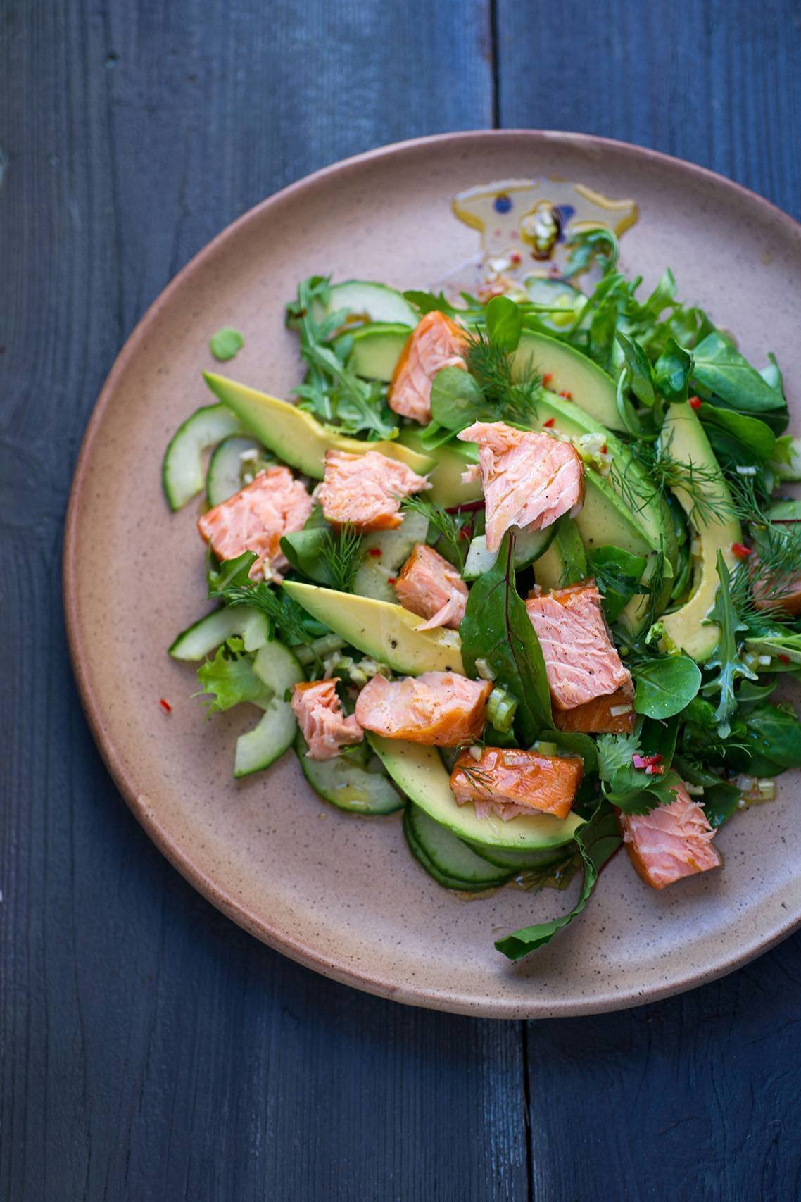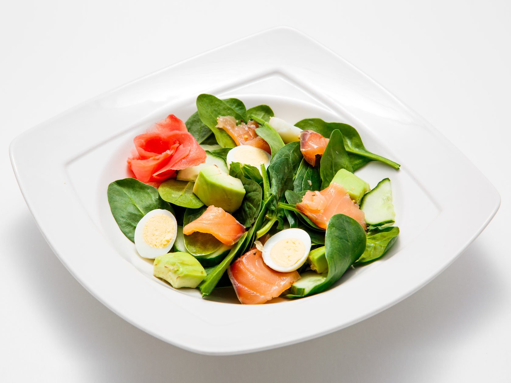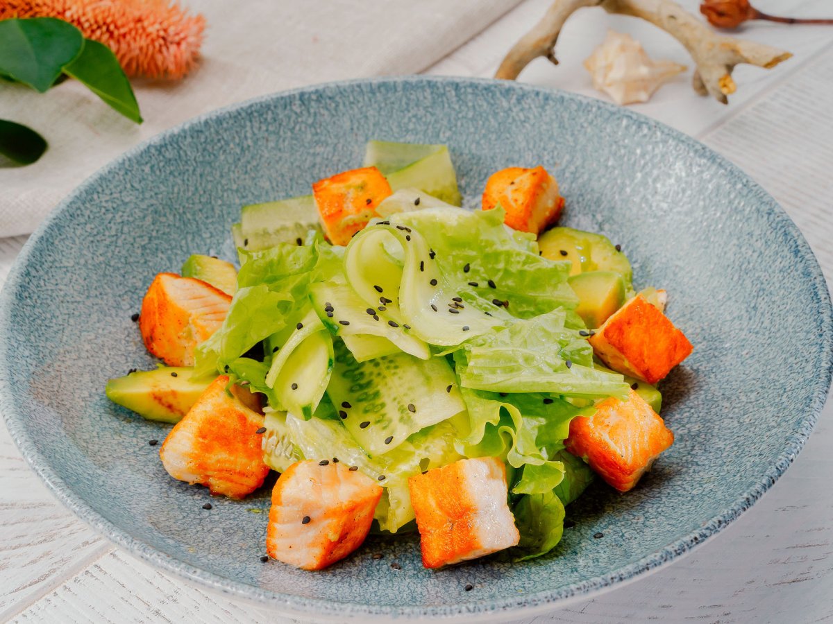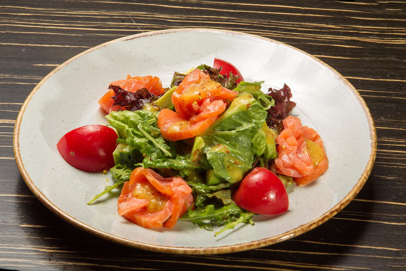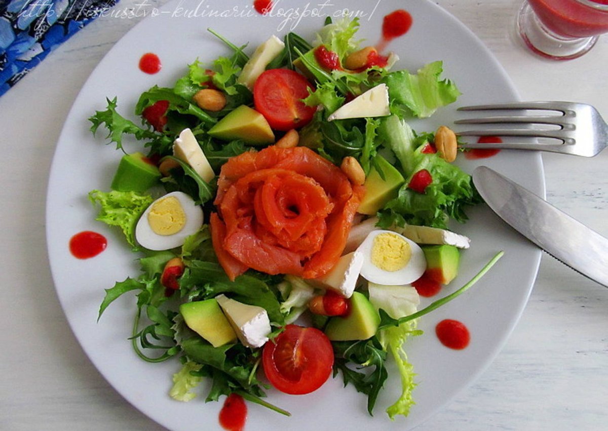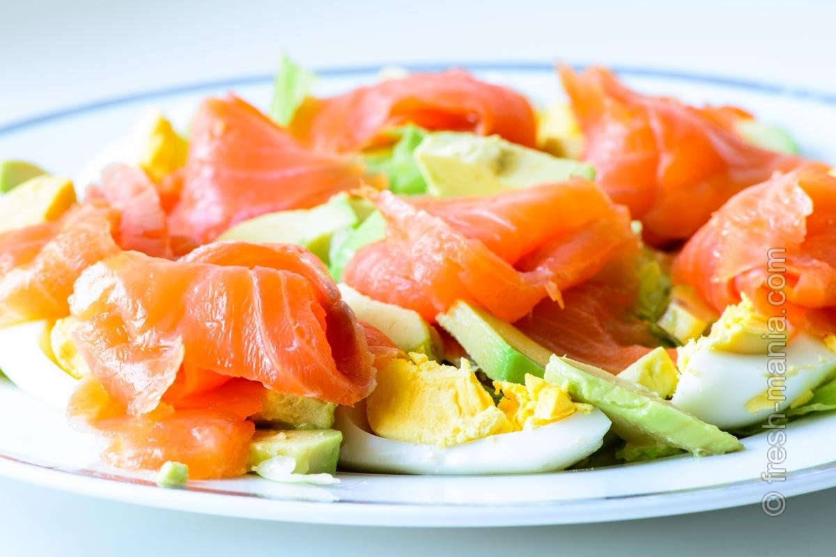 Салат с авокадо и красной рыбой и огурцом и яйцом