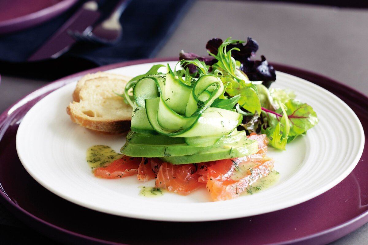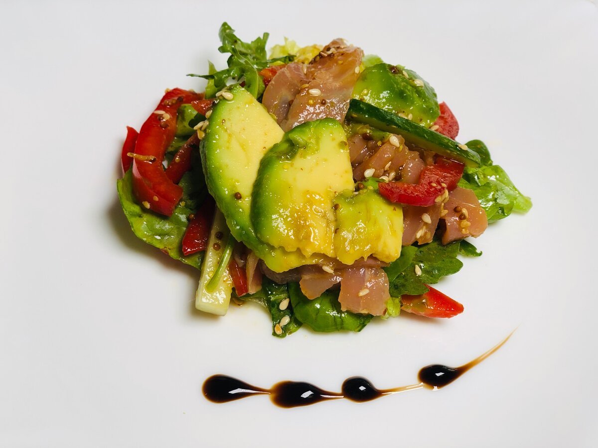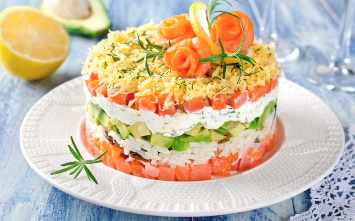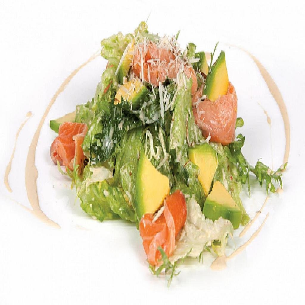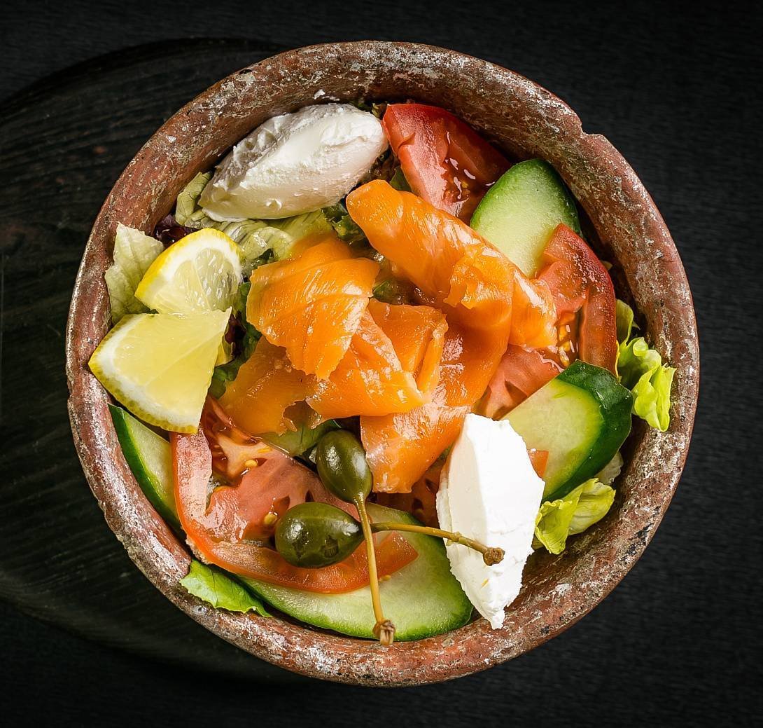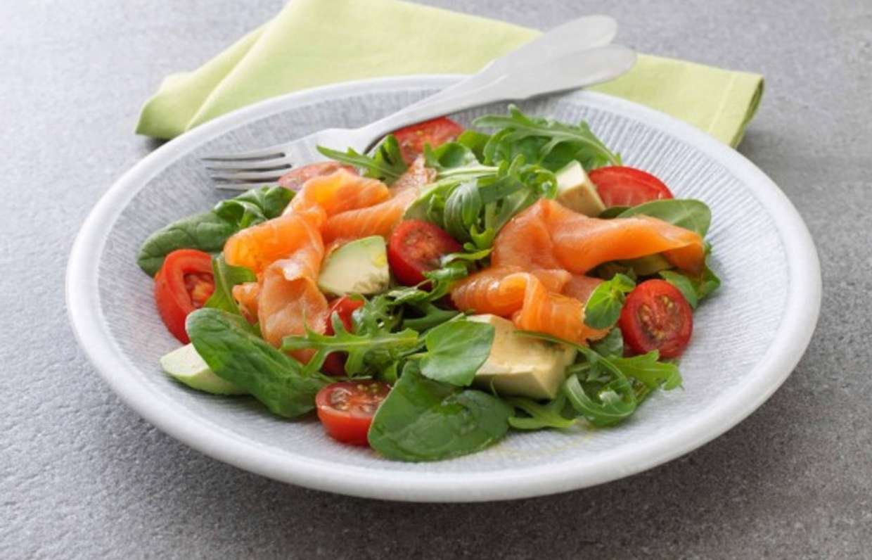 Салат с авокадо и красной рыбой и огурцом и яйцом