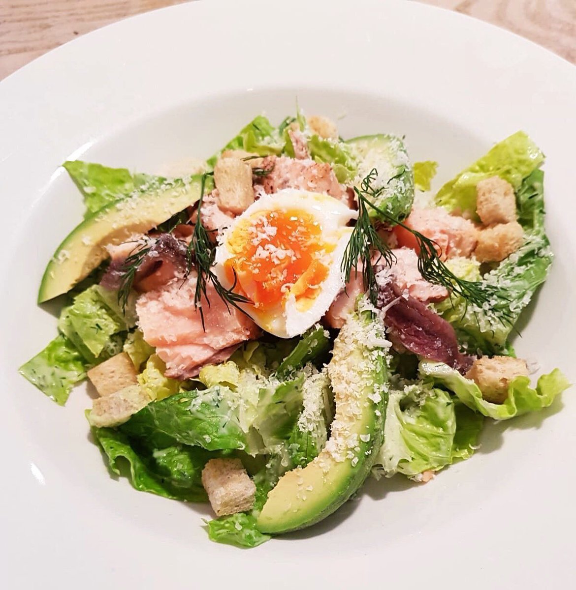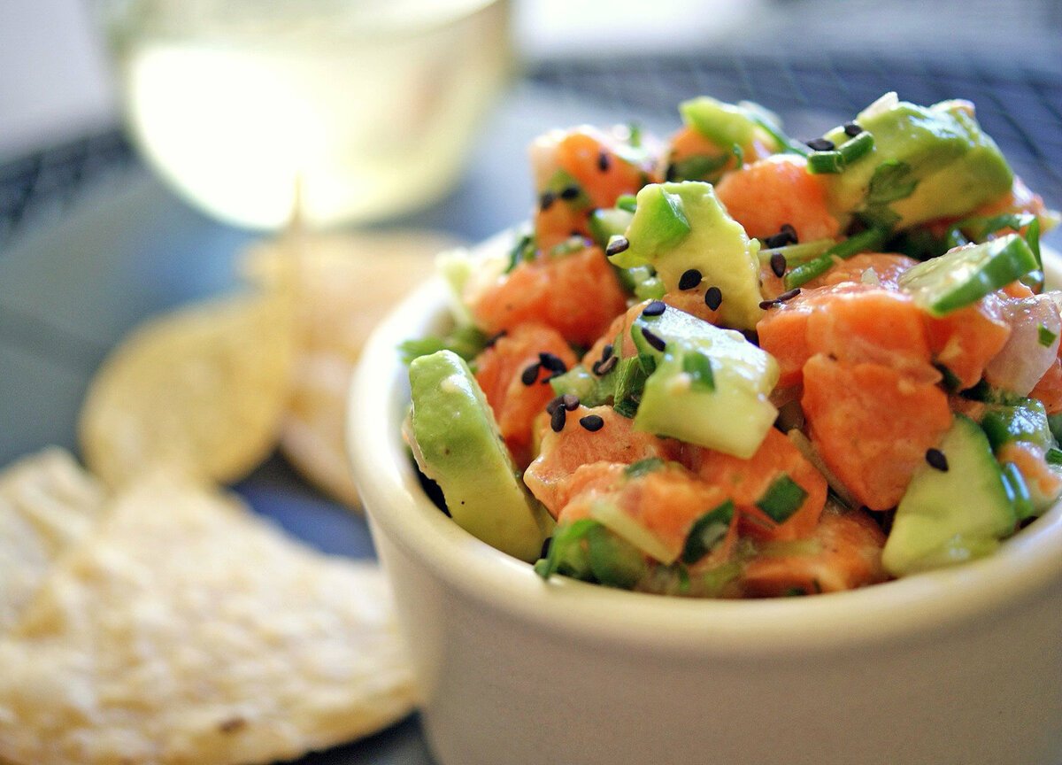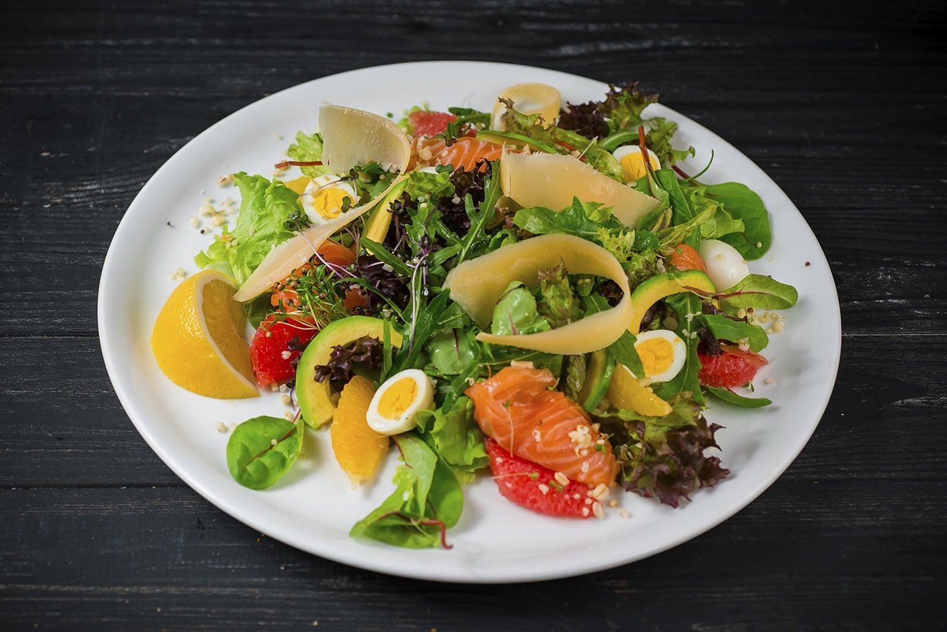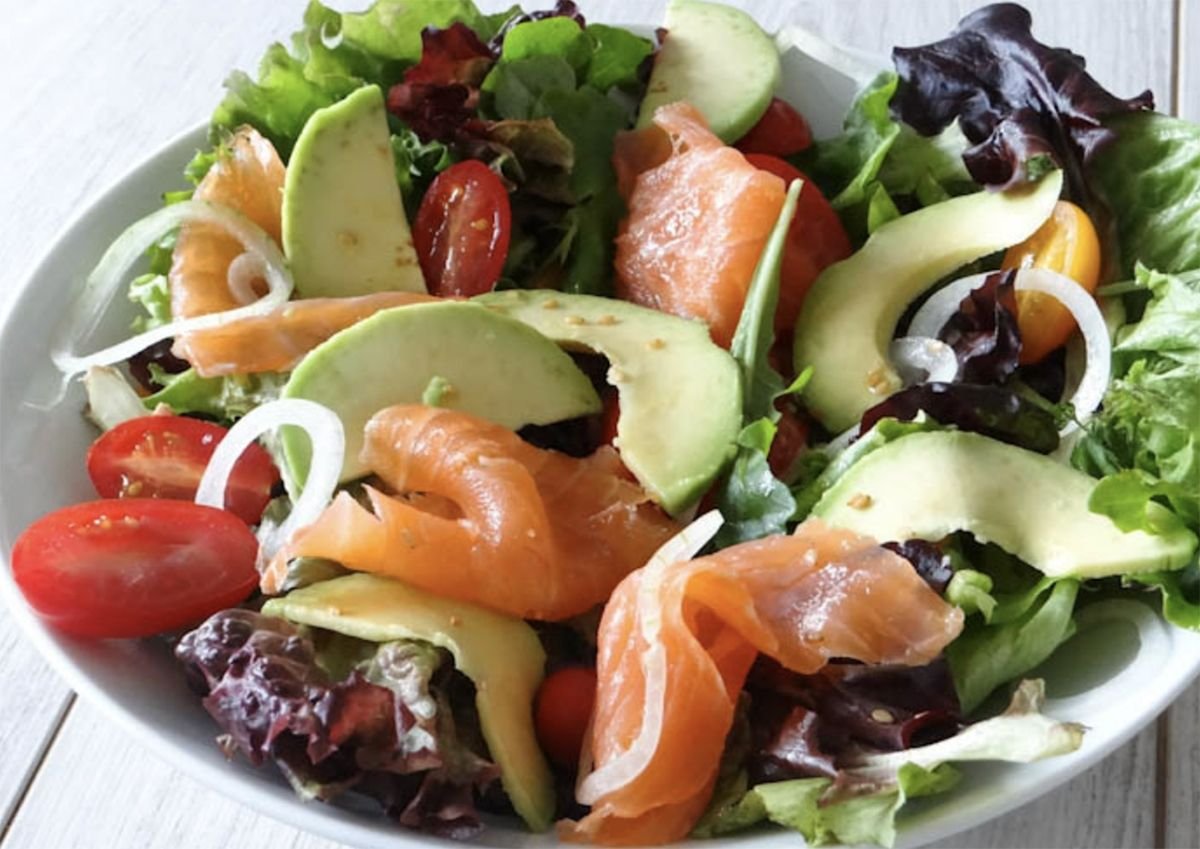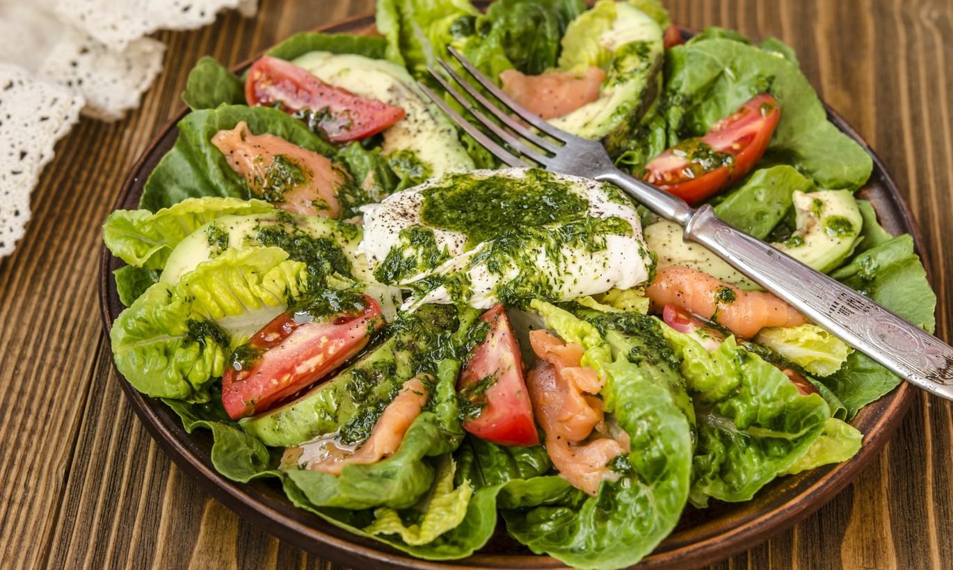 Салат с авокадо и красной рыбой и огурцом и яйцом