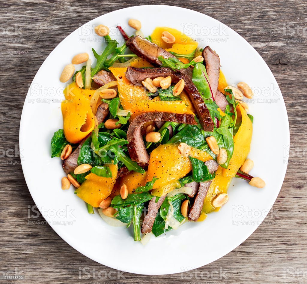 Салат с жареной говядиной и манго