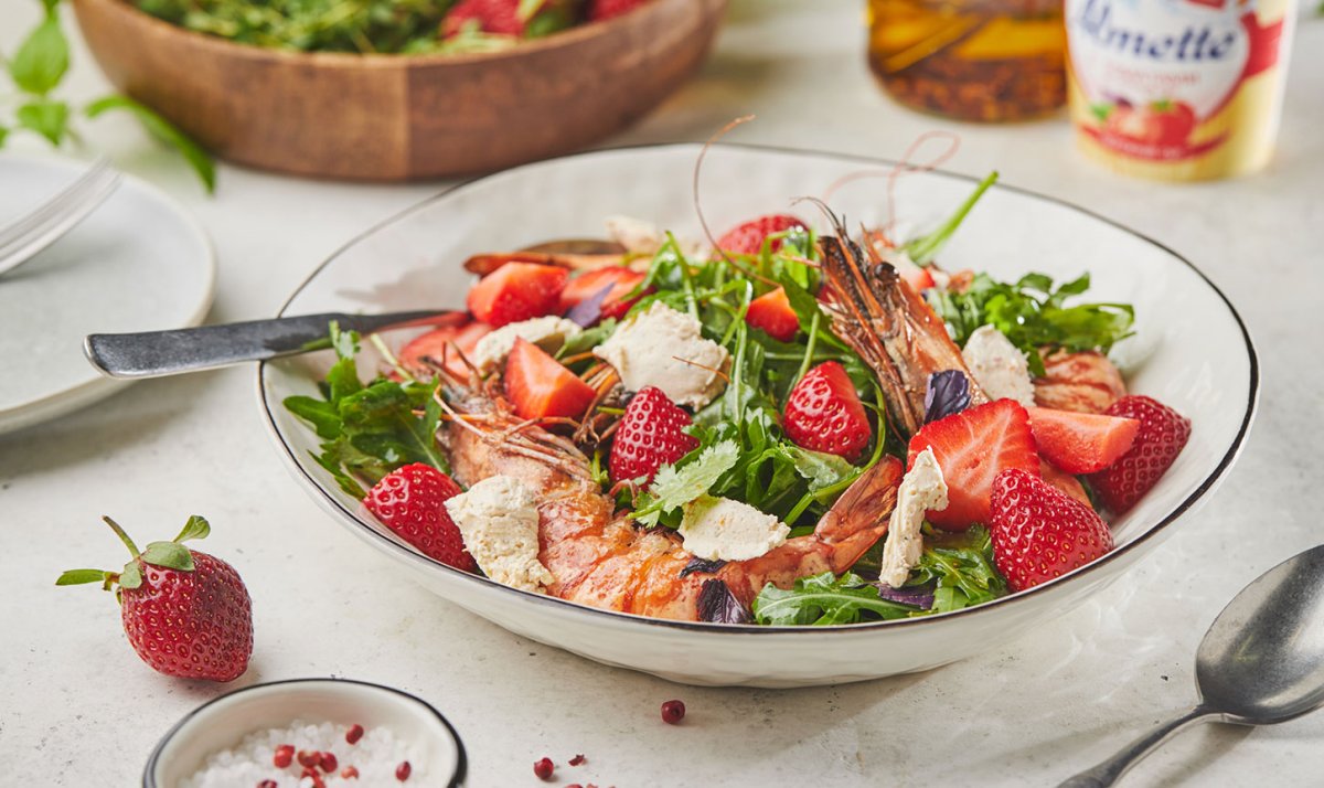 Салат креветки клубника руккола