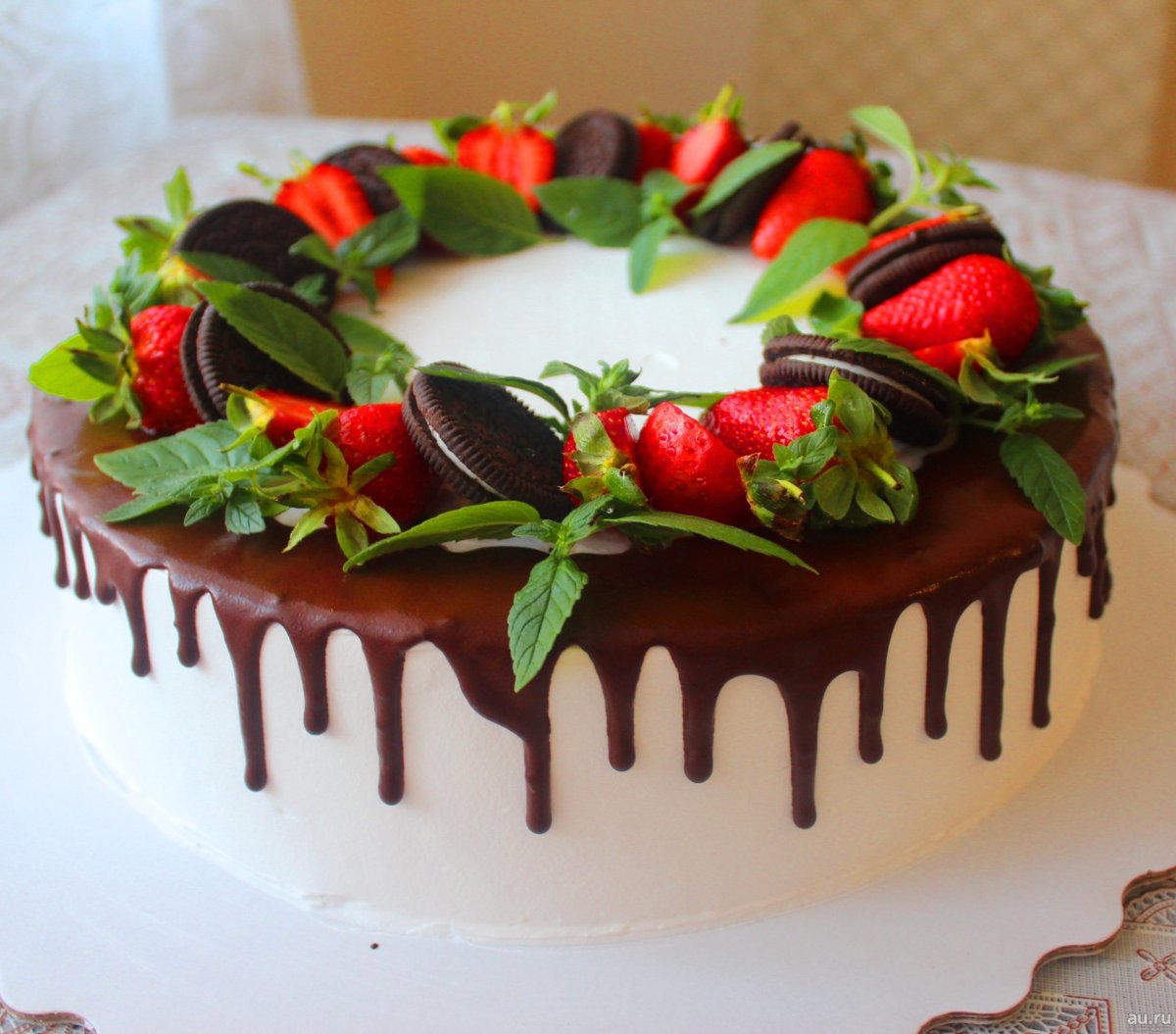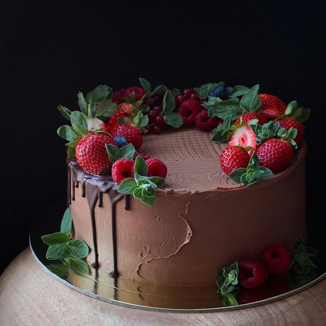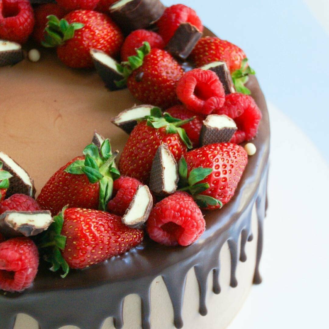 Украшение торта клубникой и шоколадом