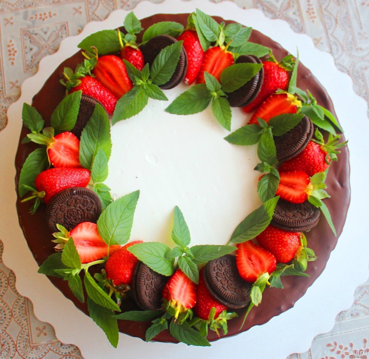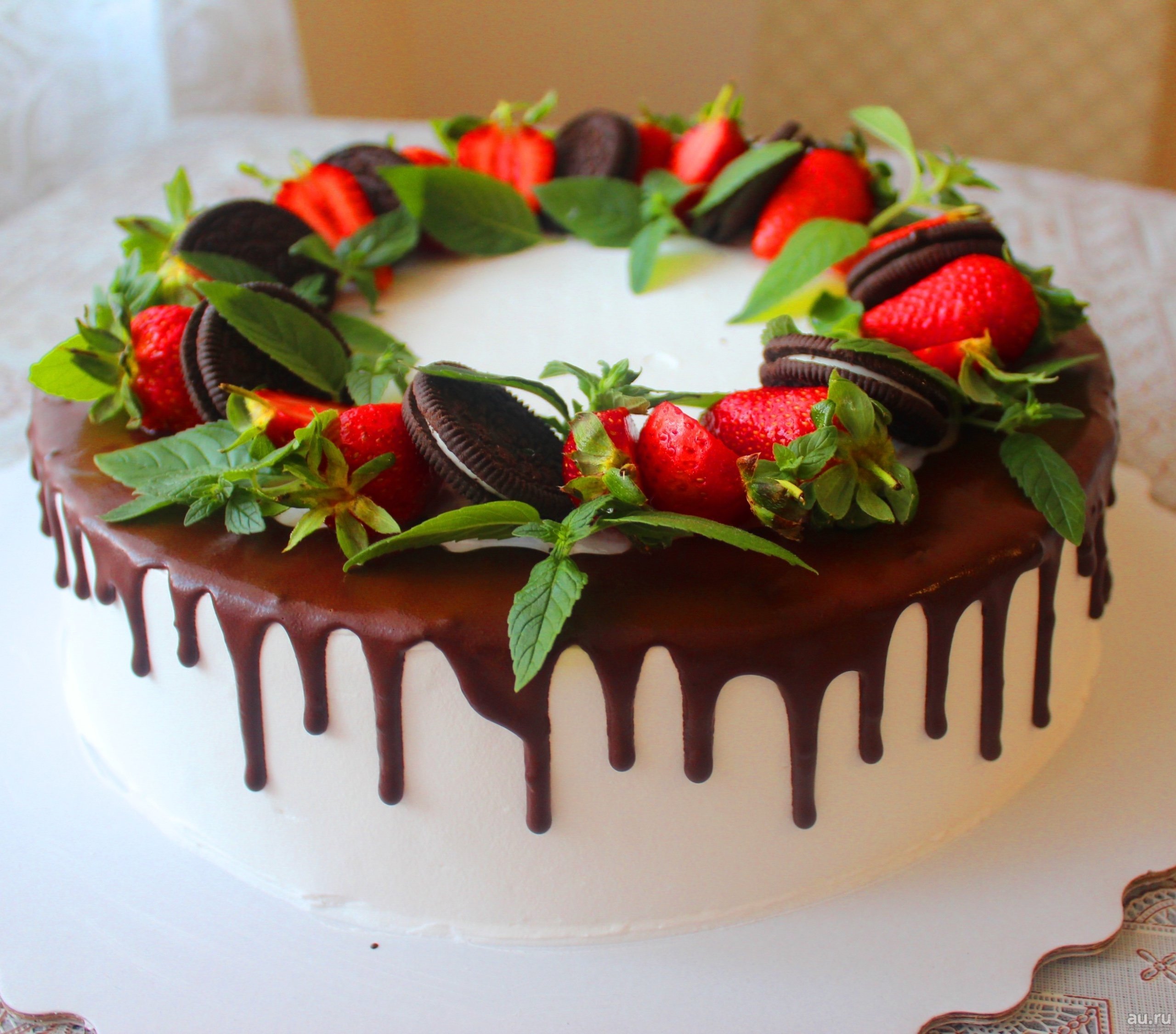 Украшение торта клубникой и мятой