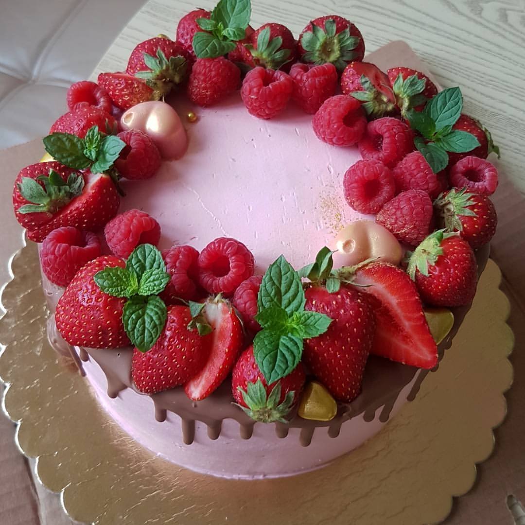 Украшение торта клубникой и малиной