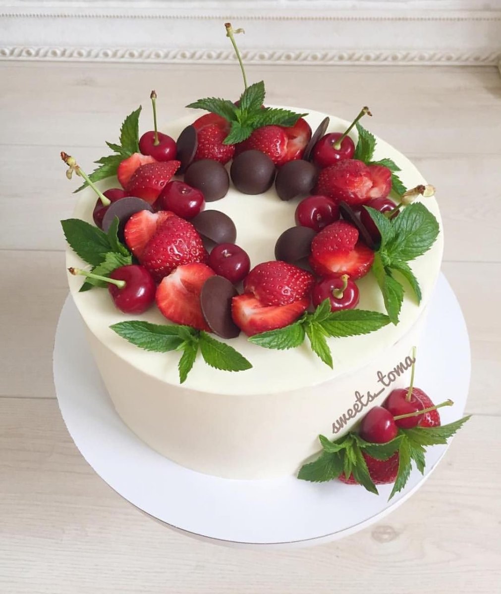 Украшение торта клубникой и черешней